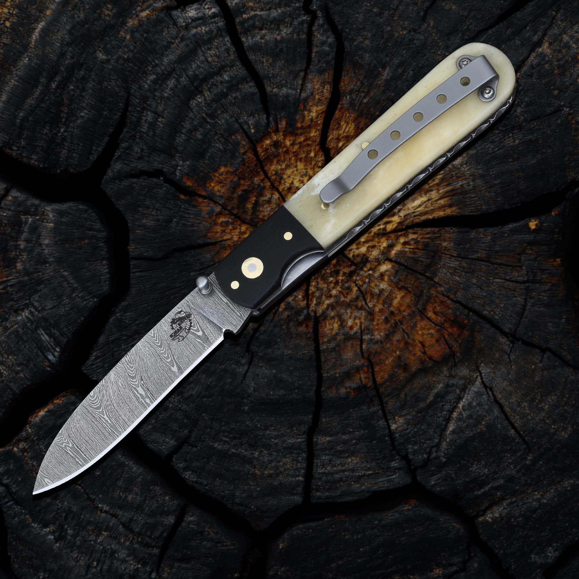 The Knives Ranch Reaper Damascus Folding Knife delivers precision, durability, and style in a compact design. Featuring a 3-1/4" Knives Ranch Exclusive Stainless steel blade, this folding knife offers unmatched strength and sharpness. The Cattle Shin Bone handle provides a distinctive look with a secure, comfortable grip, while the Stainless Steel bolster enhances durability and elegance.