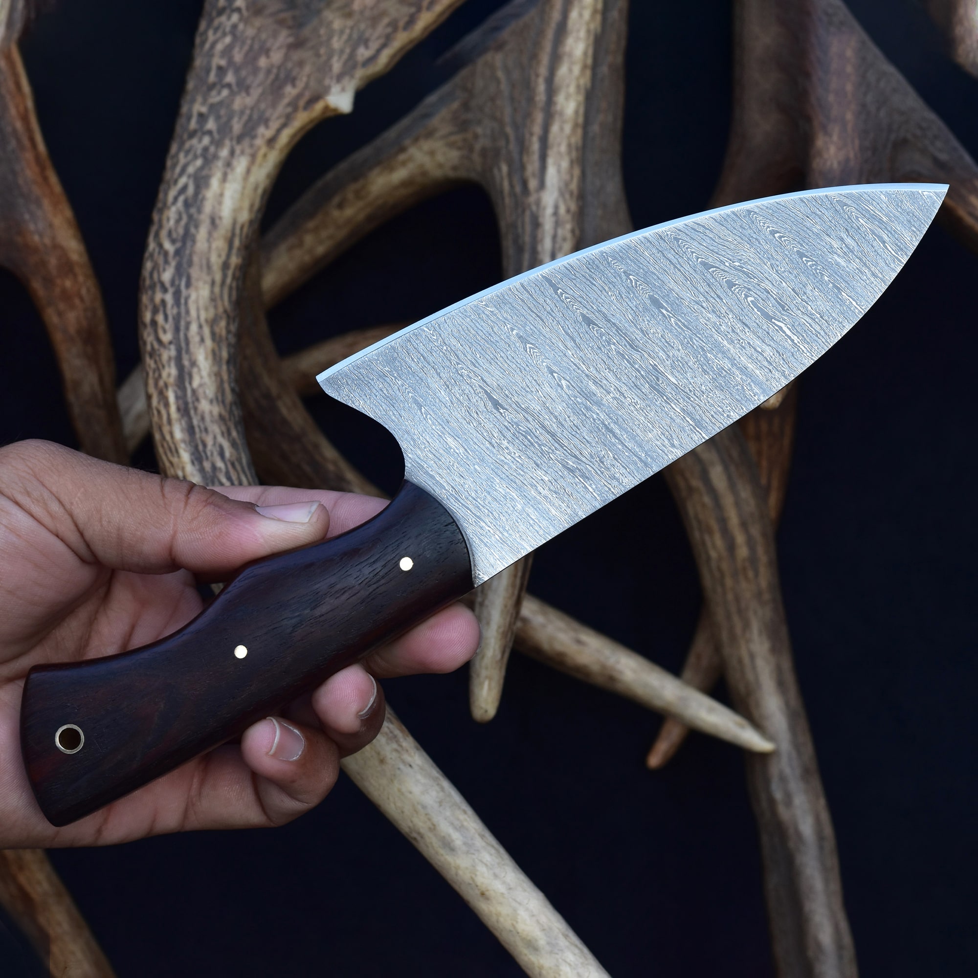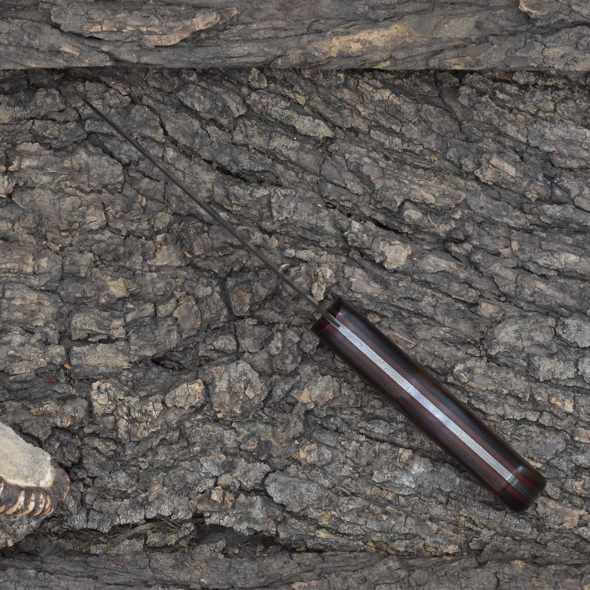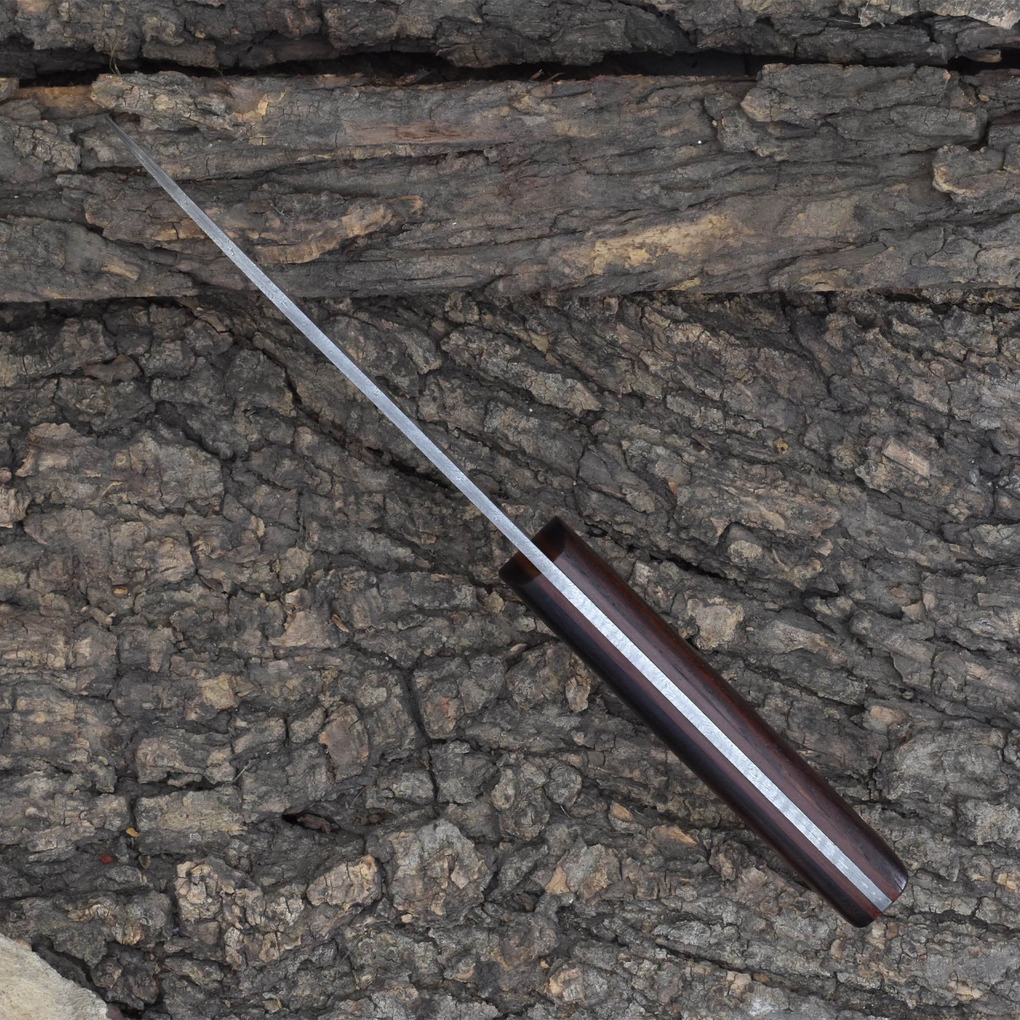 The handle is crafted from stabilized Rosewood with a fiber liner, offering both durability and ergonomic comfort. A vegetable-tanned leather sheath provides reliable protection and a touch of rustic style. This Damascus chef knife is more than just compact—it's built to be your go-to for quick, clean prep work. Add elegance and efficiency to your culinary arsenal with this small Damascus steel chef knife, and experience the edge control of a truly handcrafted Damascus kitchen blade.