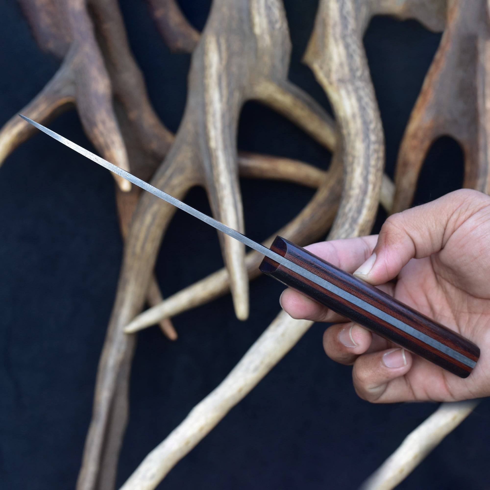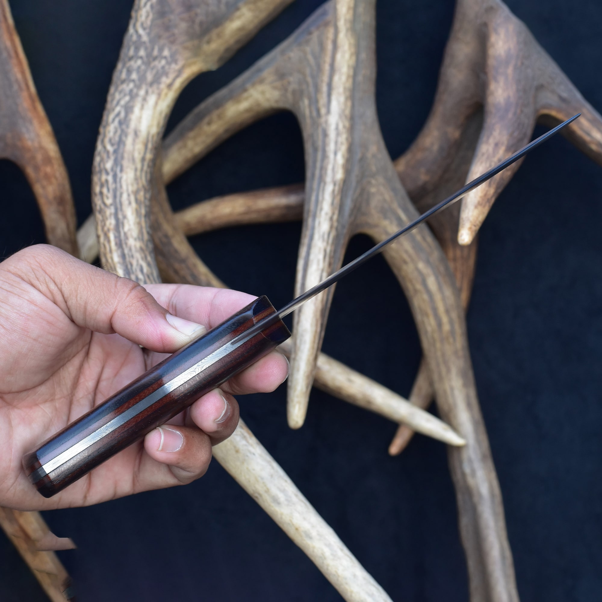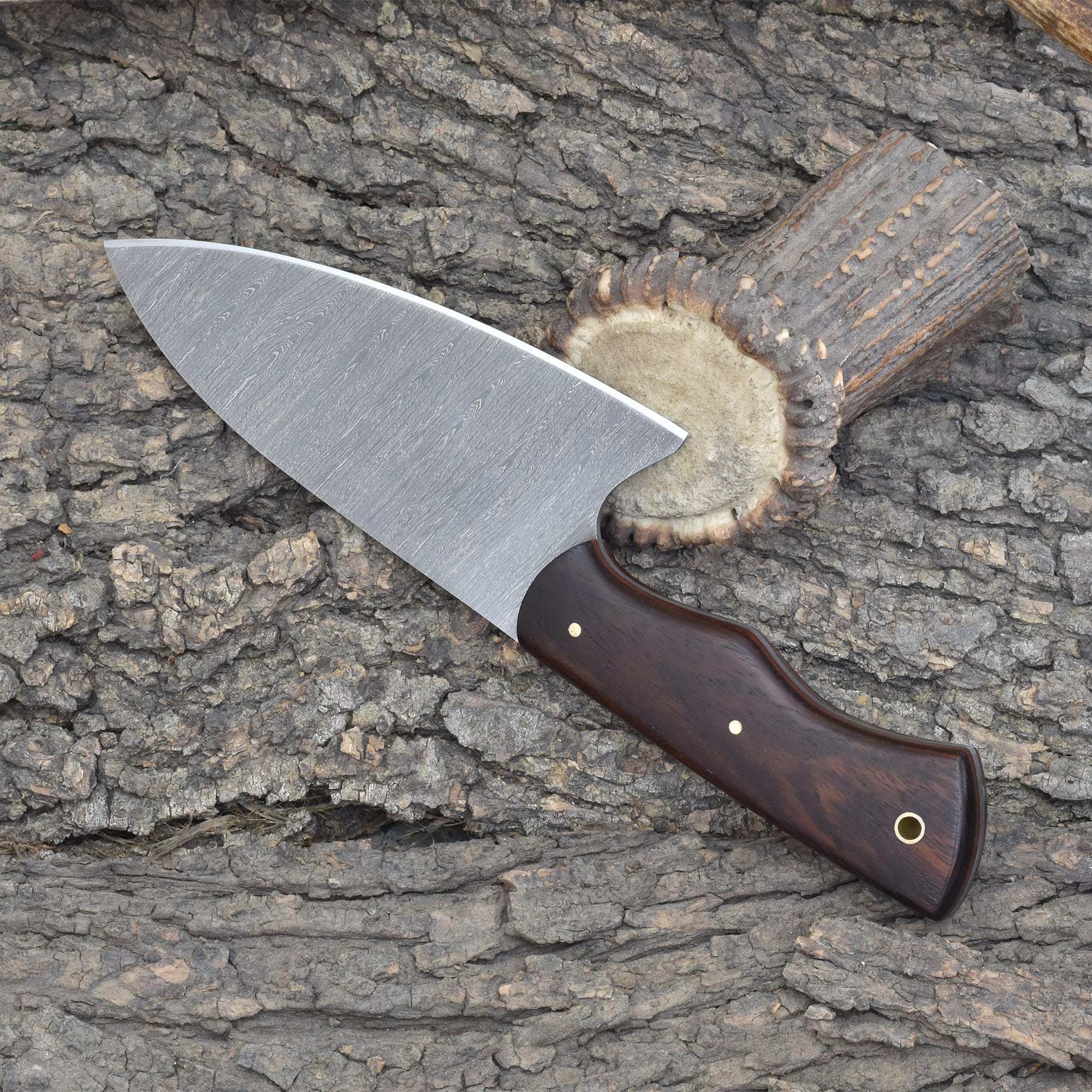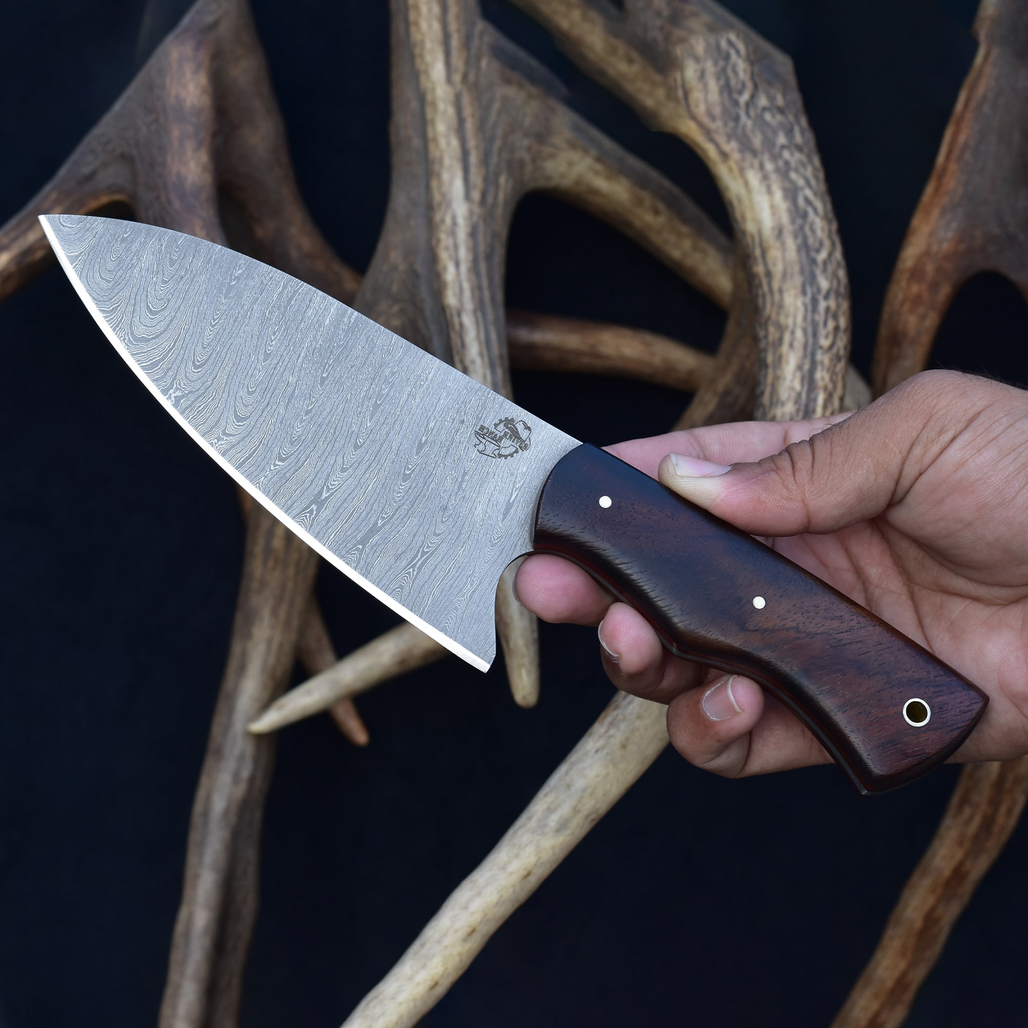 The handle is crafted from stabilized Rosewood with a fiber liner, offering both durability and ergonomic comfort. A vegetable-tanned leather sheath provides reliable protection and a touch of rustic style. This Damascus chef knife is more than just compact—it's built to be your go-to for quick, clean prep work. Add elegance and efficiency to your culinary arsenal with this small Damascus steel chef knife, and experience the edge control of a truly handcrafted Damascus kitchen blade.