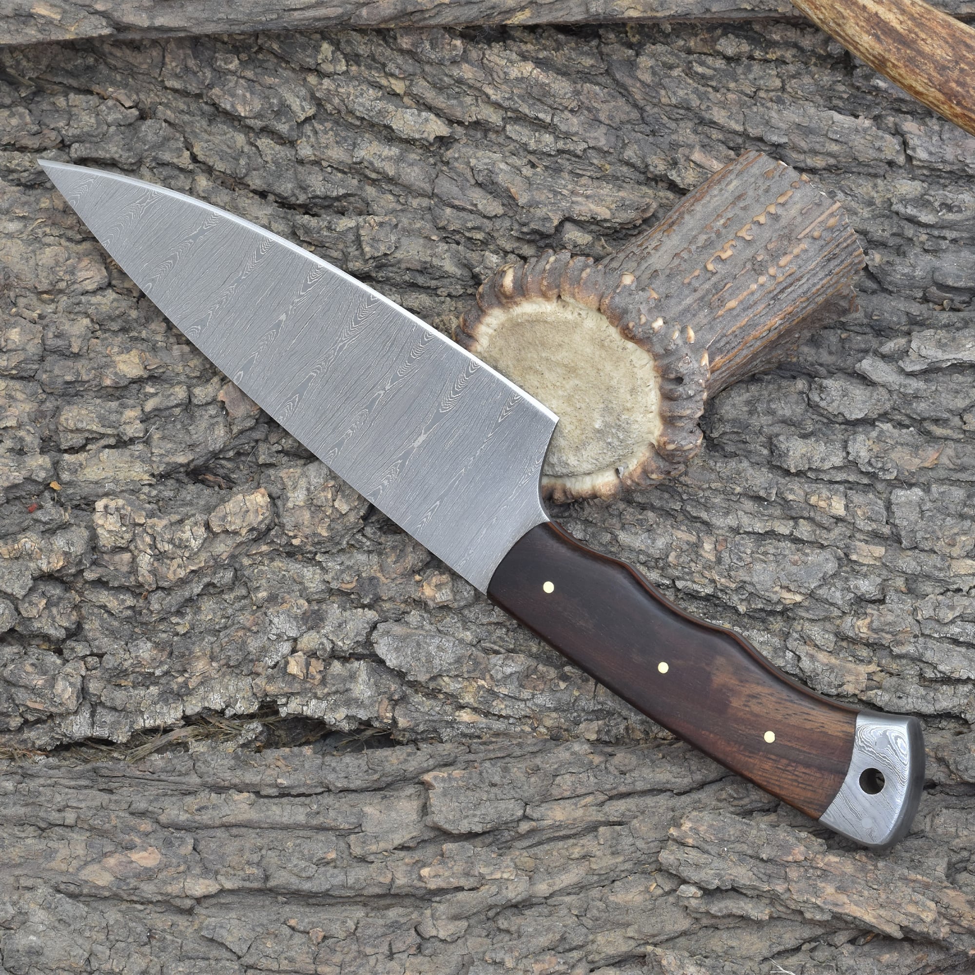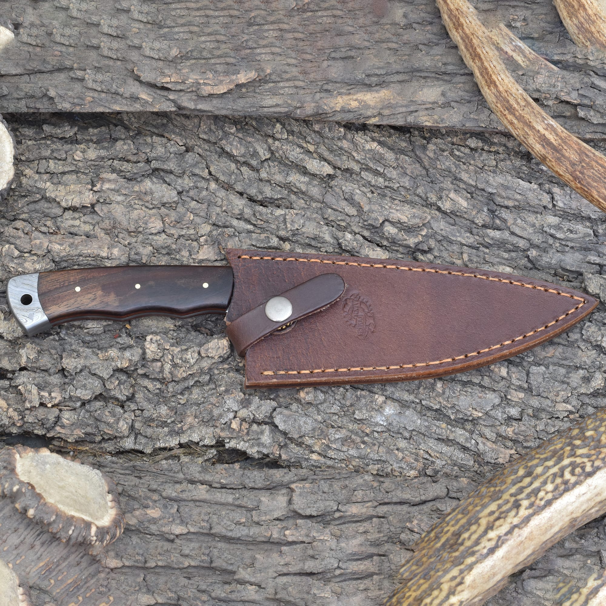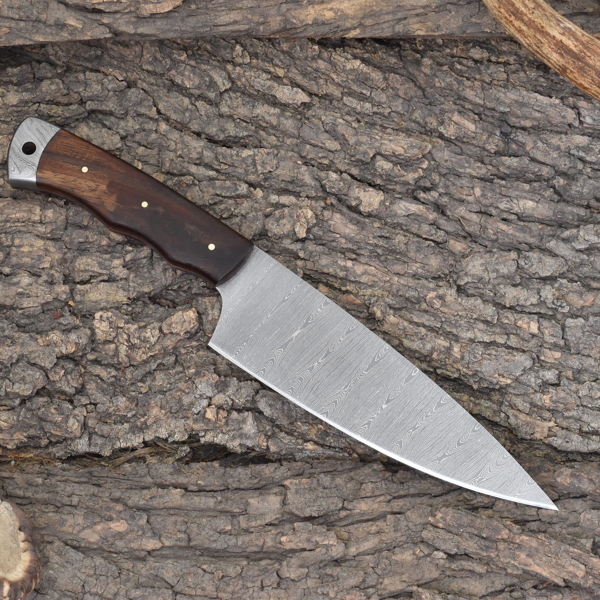 Designed for those who value control without sacrificing strength, the Knives Ranch Damascus Chef Knife is your everyday essential for refined culinary execution. Forged from premium Damascus steel, this blade offers precision and power in equal measure. The stabilized Rosewood handle provides a warm, traditional feel with exceptional durability and grip. Housed in a premium cowhide sheath with a vertical belt loop, it’s protected and ready for daily use—whether in the kitchen or on the go.