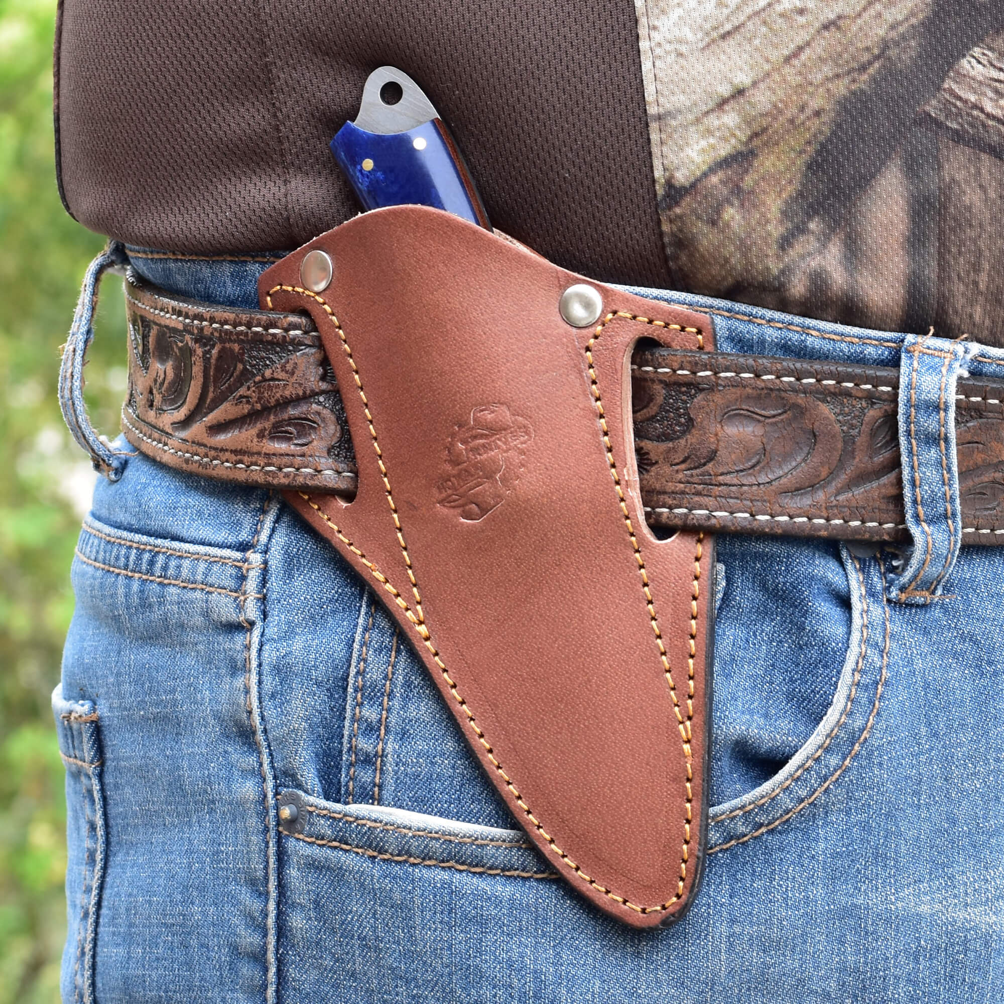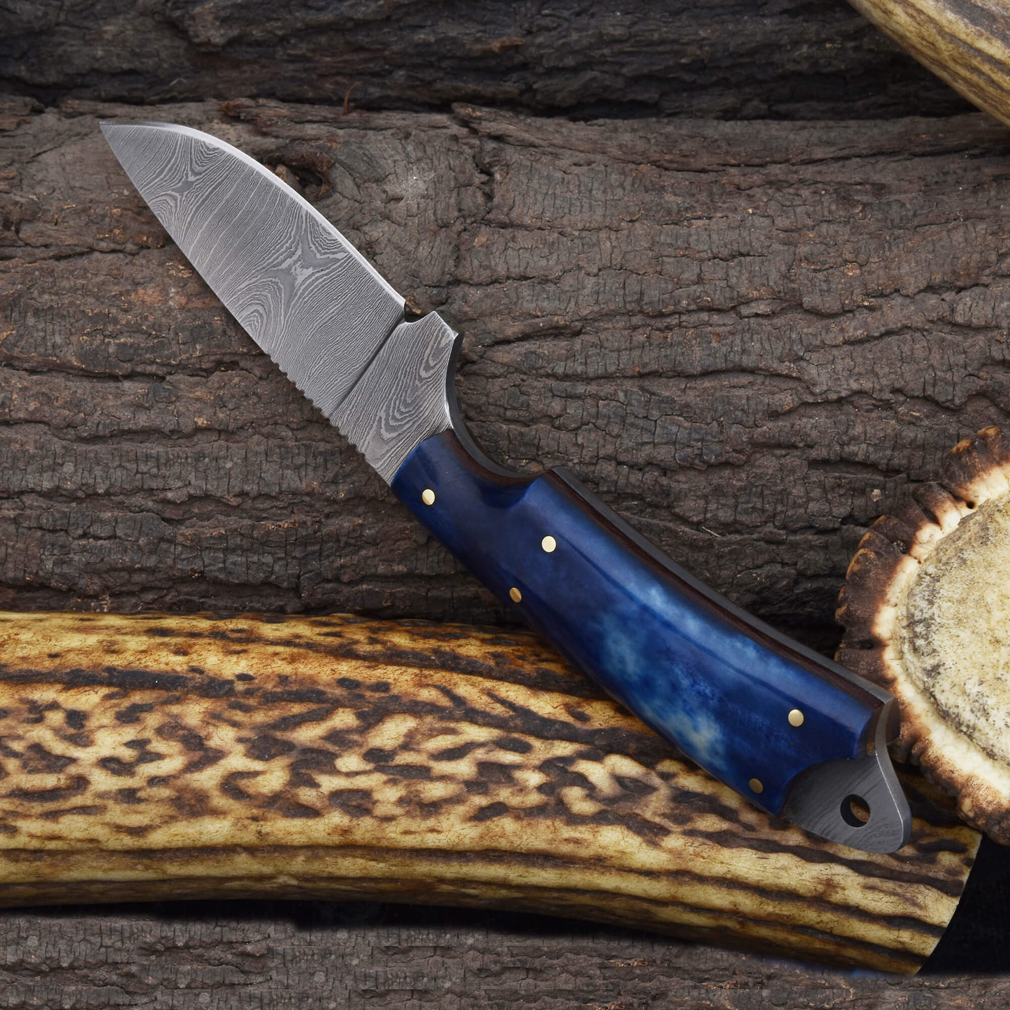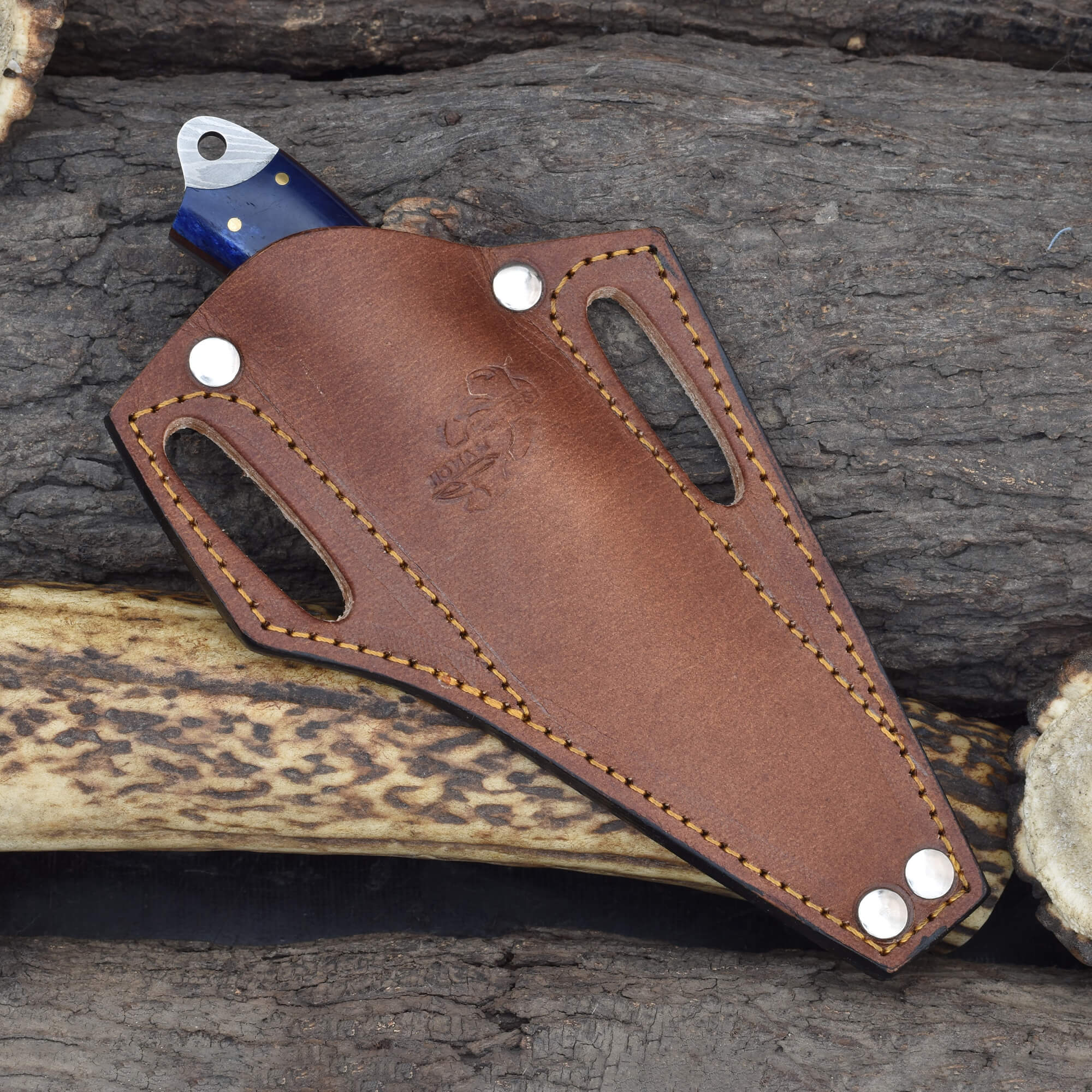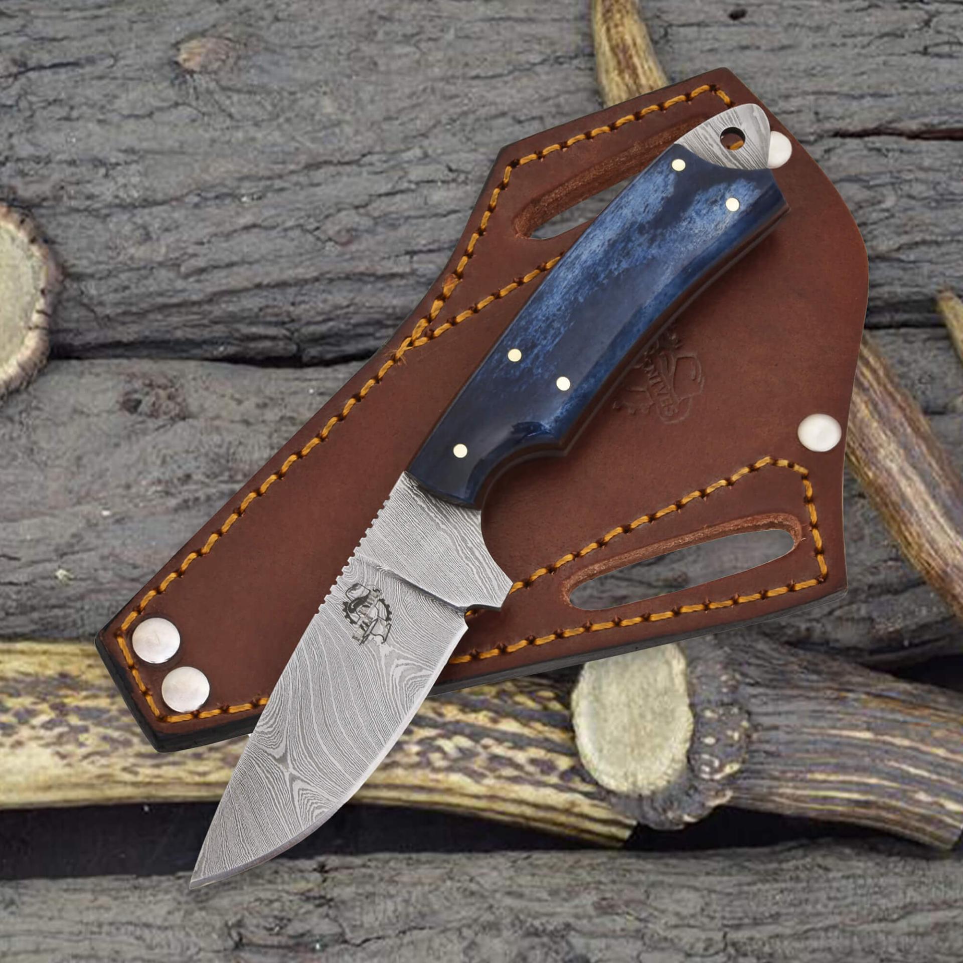 Compact, bold, and built for precision—this Knives Ranch Damascus Knife is the perfect fusion of artistry and function. Forged from premium Damascus steel, it’s ideal for hunters, collectors, and craftsmen seeking a reliable everyday carry blade. The stunning dyed cattle bone handle with fiber liners adds a touch of uniqueness and grip comfort.
