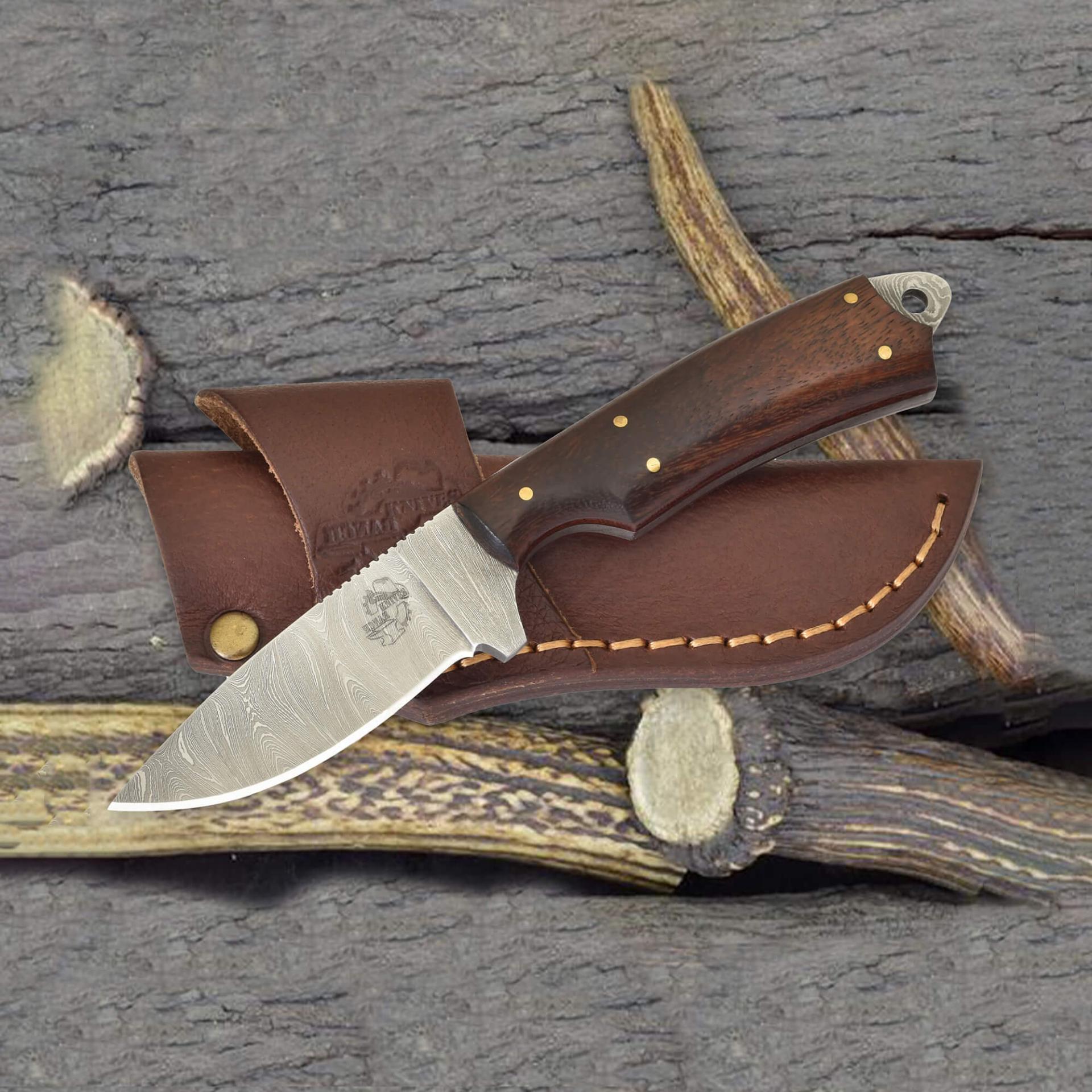 Discover dependable performance and classic beauty in the Knives Ranch Damascus Steel Hunting Knife. Designed with precision and durability in mind, this compact blade is forged from Knives Ranch Damascus Steel for outstanding sharpness, strength, and edge retention. Its stabilized rosewood handle with fiber liner offers a warm, secure grip for hunters, outdoorsmen, and collectors alike.
