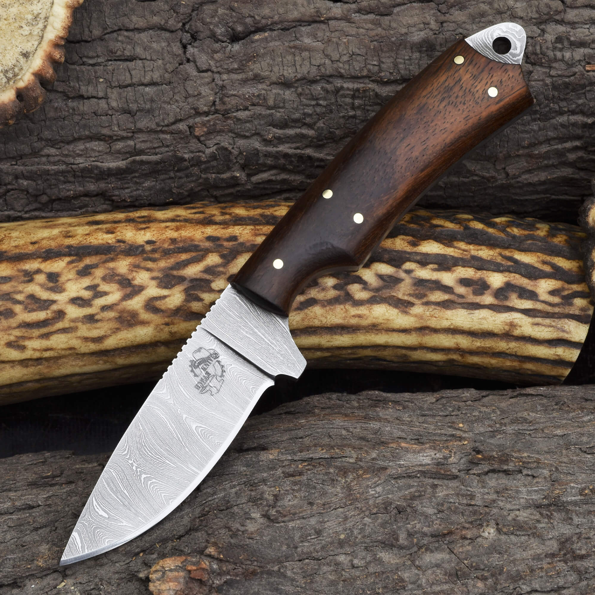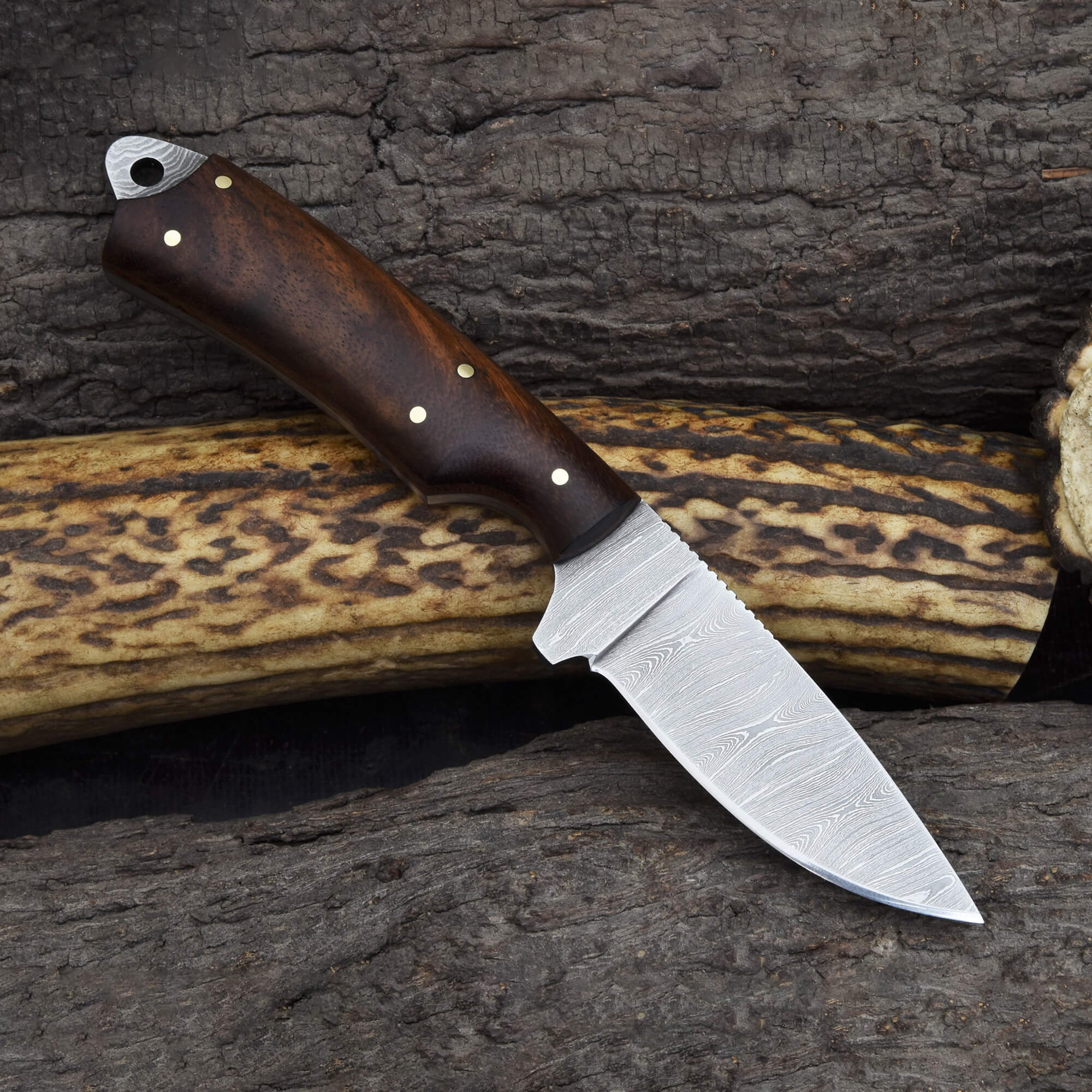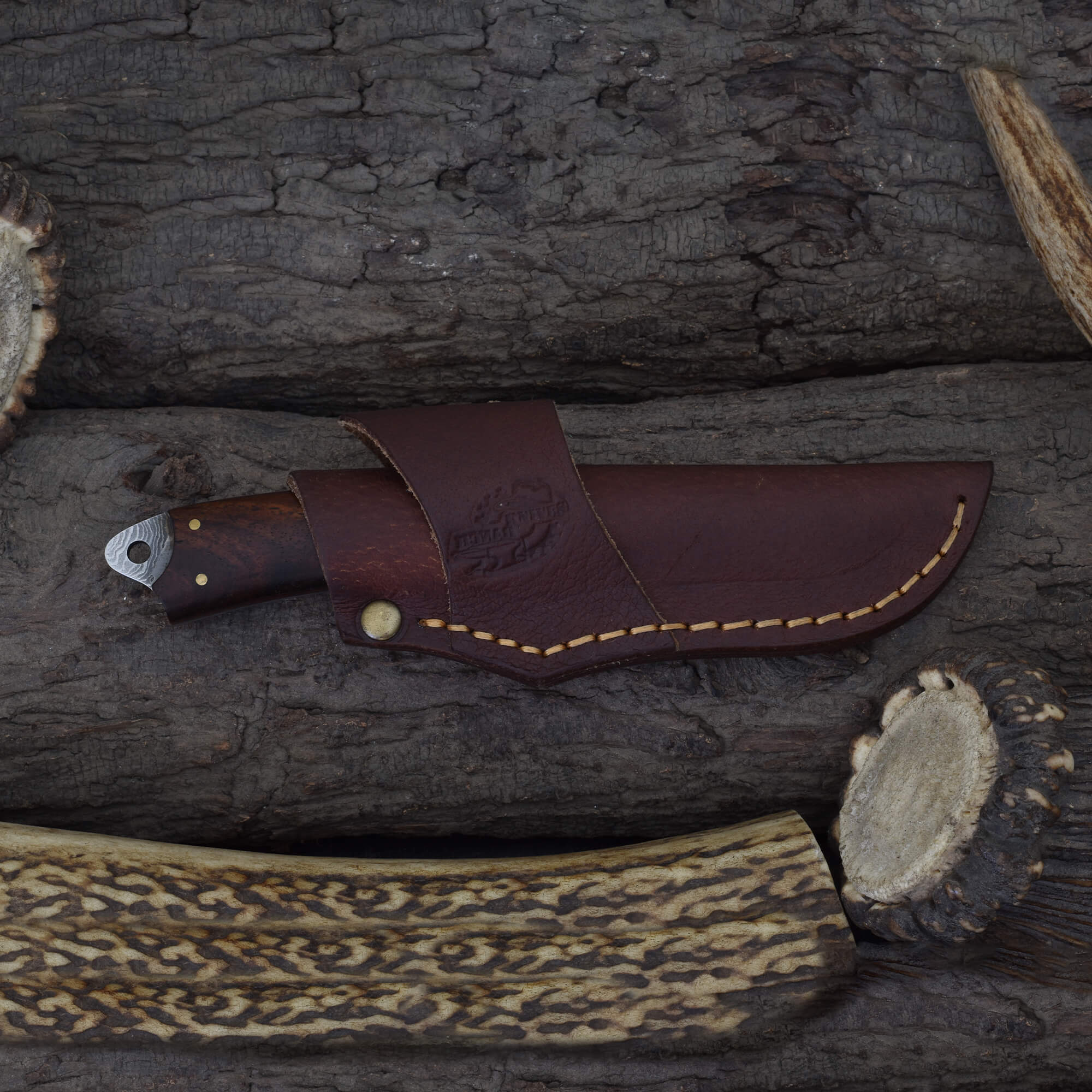Combining rugged utility with elegant materials, this rosewood handle Damascus hunting knife comes with a premium cowhide sheath for angled belt carry. A trusted choice for everyday fieldwork or wilderness adventures, the compact Damascus fixed blade knife is built to last. For those seeking heritage, performance, and style, this handmade Damascus knife with a wood handle is a perfect match.