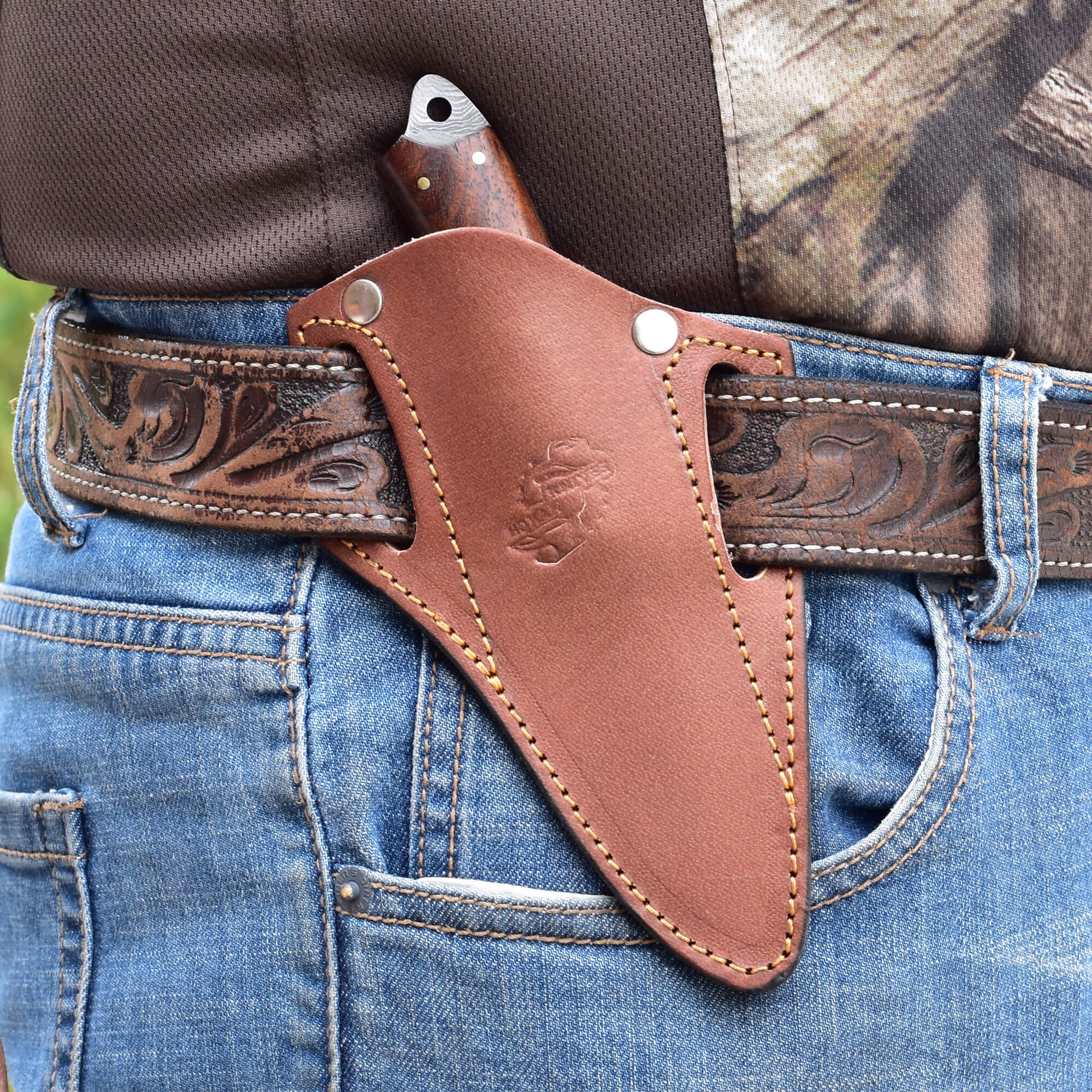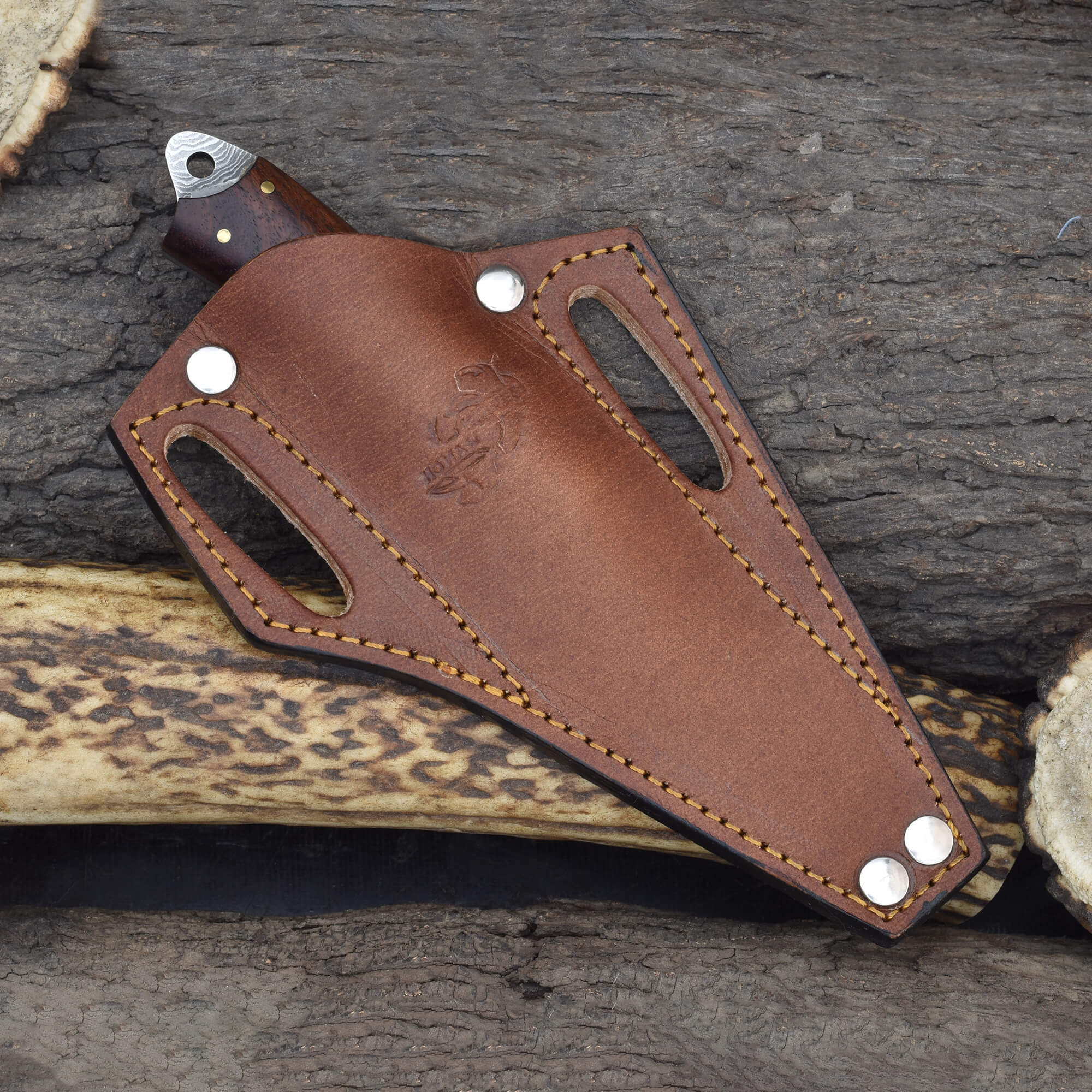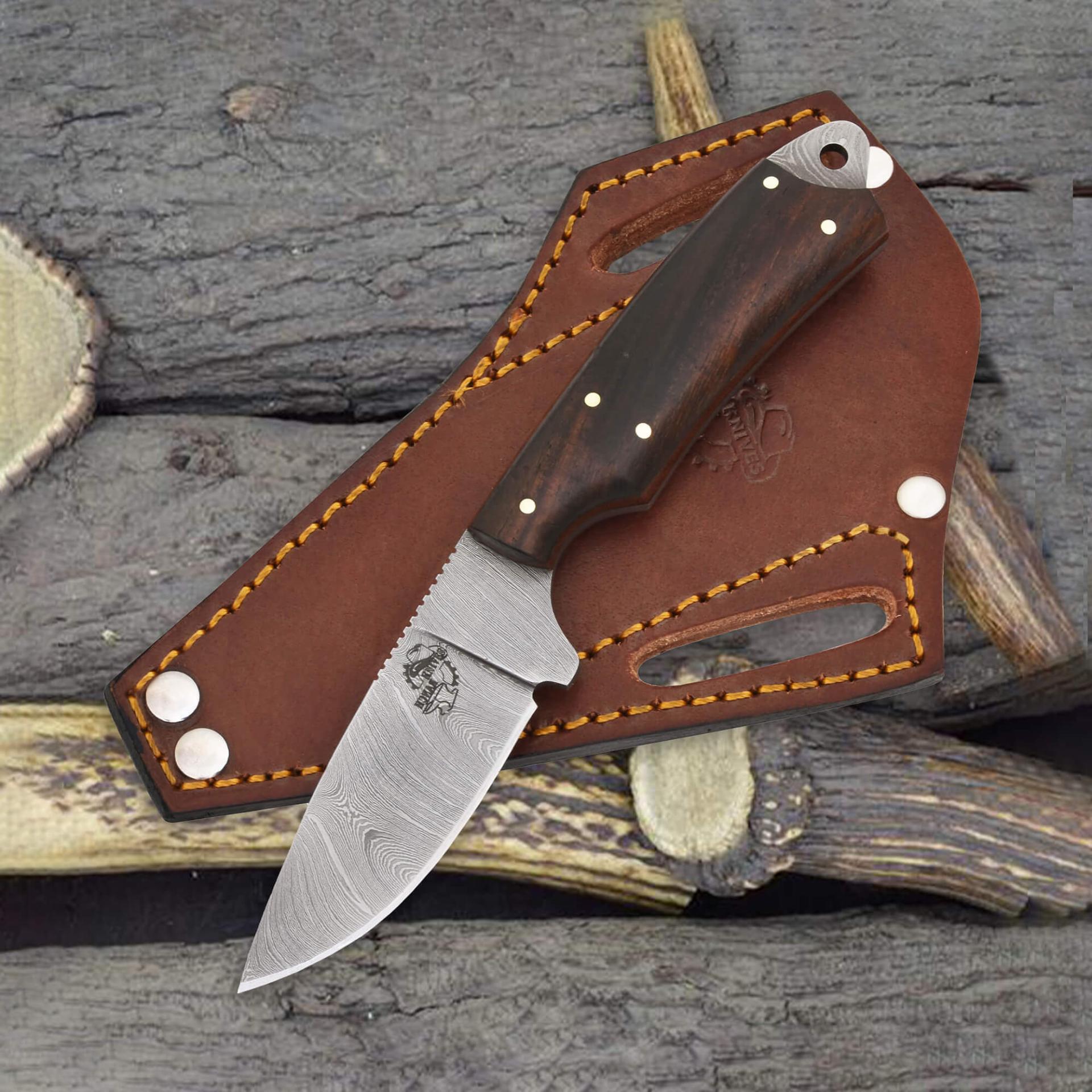 Combining rugged utility with elegant materials, this rosewood handle Damascus hunting knife comes with a premium cowhide sheath for angled belt carry. A trusted choice for everyday fieldwork or wilderness adventures, the compact Damascus fixed blade knife is built to last. For those seeking heritage, performance, and style, this handmade Damascus knife with a wood handle is a perfect match.