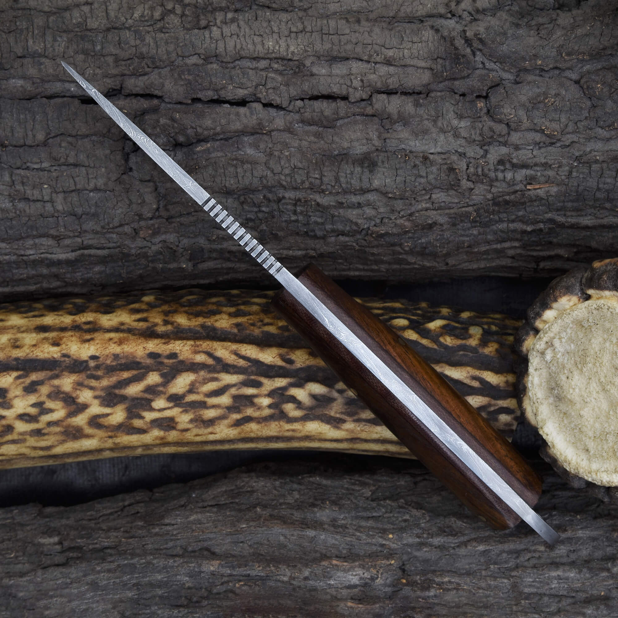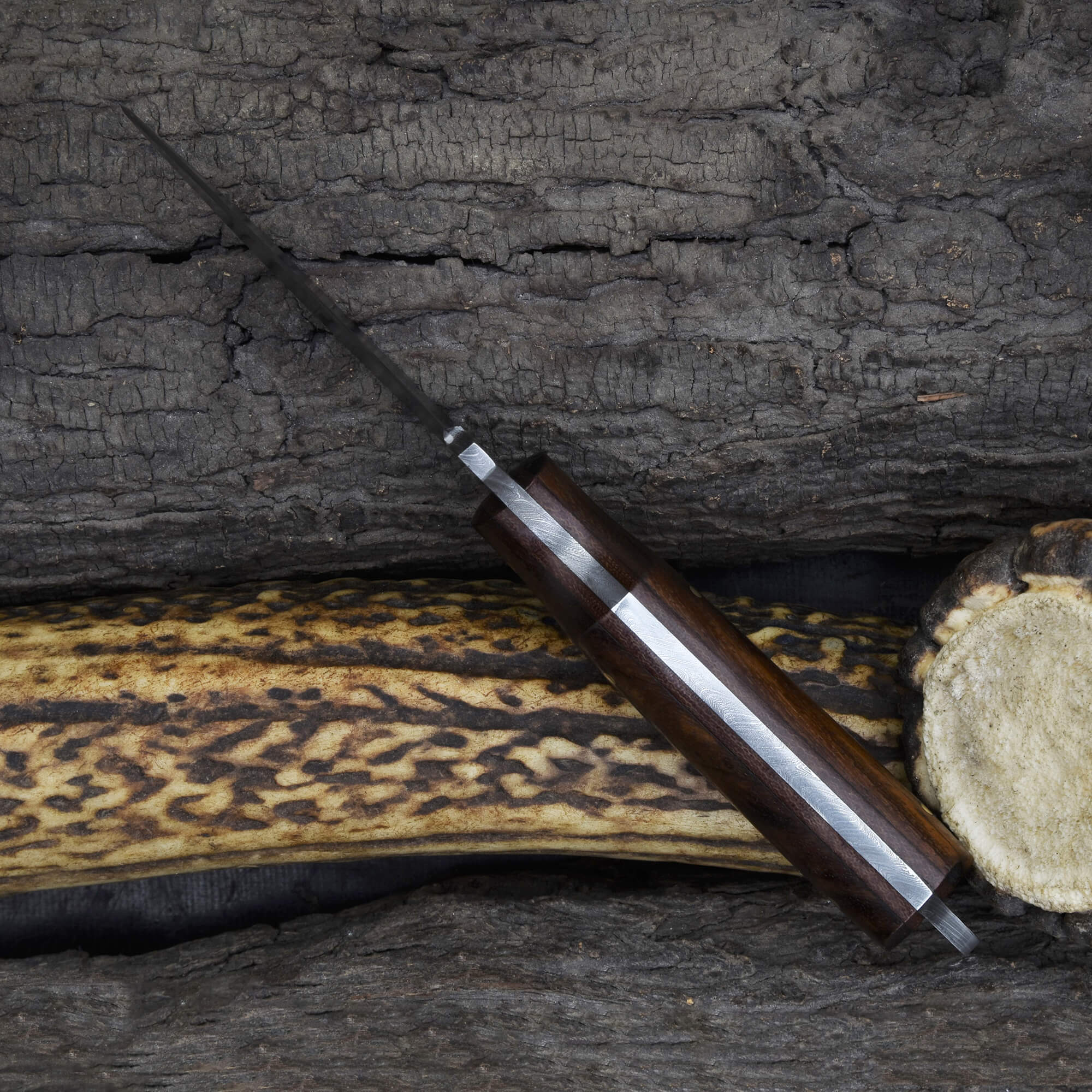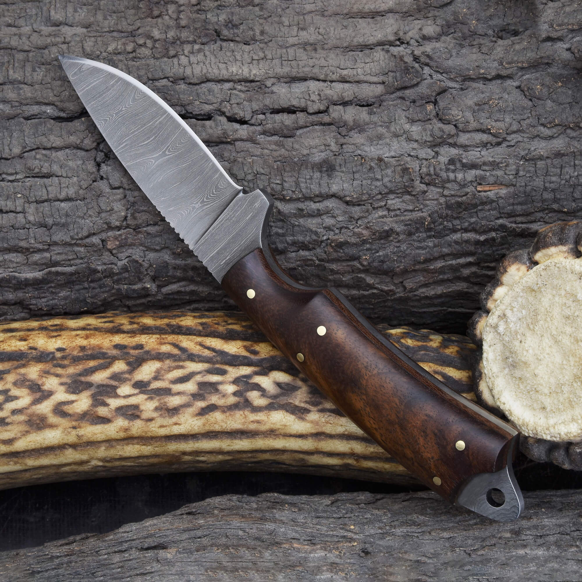 Discover dependable performance and classic beauty in the Knives Ranch Damascus Steel Hunting Knife. Designed with precision and durability in mind, this compact blade is forged from Knives Ranch Damascus Steel for outstanding sharpness, strength, and edge retention. Its stabilized rosewood handle with fiber liner offers a warm, secure grip for hunters, outdoorsmen, and collectors alike.