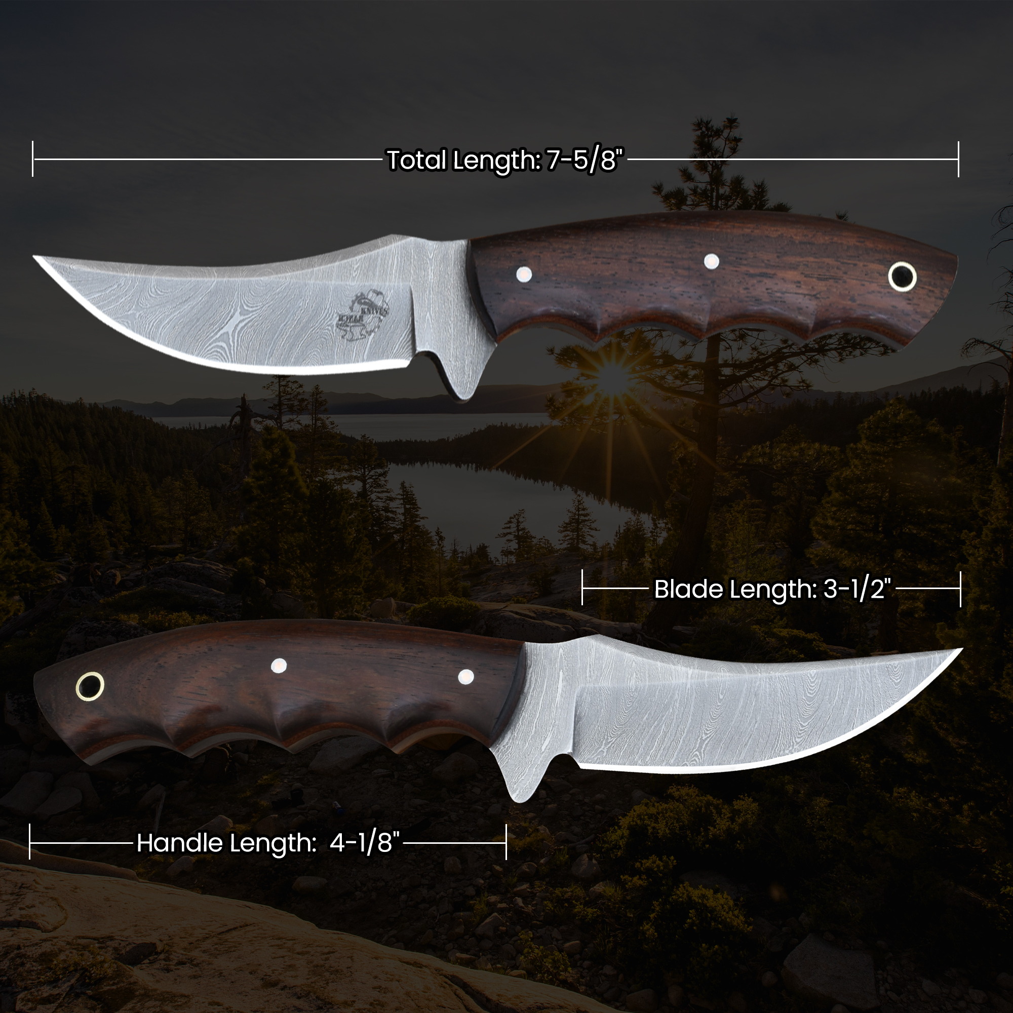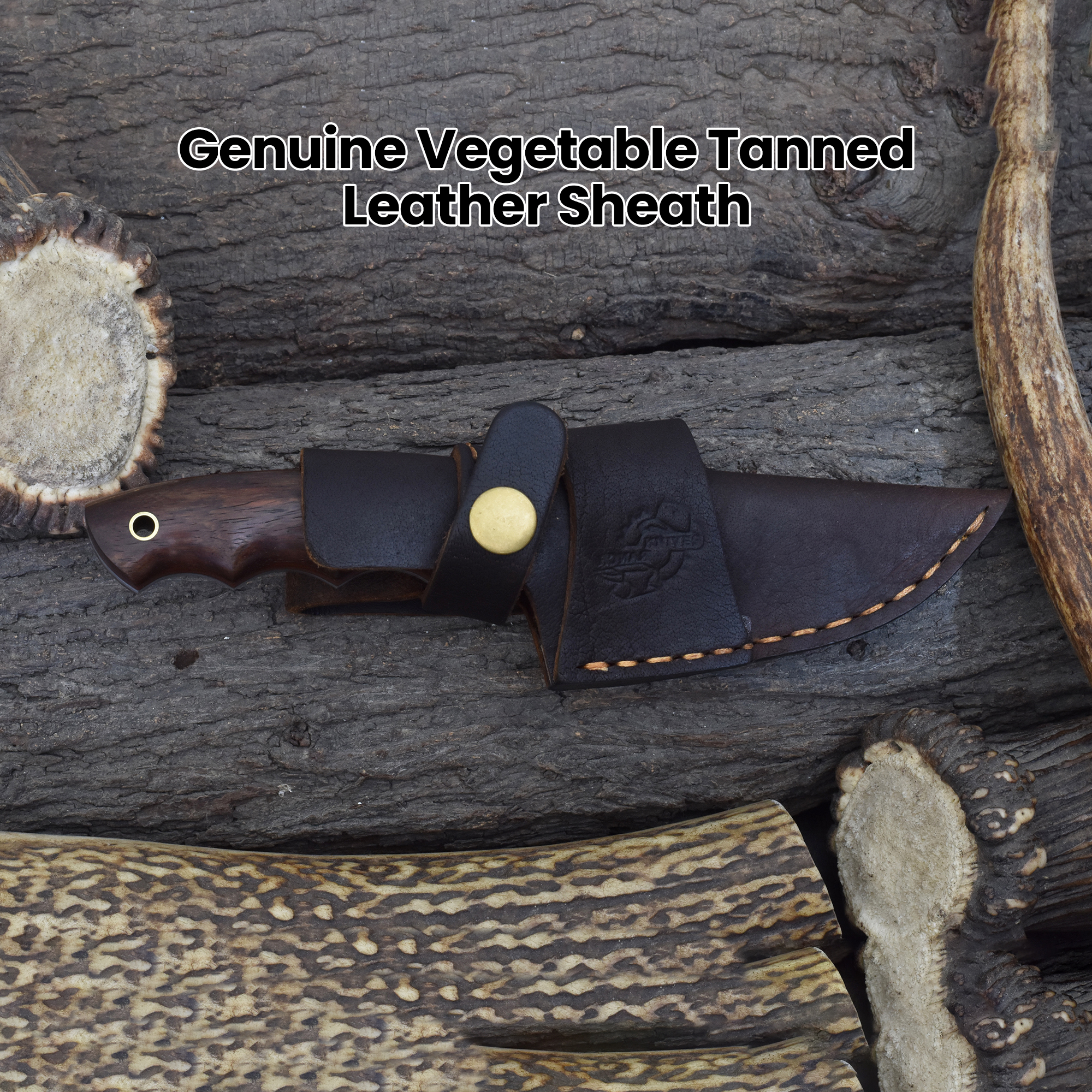 Expertly forged with a blade crafted from high-quality Damascus Steel, this Knives Ranch knife combines sharpness and strength for tough tasks. The stabilized rosewood handle, featuring fiber liners, offers a comfortable and durable grip with a rich, natural beauty. Equipped with a vegetable-tanned leather sheath featuring dual carry options—vertical and horizontal loops—this knife is ready for any adventure or everyday use.