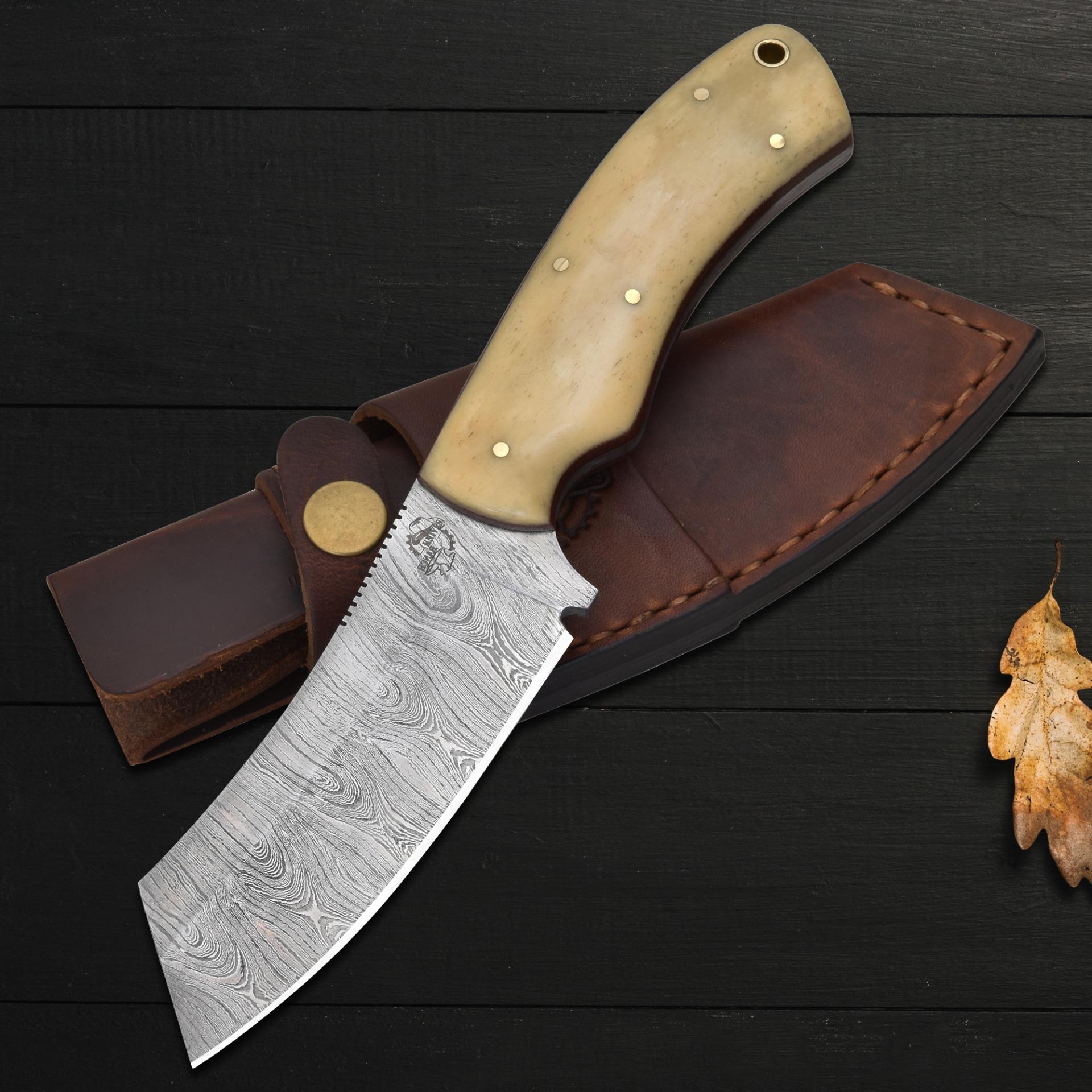 The Knives Ranch Damascus Tanto Hunting Knife is built for precision, durability, and style. Featuring a 4-1/4" Blade (with a 3-7/8" Cutting Edge) of Hammer-forged Damascus Steel (5160/4340), it offers exceptional sharpness, edge retention, and the striking layered patterns that make Damascus legendary. The handle, crafted from Cattle Bone with a Brown Fiber Liner, provides a secure, comfortable grip with a classic look. Designed without a bolster for a clean, streamlined profile, this knife comes with a handcrafted vegetable-tanned leather sheath that offers both horizontal and vertical belt loop carry options—perfect for versatility in the field.