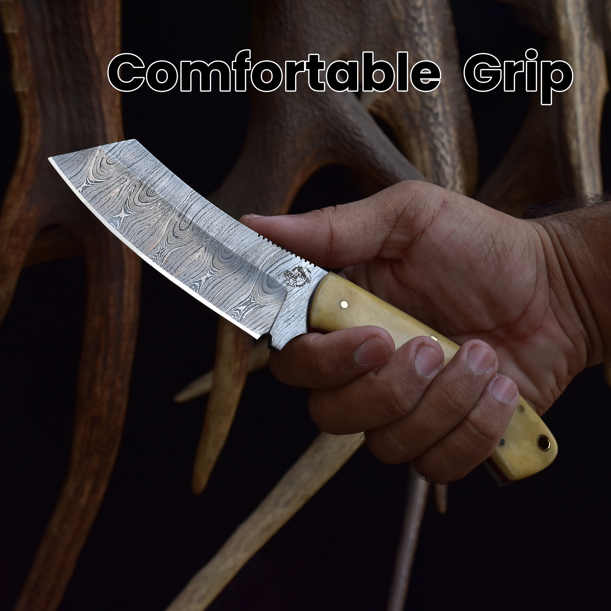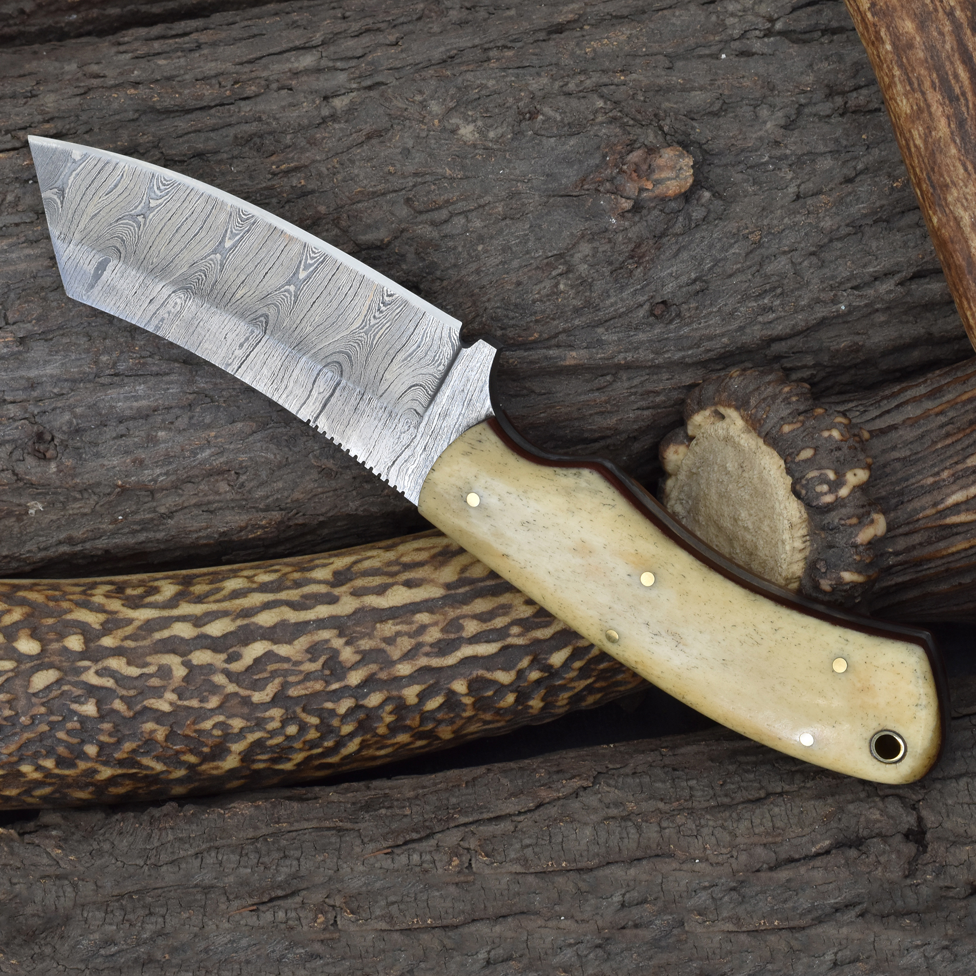 Take on the hunt with the Knives Ranch Damascus Tanto, rugged, reliable, and crafted for performance.