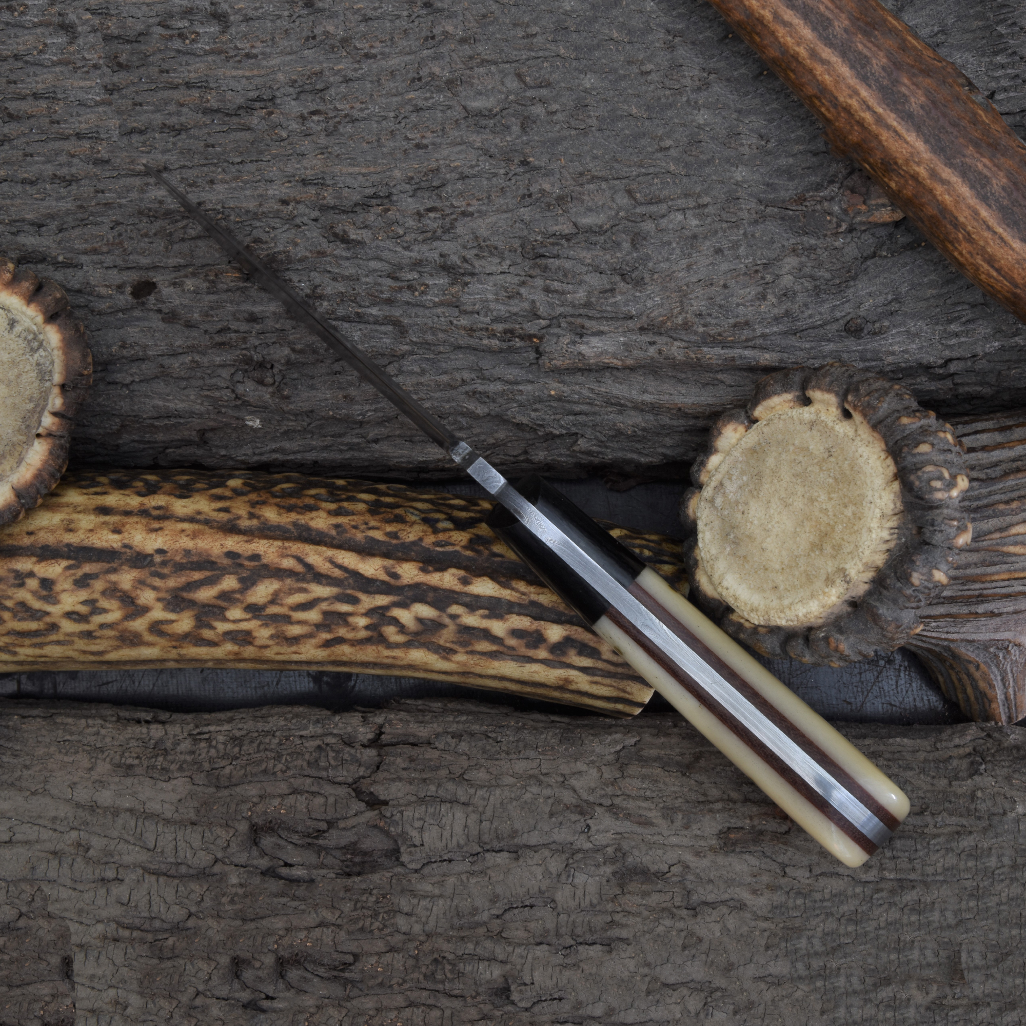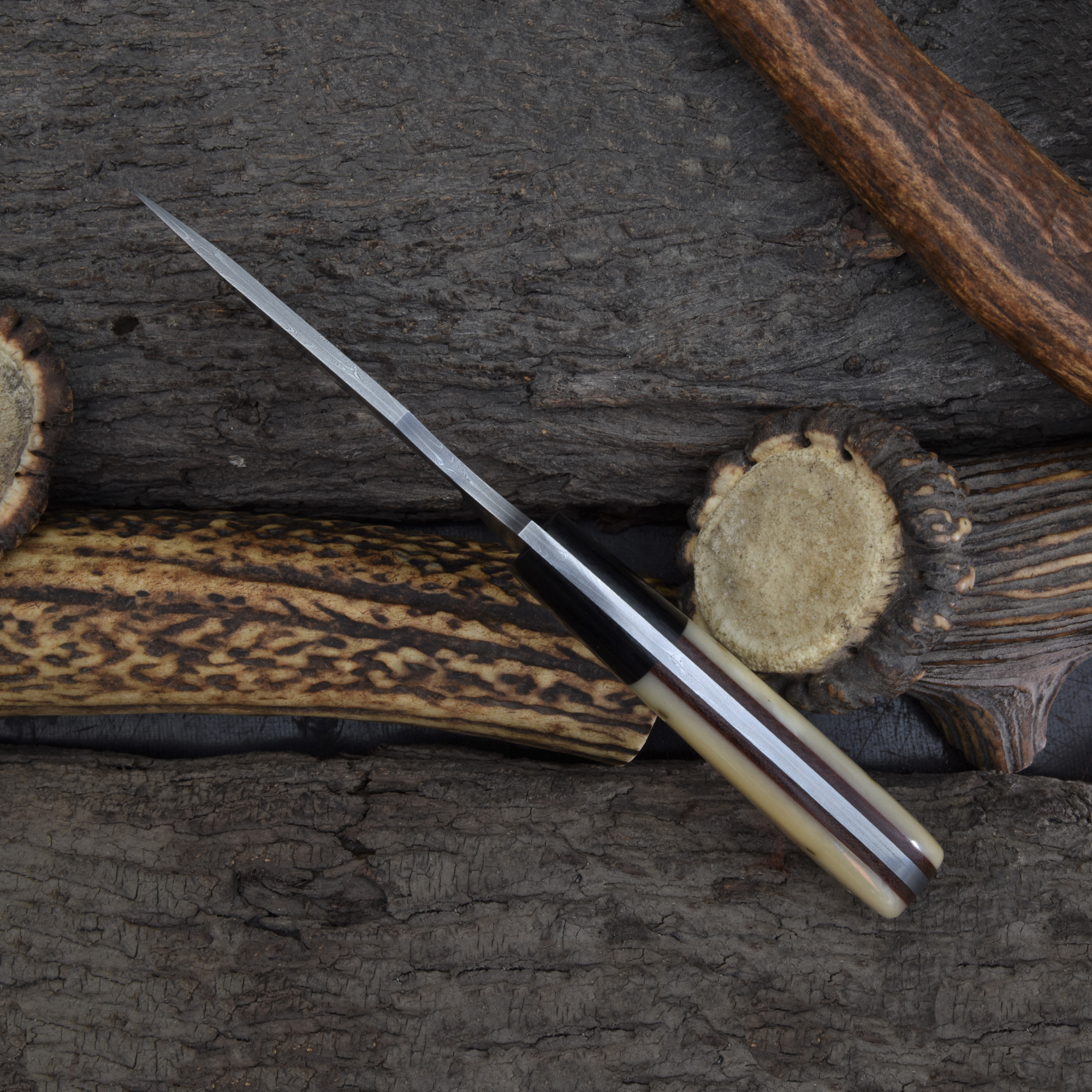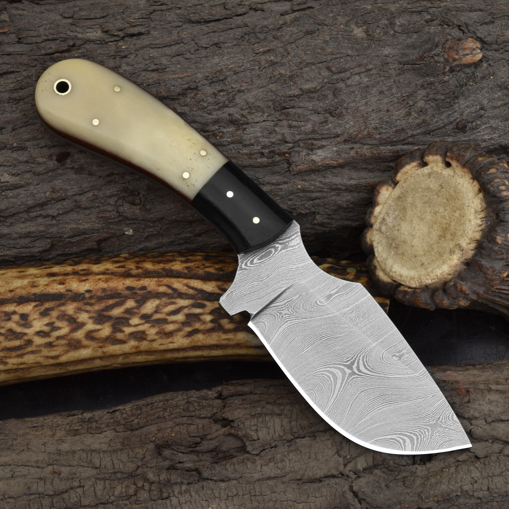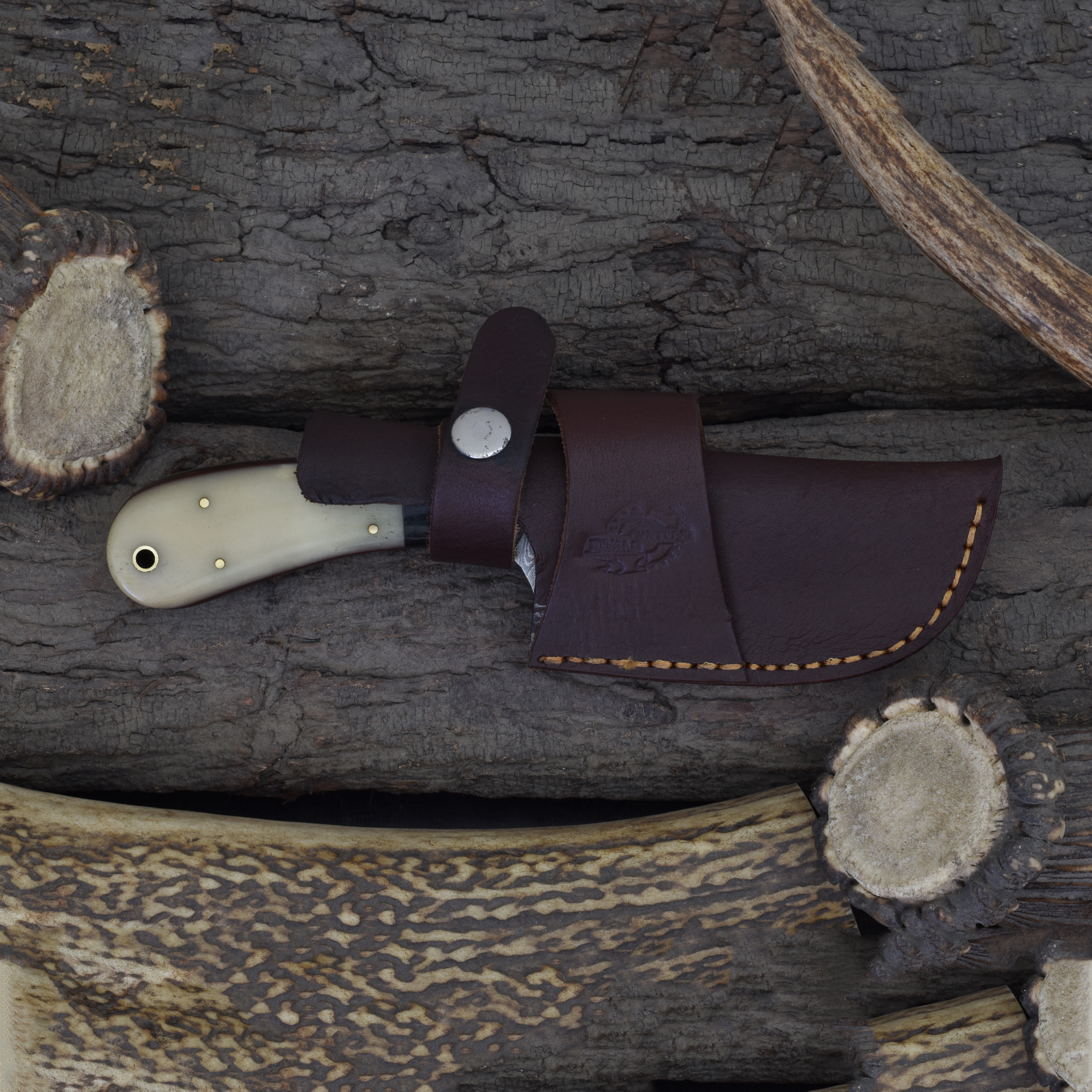Achieve precision and durability with the Knives Ranch Damascus Skinning Knife, featuring a 3-3/4" blade forged from premium Damascus steel. Perfectly designed for efficient skinning and detailed fieldwork, this knife ensures exceptional sharpness and edge retention. The Black Burlap Micarta and Cattle Bone handle with fiber liner provides a secure, comfortable grip, while the Vegetable Tanned Leather sheath with dual carry options (vertical and horizontal belt loops) offers versatile convenience for every hunter.