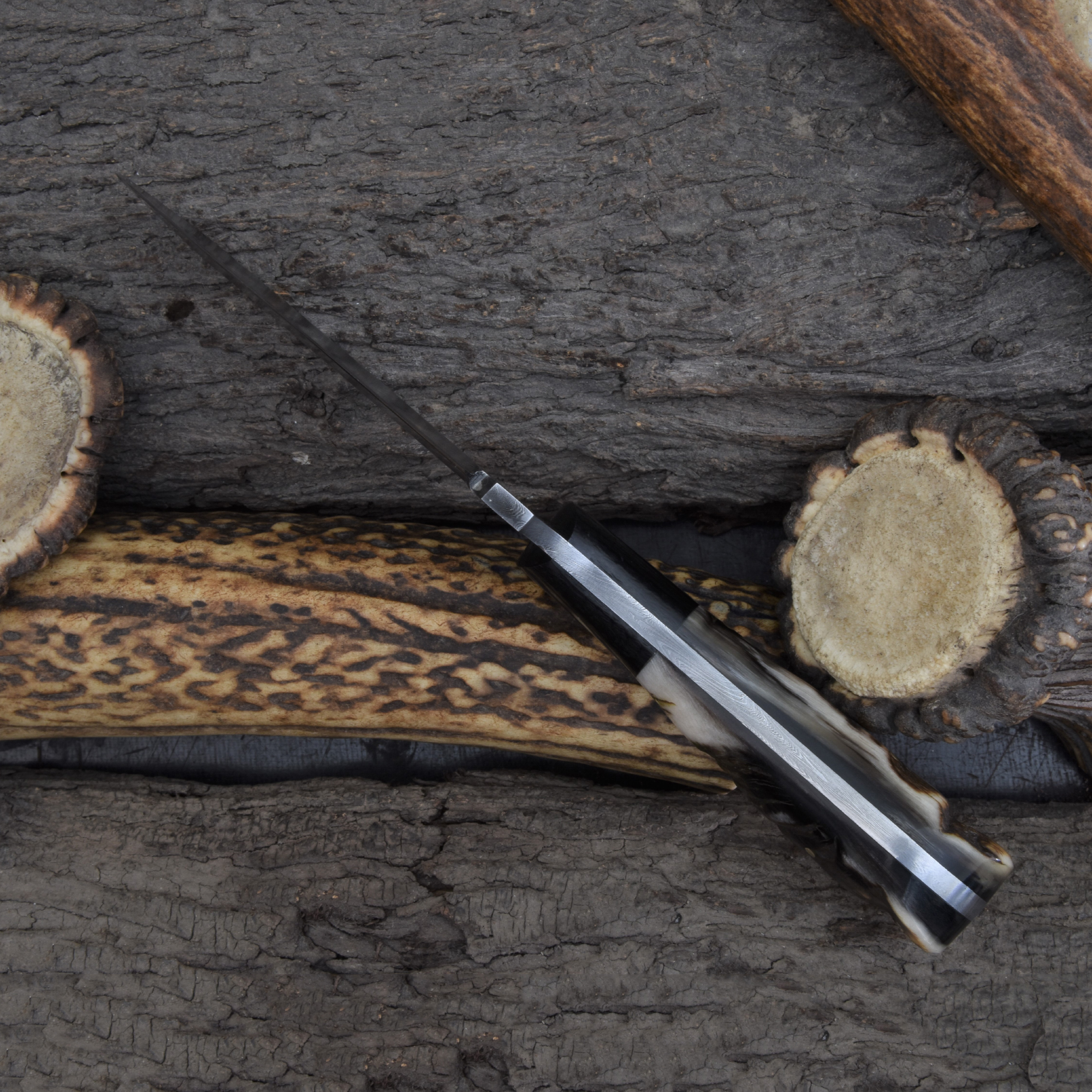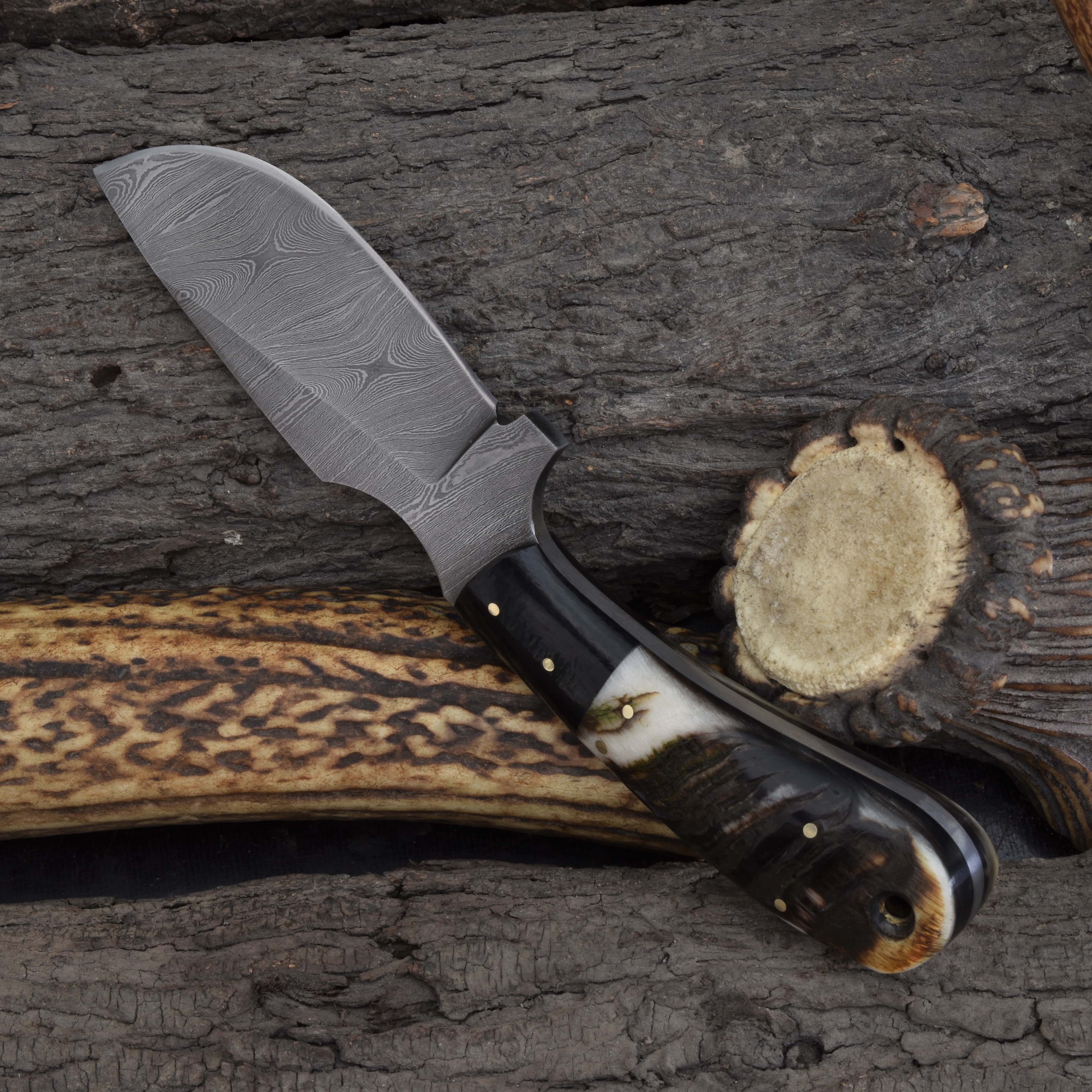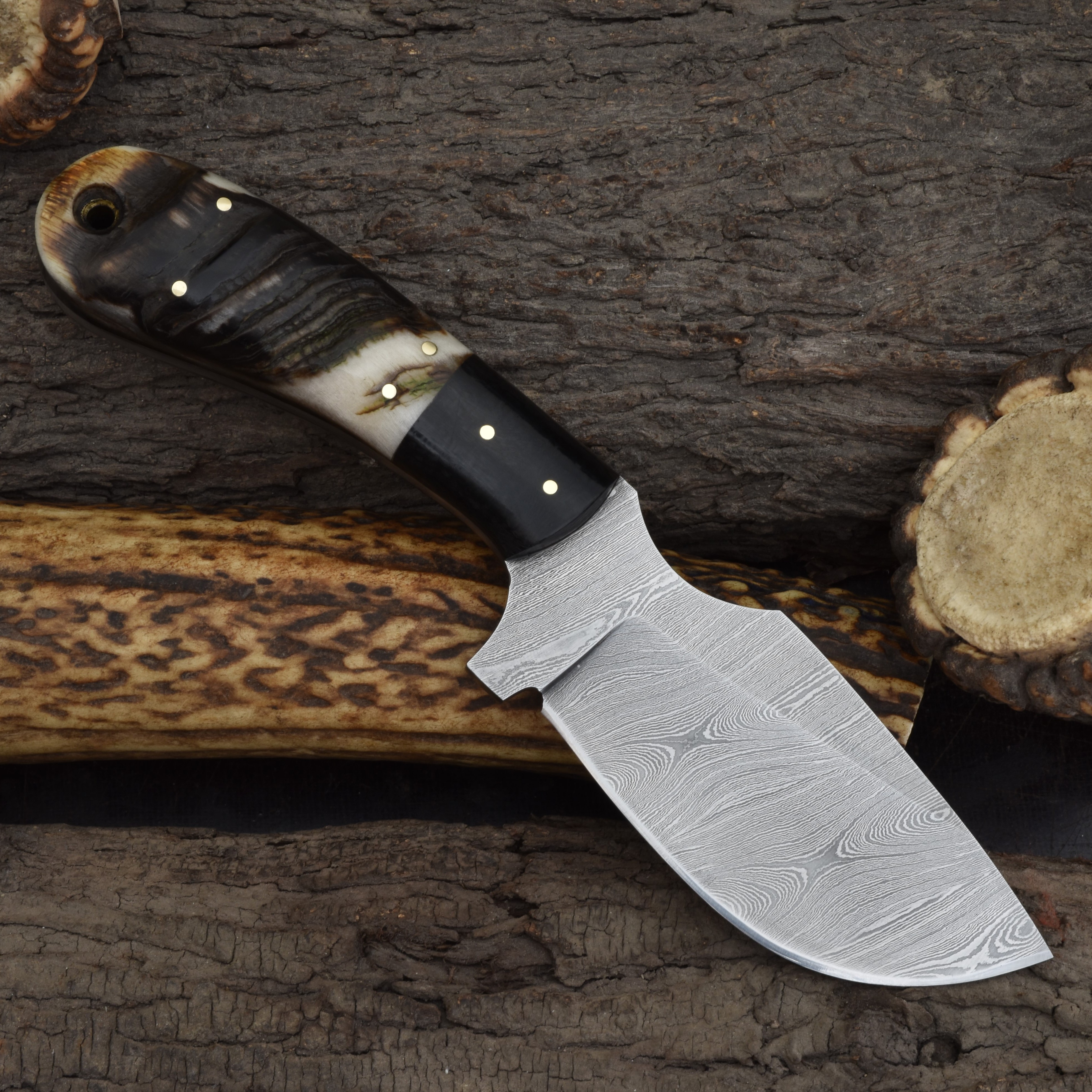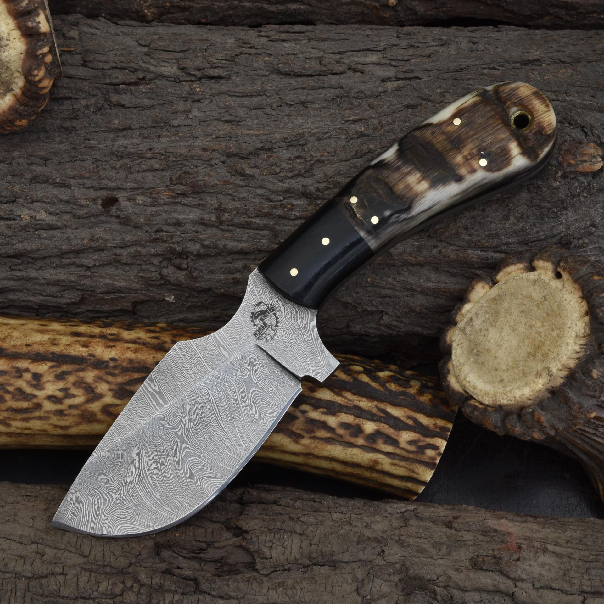 Knives Ranch Damascus Skinning Knife with Black Burlap Micarta & Ram’s Horn Handle