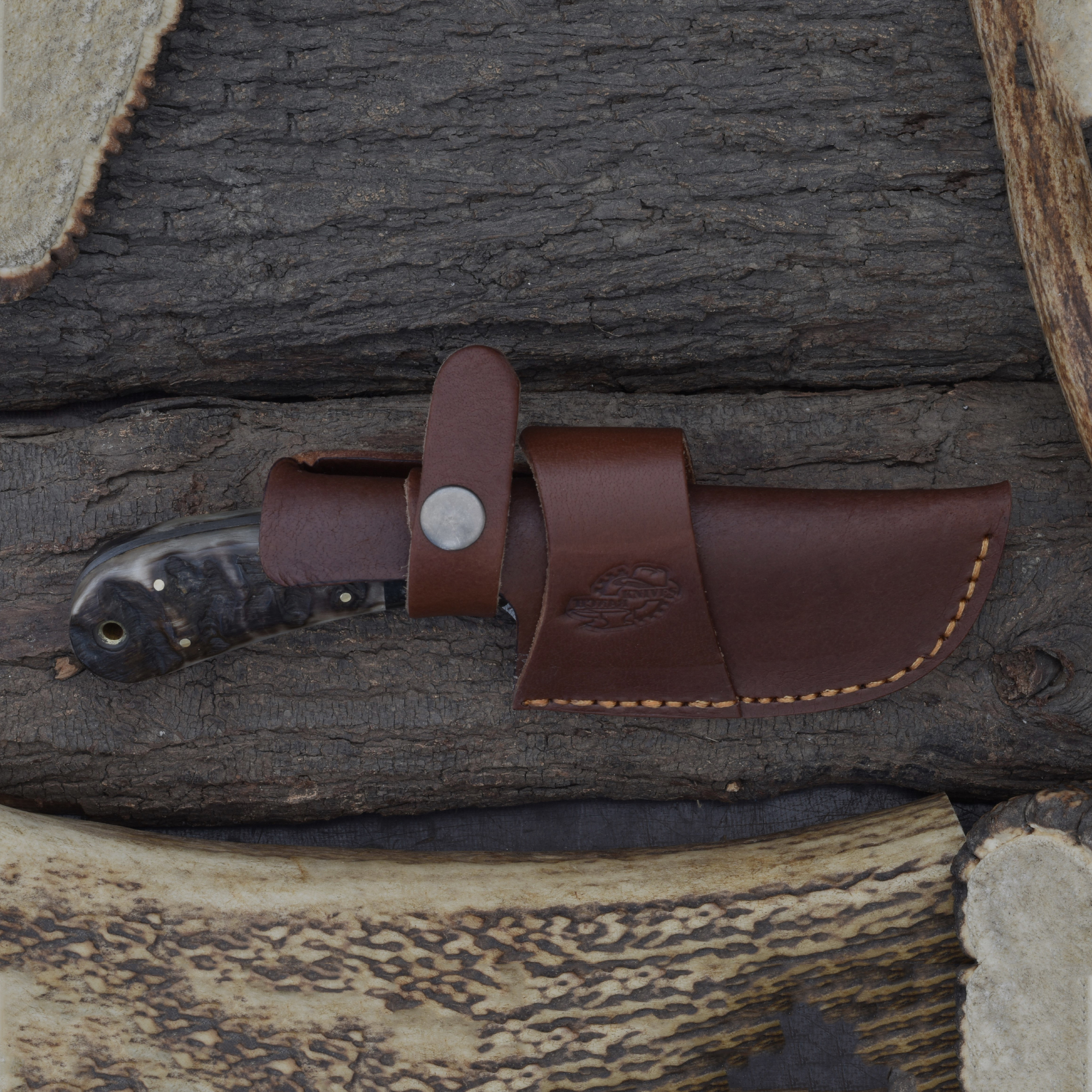 Achieve precision and durability with the Knives Ranch Damascus Skinning Knife, featuring a 3-3/4" blade forged from premium Damascus steel. Designed for efficient skinning and detailed fieldwork, this blade offers exceptional sharpness and long-lasting edge retention. The Black Burlap Micarta and Ram’s Horn handle delivers a secure, comfortable grip, while the Vegetable Tanned Leather sheath with dual carry options (horizontal and vertical belt loops) provides versatile carrying convenience for every hunter.