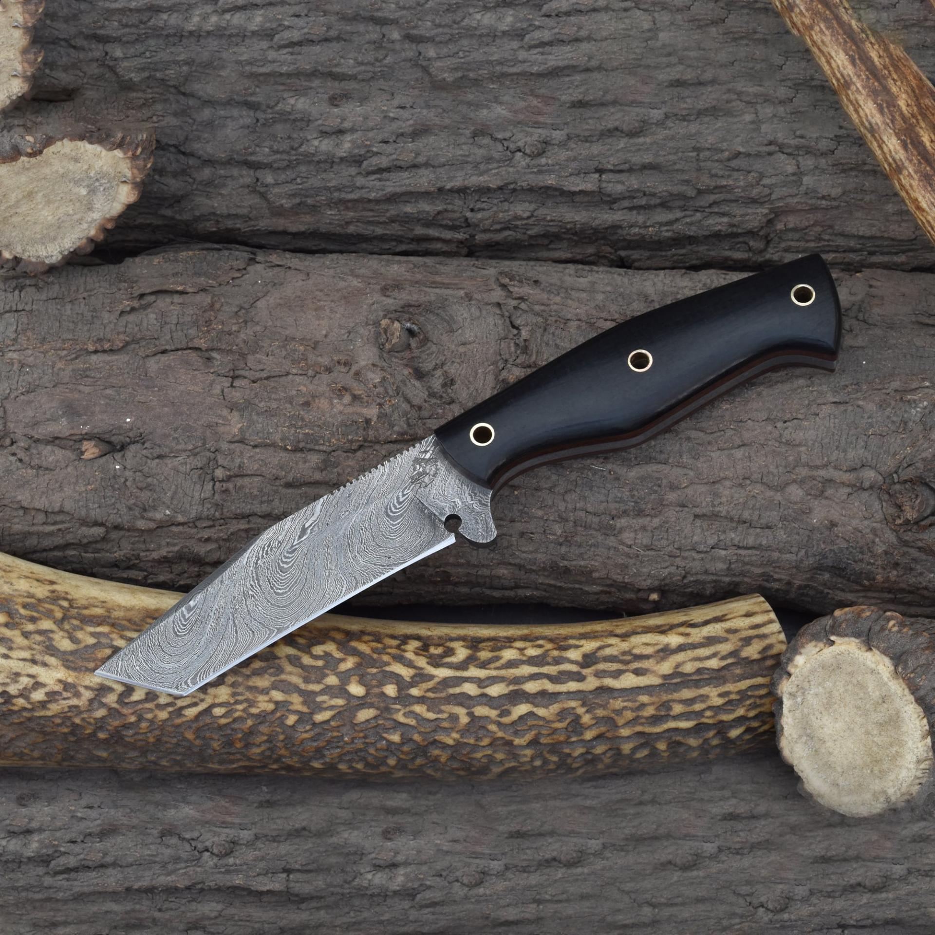 Ideal for hunters, survivalists, and collectors, this black burlap micarta Damascus knife combines toughness and ergonomic design. This dual carry Damascus fixed blade knife is a perfect blend of functionality and craftsmanship.