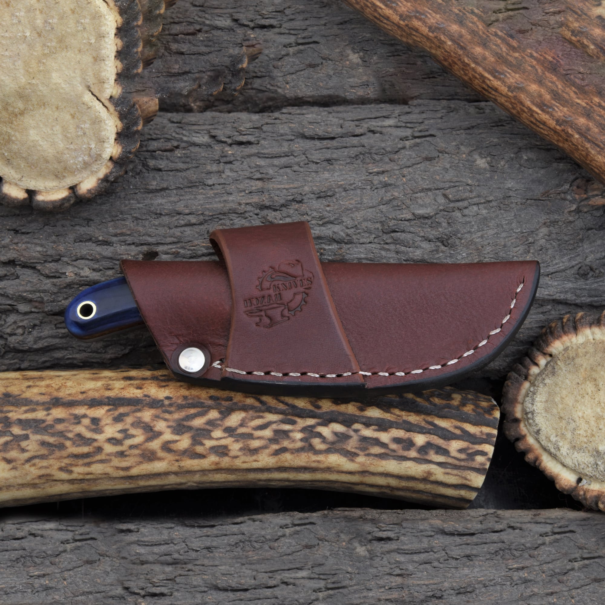This Knives Ranch Damascus knife features a sharp blade forged from premium Damascus steel, ensuring excellent edge retention and precision cutting. The blue colored cattle bone handle offers a unique look, with color saturation varying naturally between each knife, making every piece one-of-a-kind. Paired with a horizontal side-mount Vegetable Tanned Leather sheath, this knife provides secure and convenient carry for everyday use.
