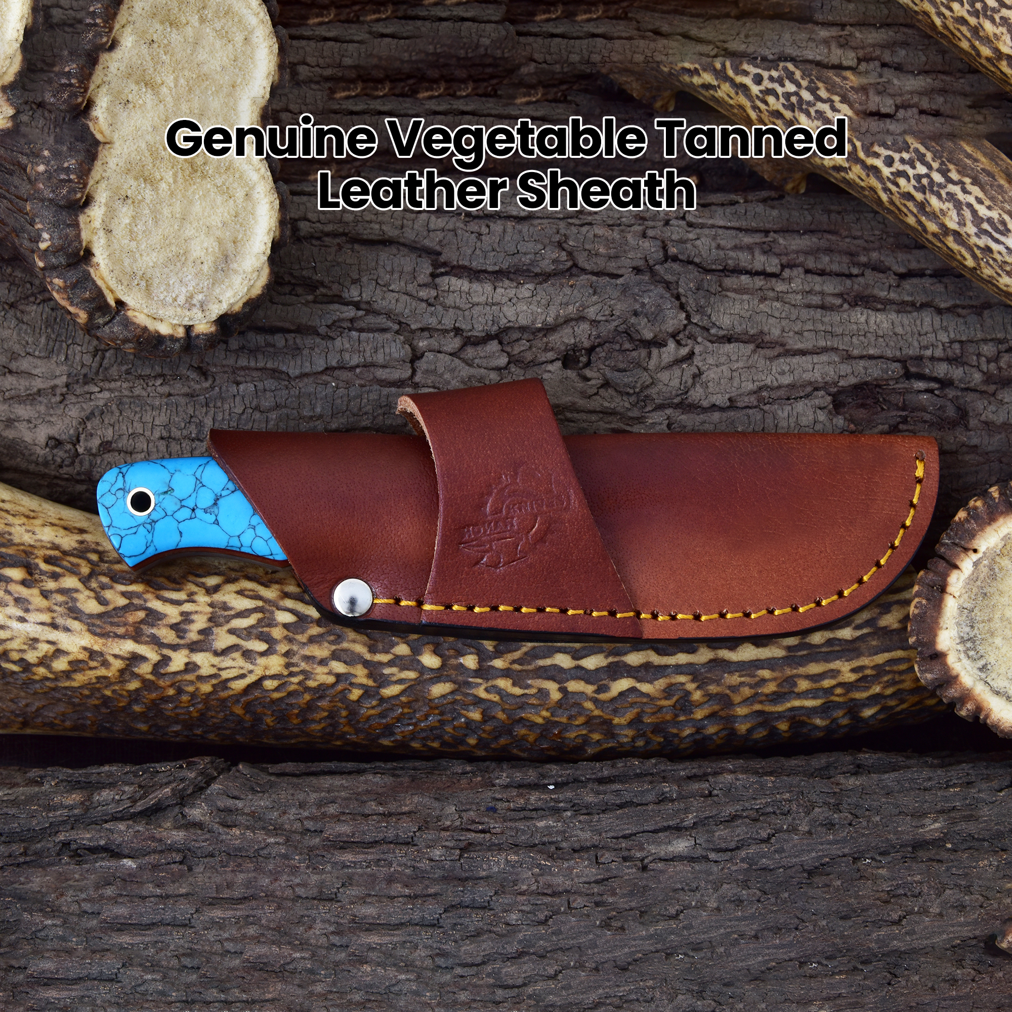 Featuring a durable Damascus steel bolster for added balance and strength, this Damascus steel faux turquoise knife combines eye-catching aesthetics with reliable performance. The Vegetable Tanned Leather side mount sheath provides practical carrying options. Whether for outdoor use or display, this handcrafted faux turquoise blade is a striking addition to any knife collection.