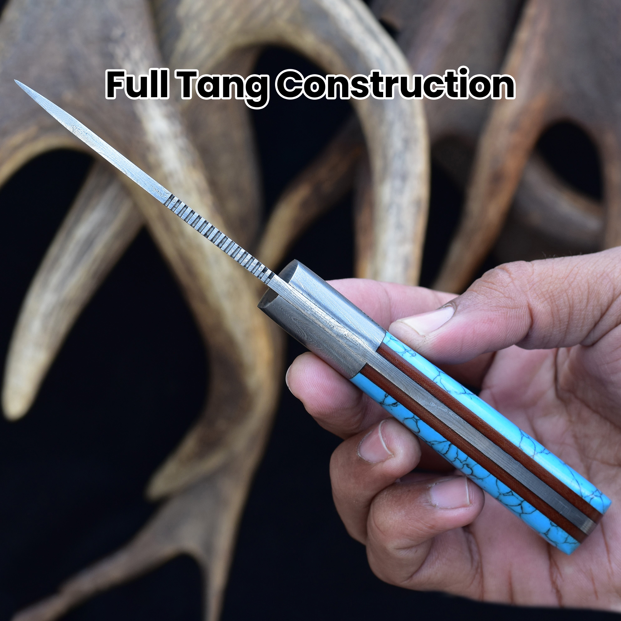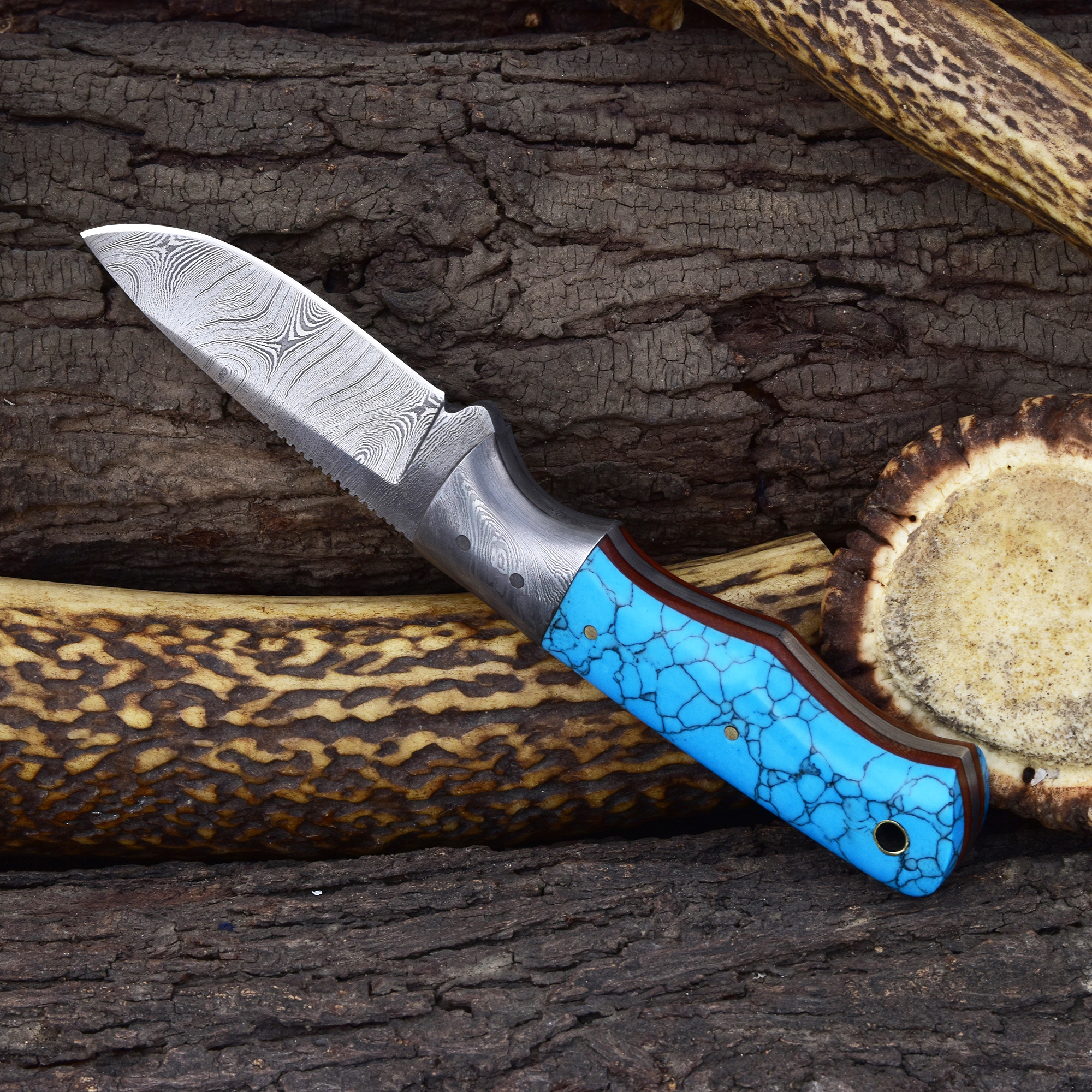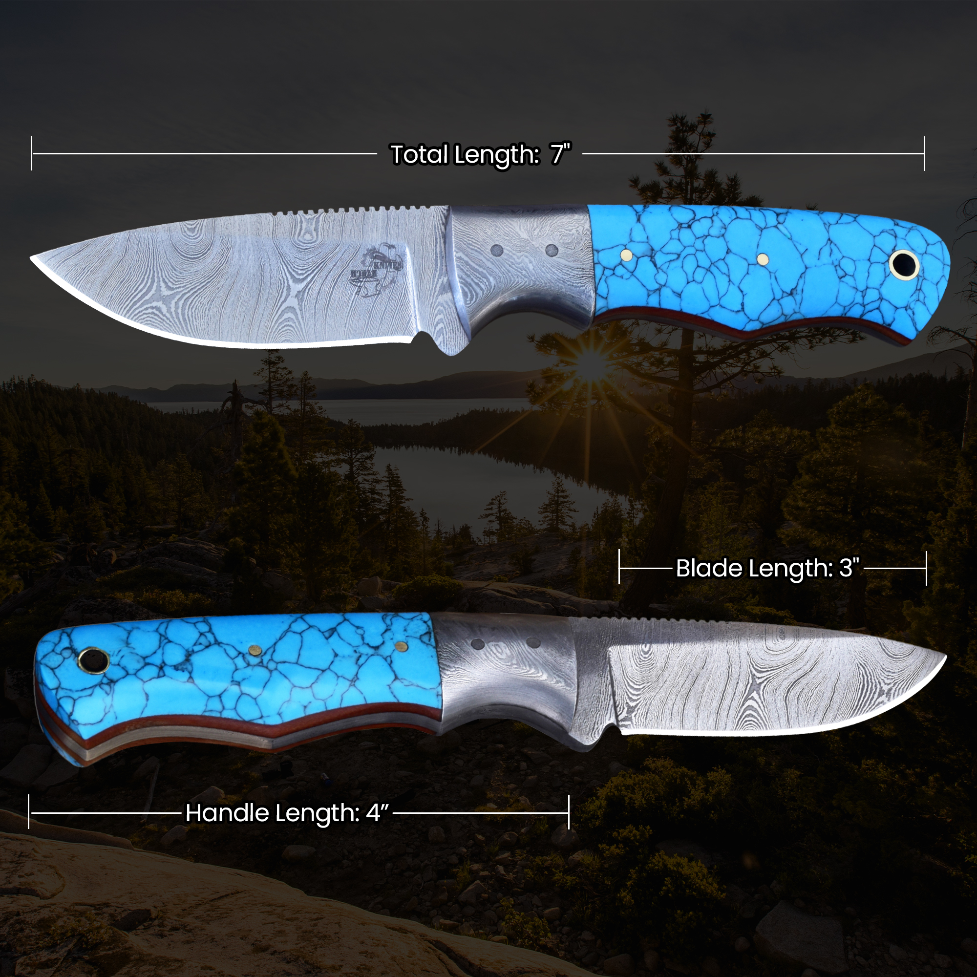 Discover the unique appeal of the Knives Ranch Damascus Steel knife with a stunning faux turquoise handle that showcases beautiful design patterns that vary on every handle. Crafted for both function and style, this blade delivers excellent sharpness and durability for daily use and collection.