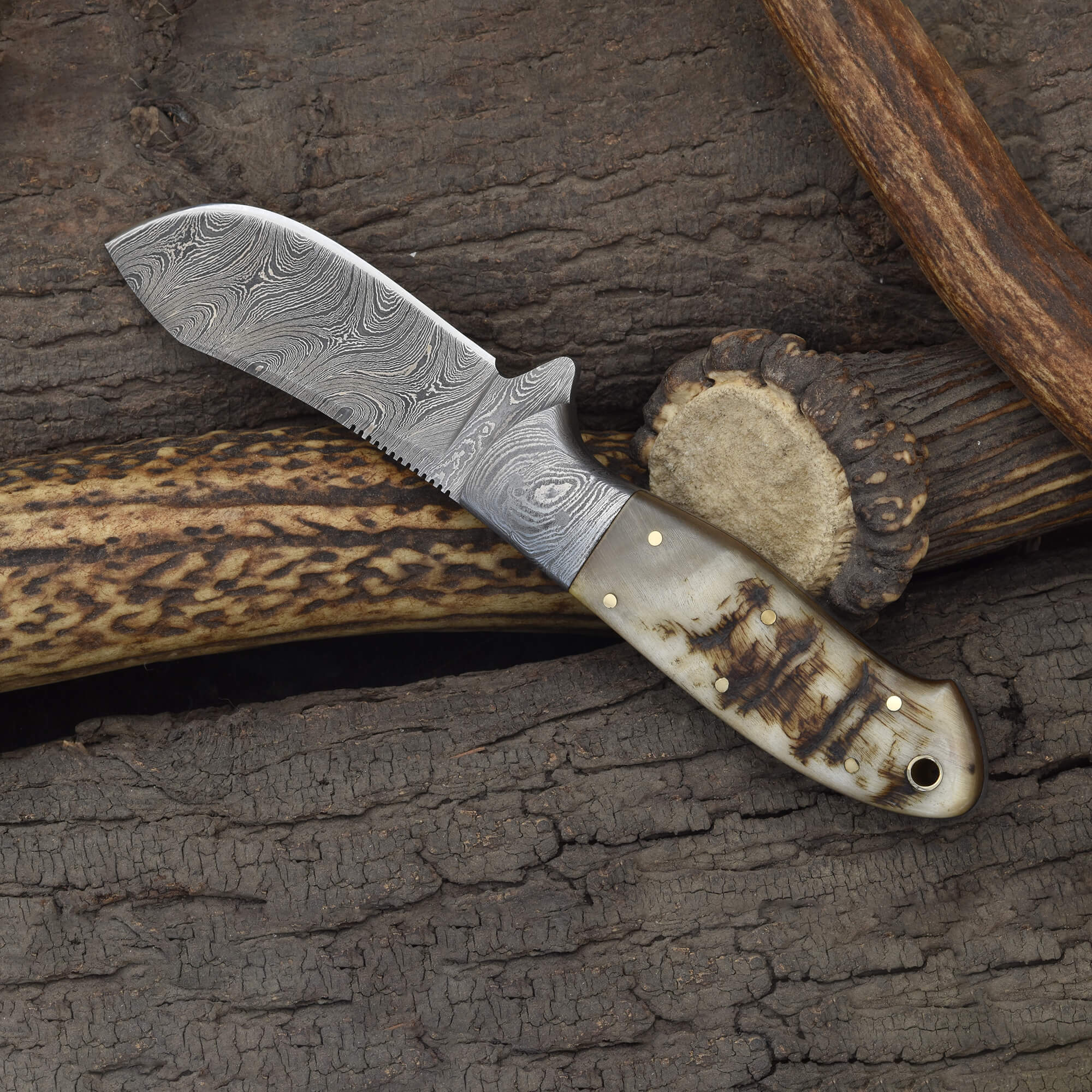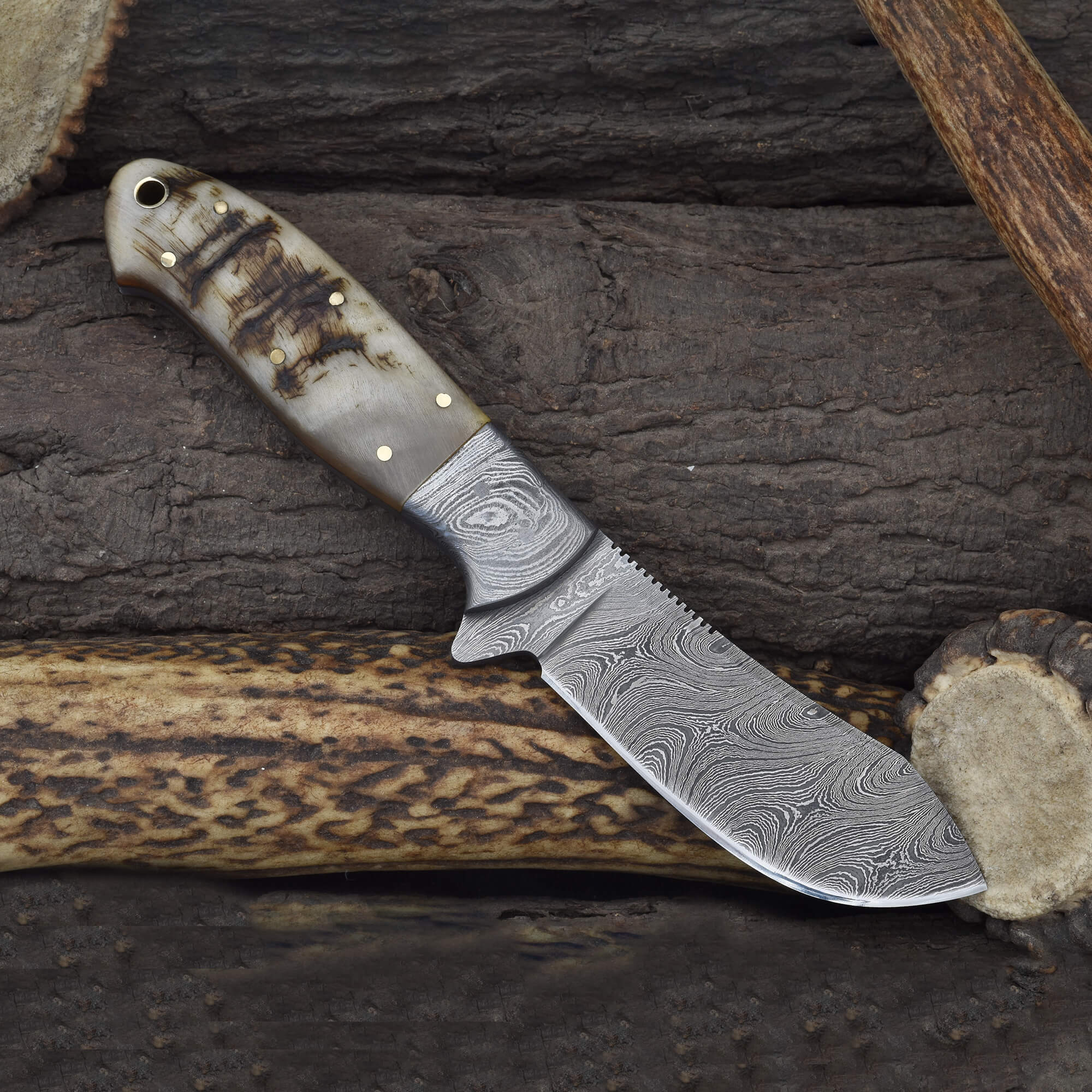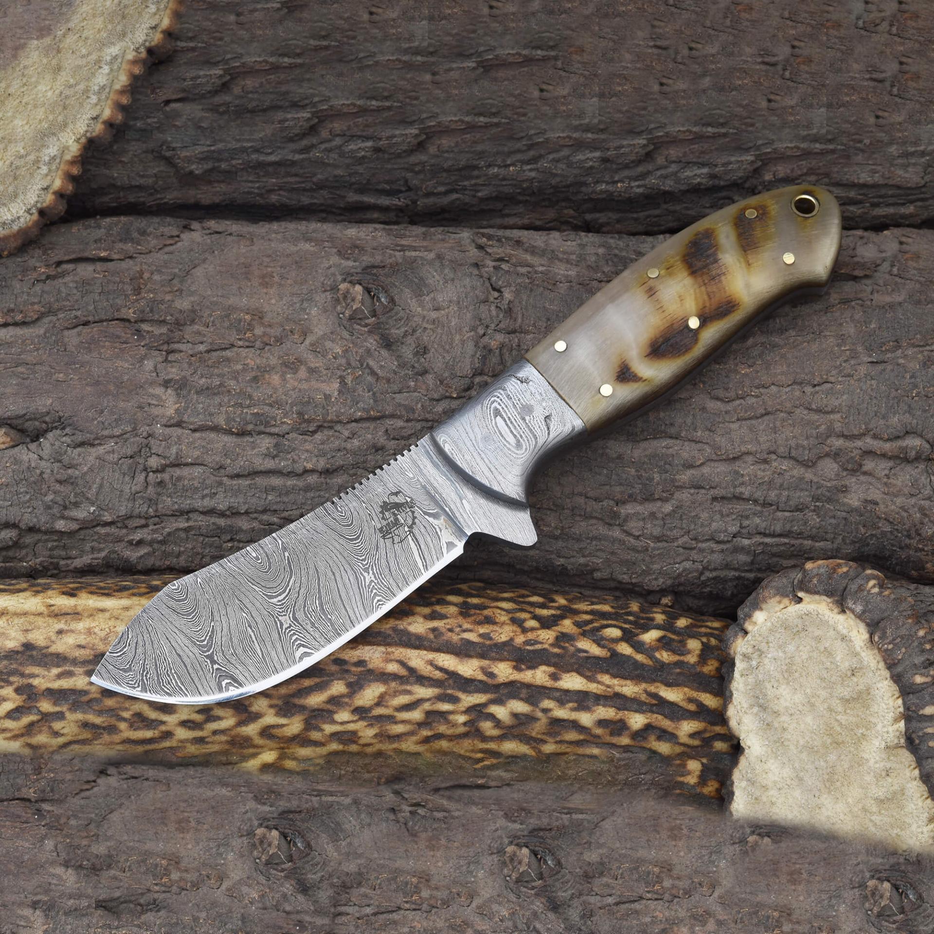 Experience superior craftsmanship with this Knives Ranch Damascus Steel hunting knife, featuring a genuine ramhorn handle hunting knife designed for comfort and durability. Forged from high-quality Damascus steel, this blade offers excellent edge retention and strength for demanding outdoor tasks.