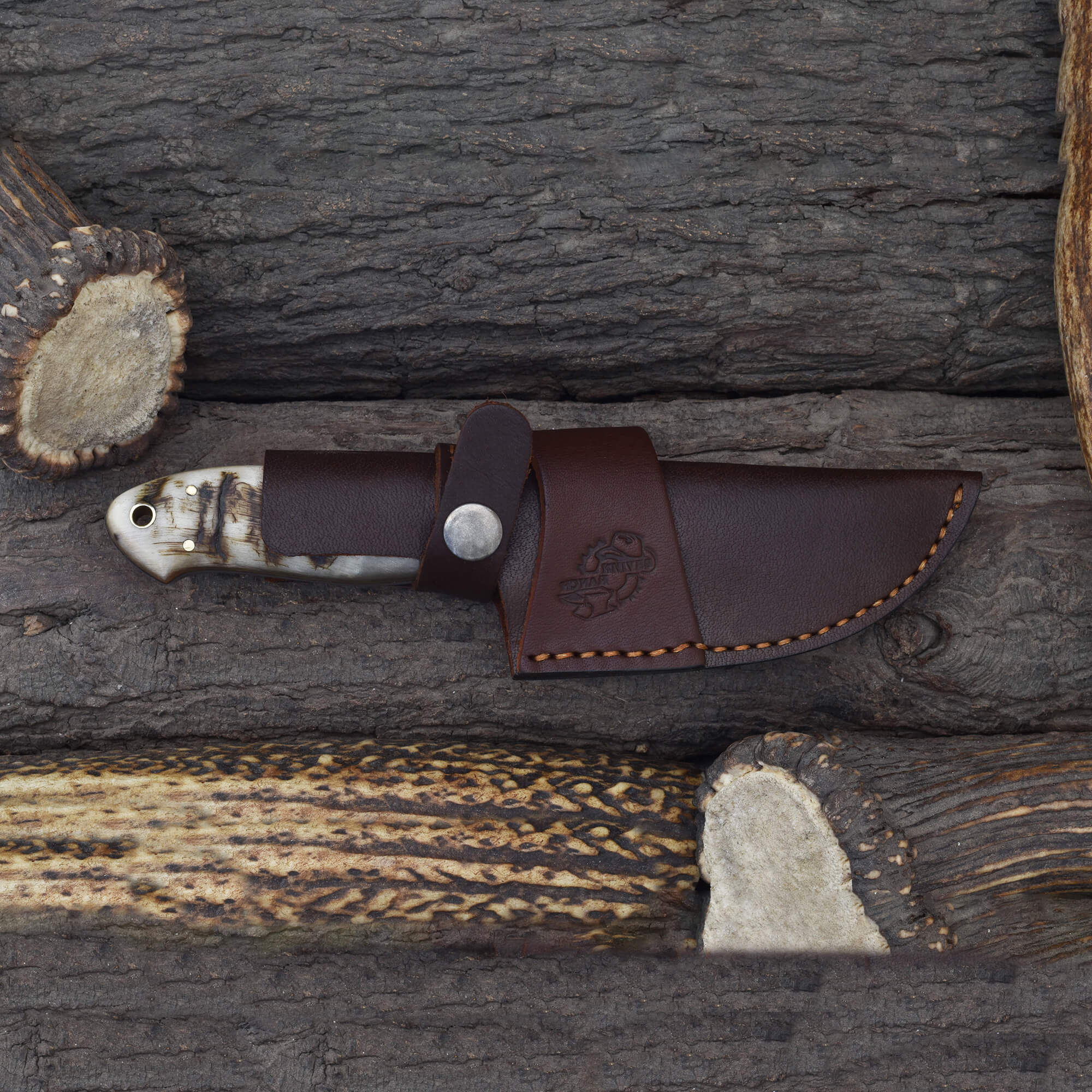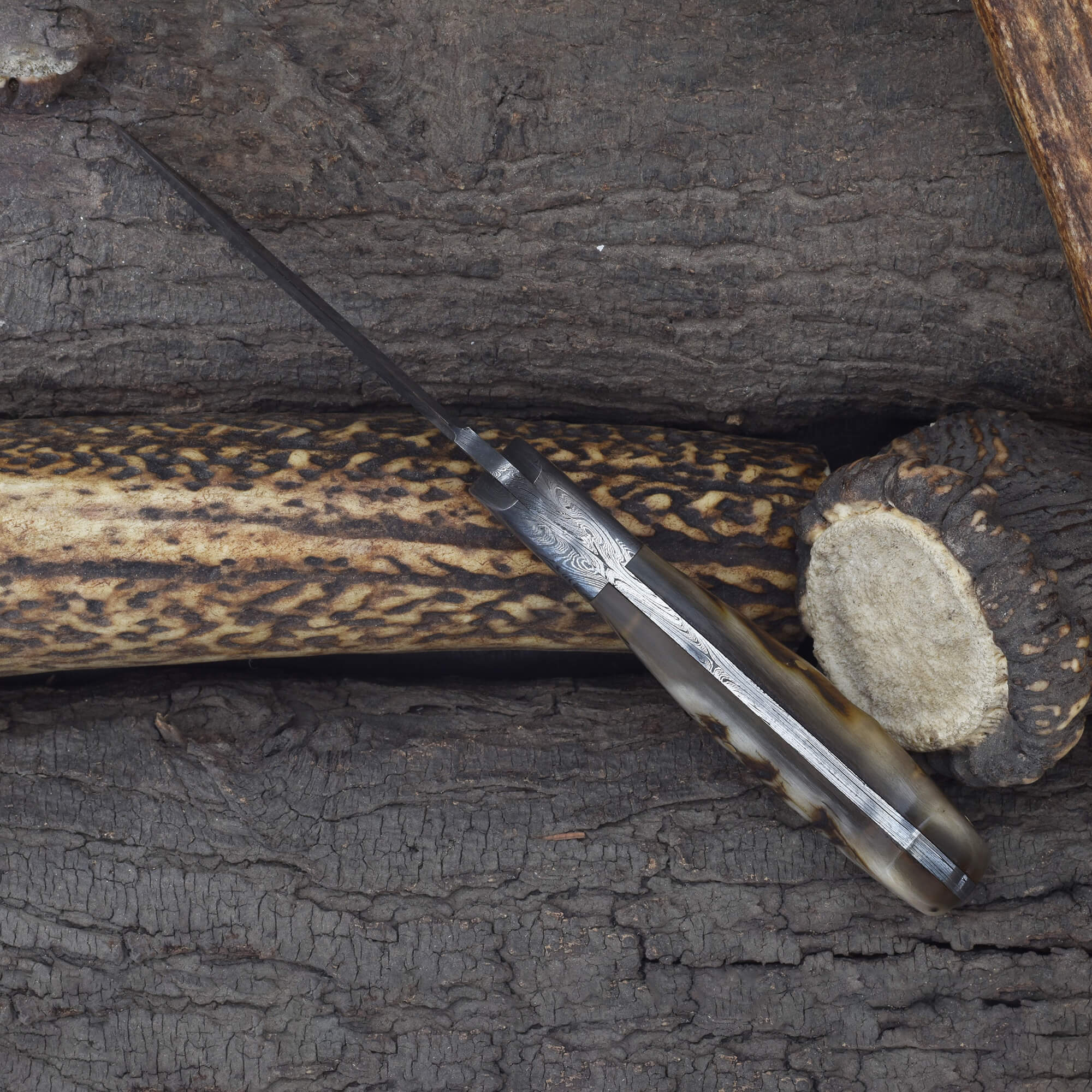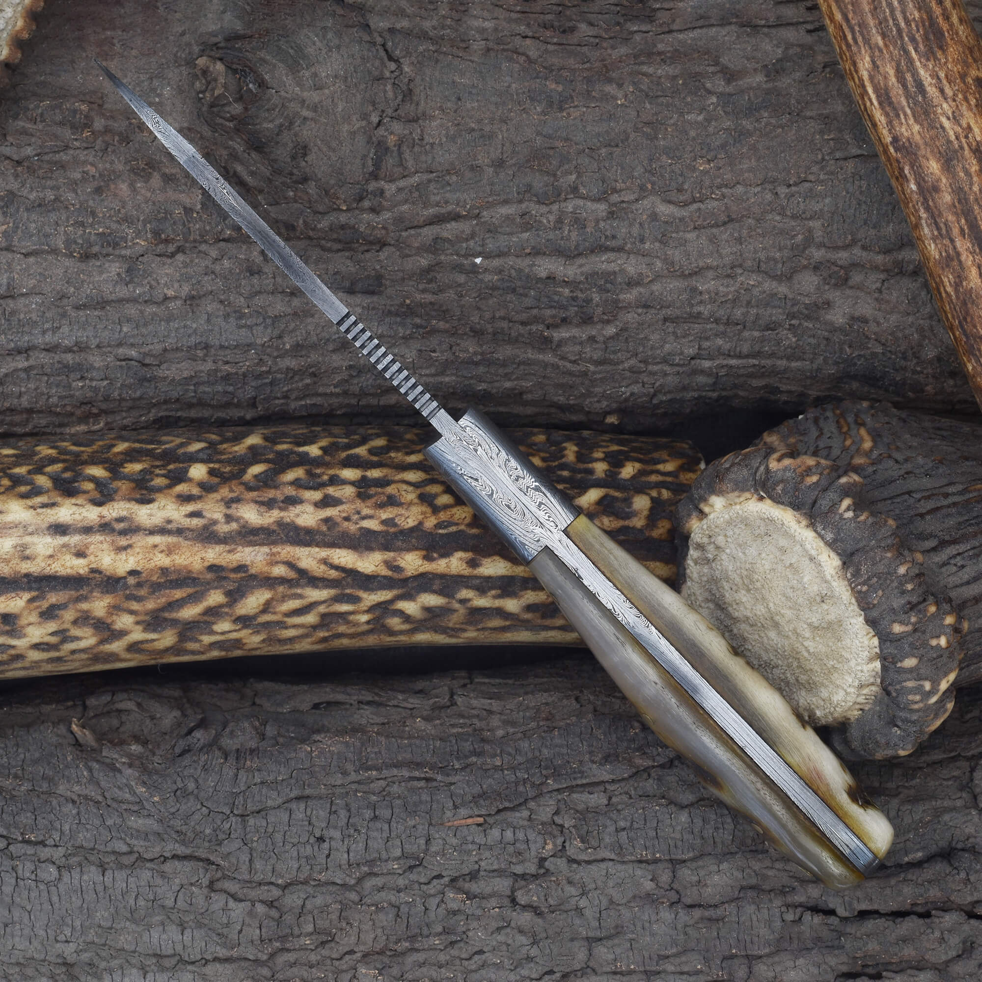Experience superior craftsmanship with this Knives Ranch Damascus Steel hunting knife, featuring a genuine ramhorn handle hunting knife designed for comfort and durability. Forged from high-quality Damascus steel, this blade offers excellent edge retention and strength for demanding outdoor tasks.