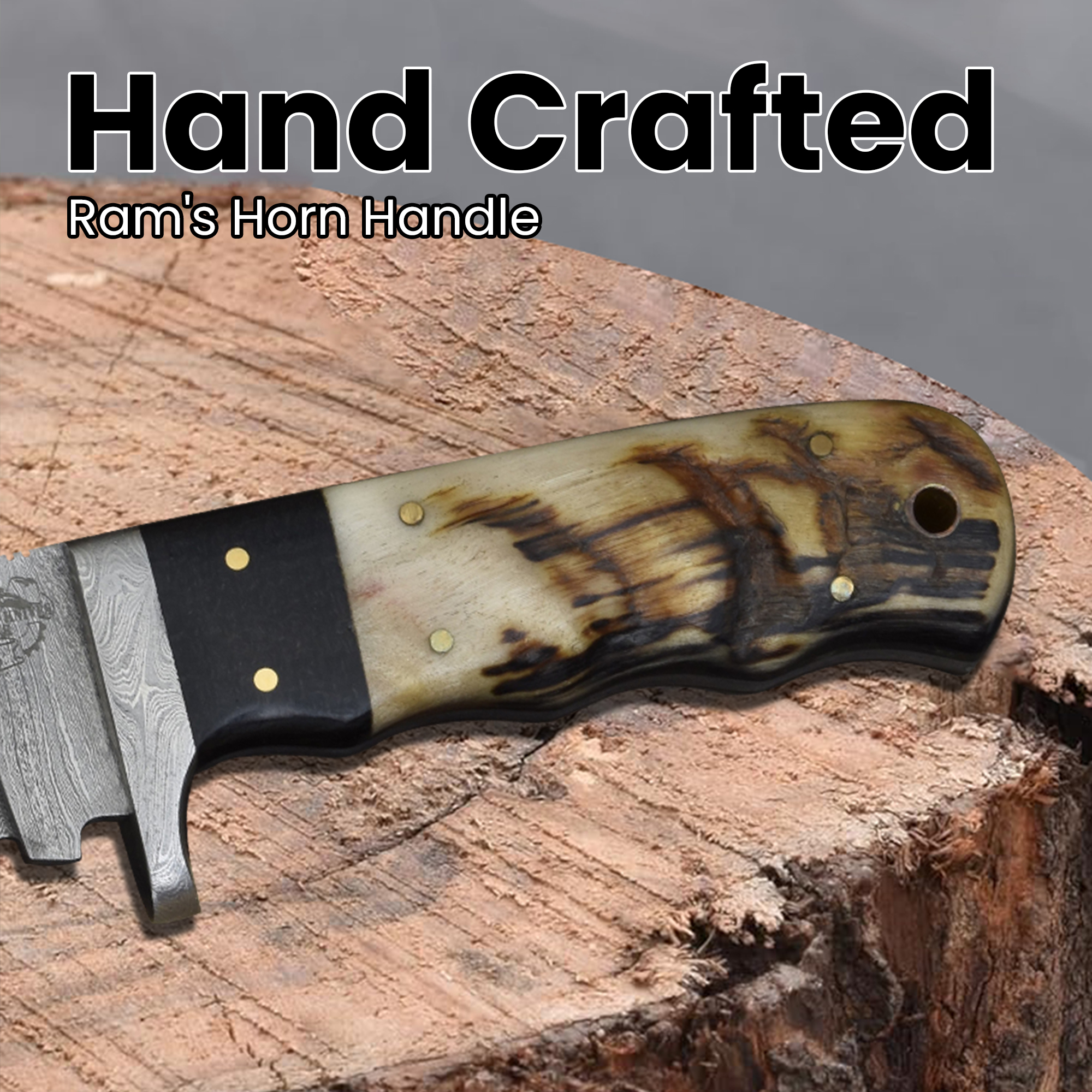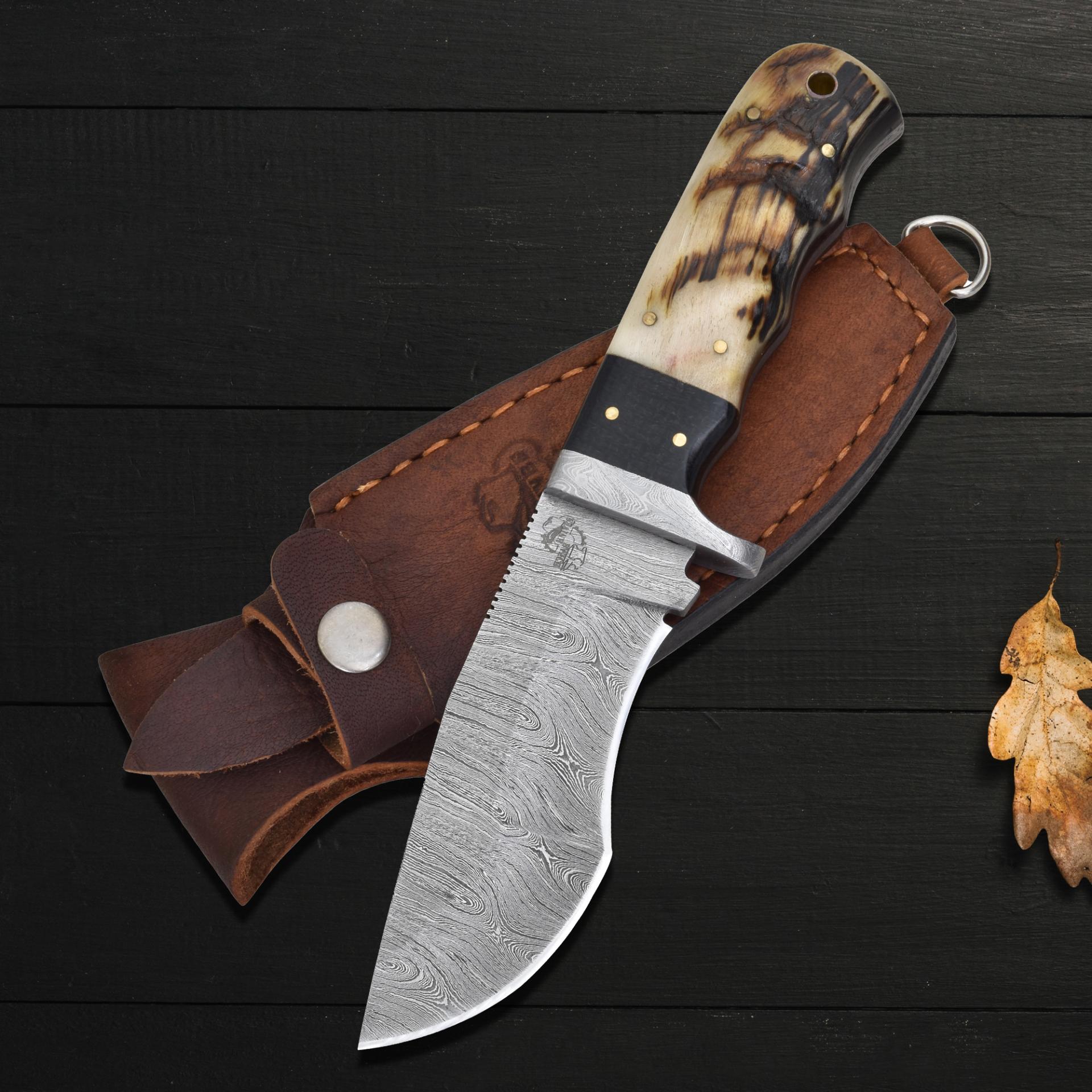 Discover the perfect balance of tradition and strength with this Knives Ranch Damascus Steel knife featuring an authentic ramhorn handle knife that offers a natural grip with unique ridge patterns and tones on each handle. The blade delivers exceptional sharpness and durability for versatile outdoor and everyday use
