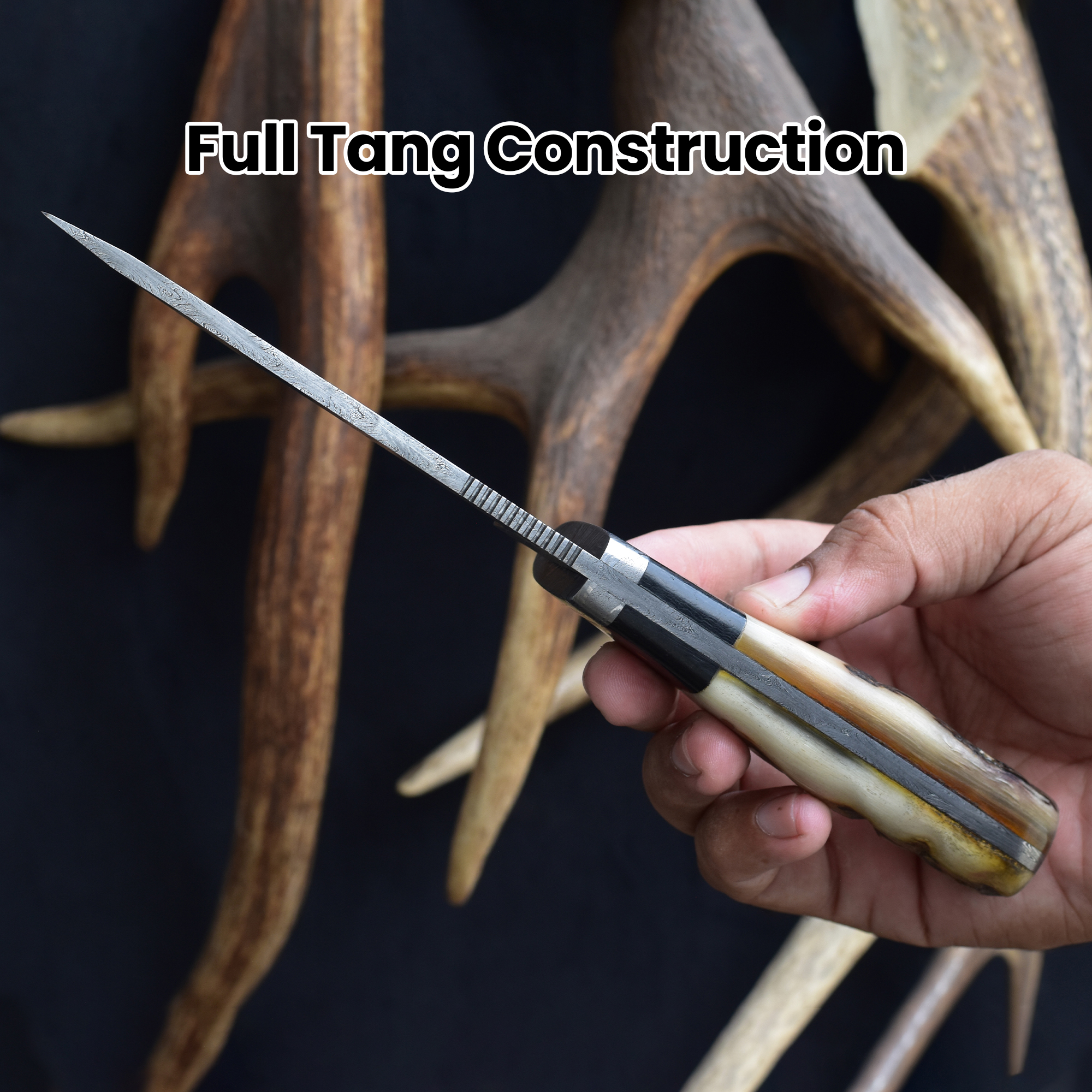 Crafted with a sturdy Damascus steel bolster for added balance and strength, this knife includes a cowhide vertical belt loop sheath for convenient carrying. Ideal for collectors and outdoor enthusiasts, this Damascus steel ramhorn knife combines artisanal craftsmanship with reliable performance. This handcrafted ramhorn blade is built to last and impress.