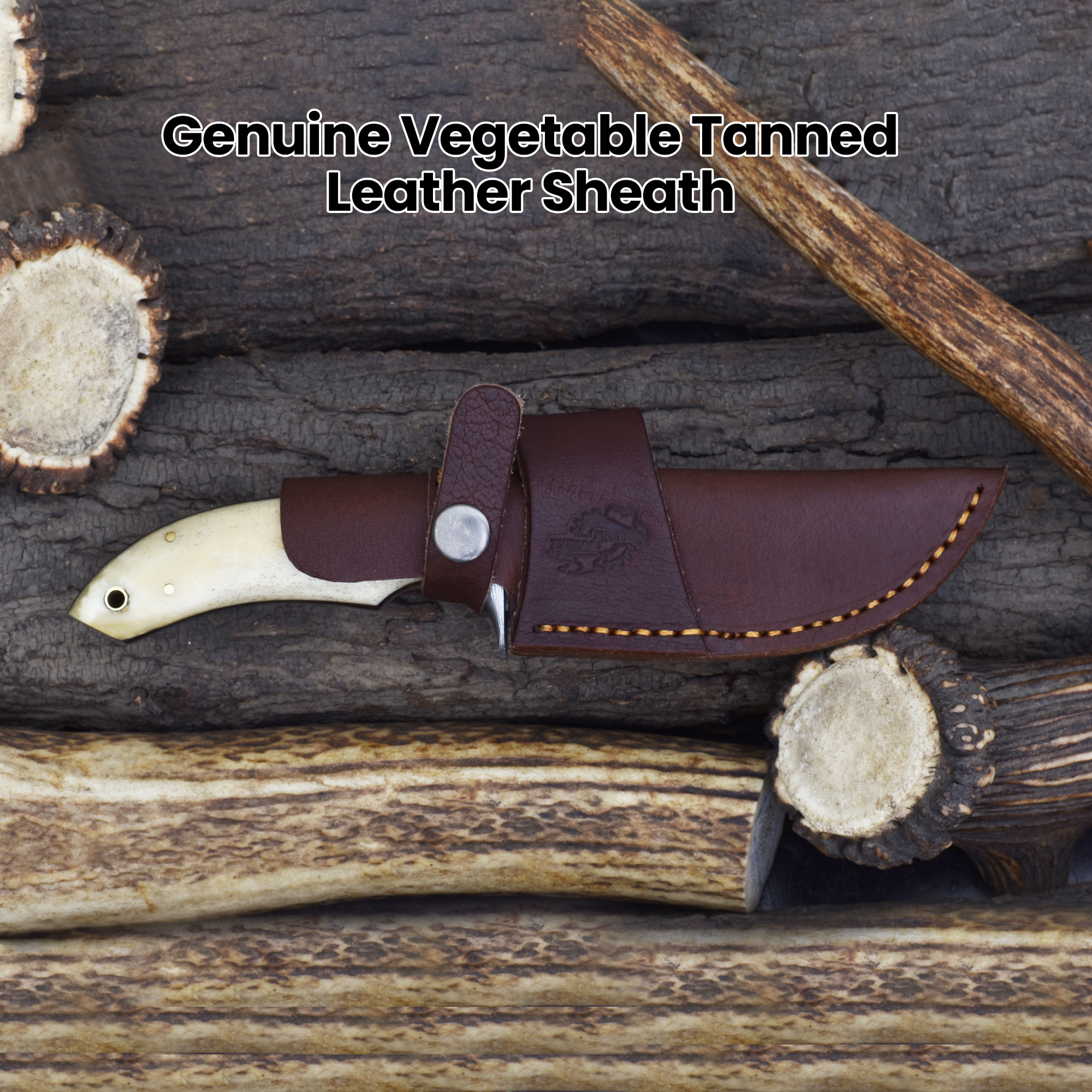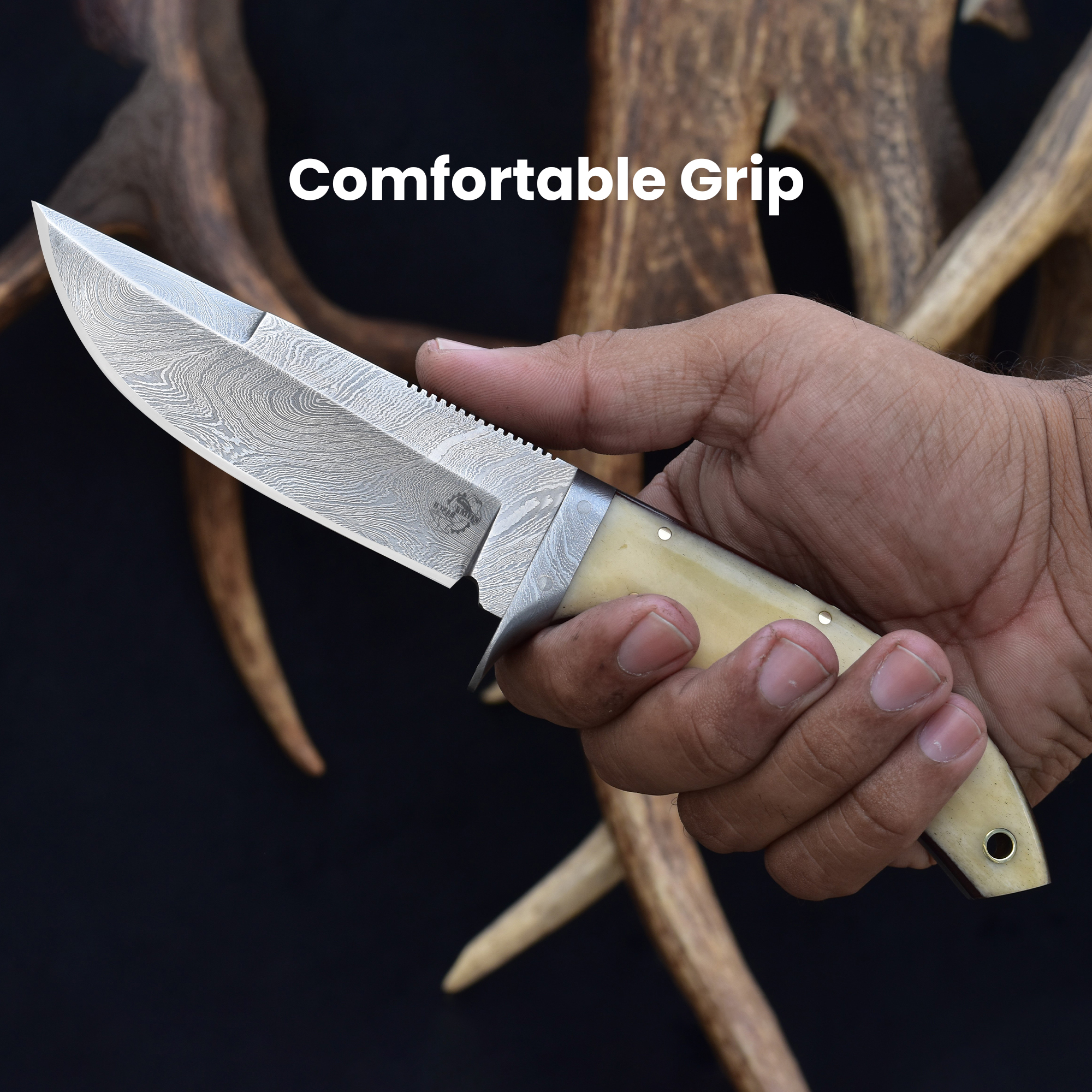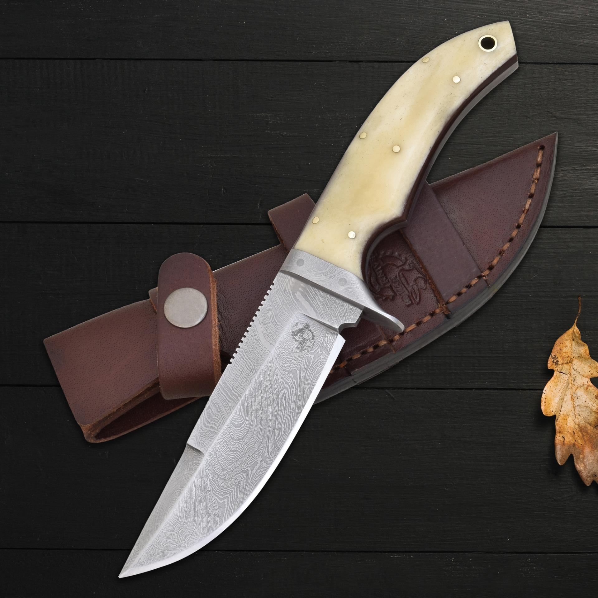 Equipped with a sturdy Damascus steel bolster for enhanced strength and balance, this knife includes a versatile vegetable-tanned leather dual carry sheath, allowing horizontal and vertical belt loop options. Whether for daily tasks or display, this Damascus steel bone handle knife combines timeless style with reliable performance. This handcrafted cattle bone knife is built to impress and endure.