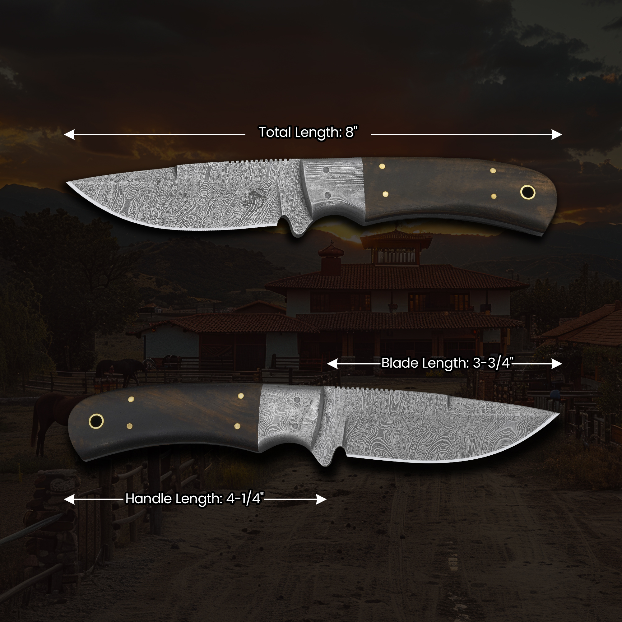 Knives Ranch Classic Damascus Steel Knife with Rosewood Handle and Side Mount Horizontal Sheath