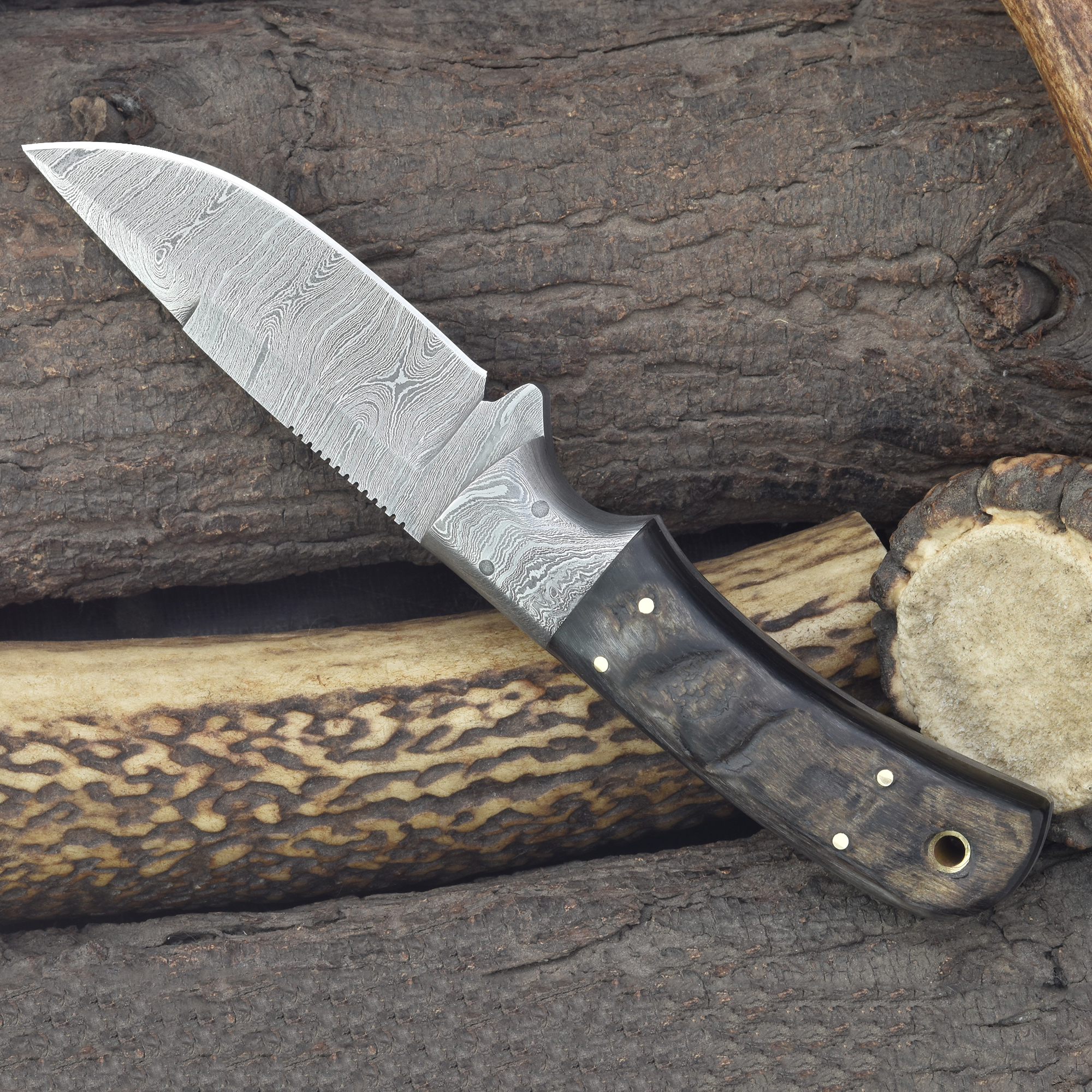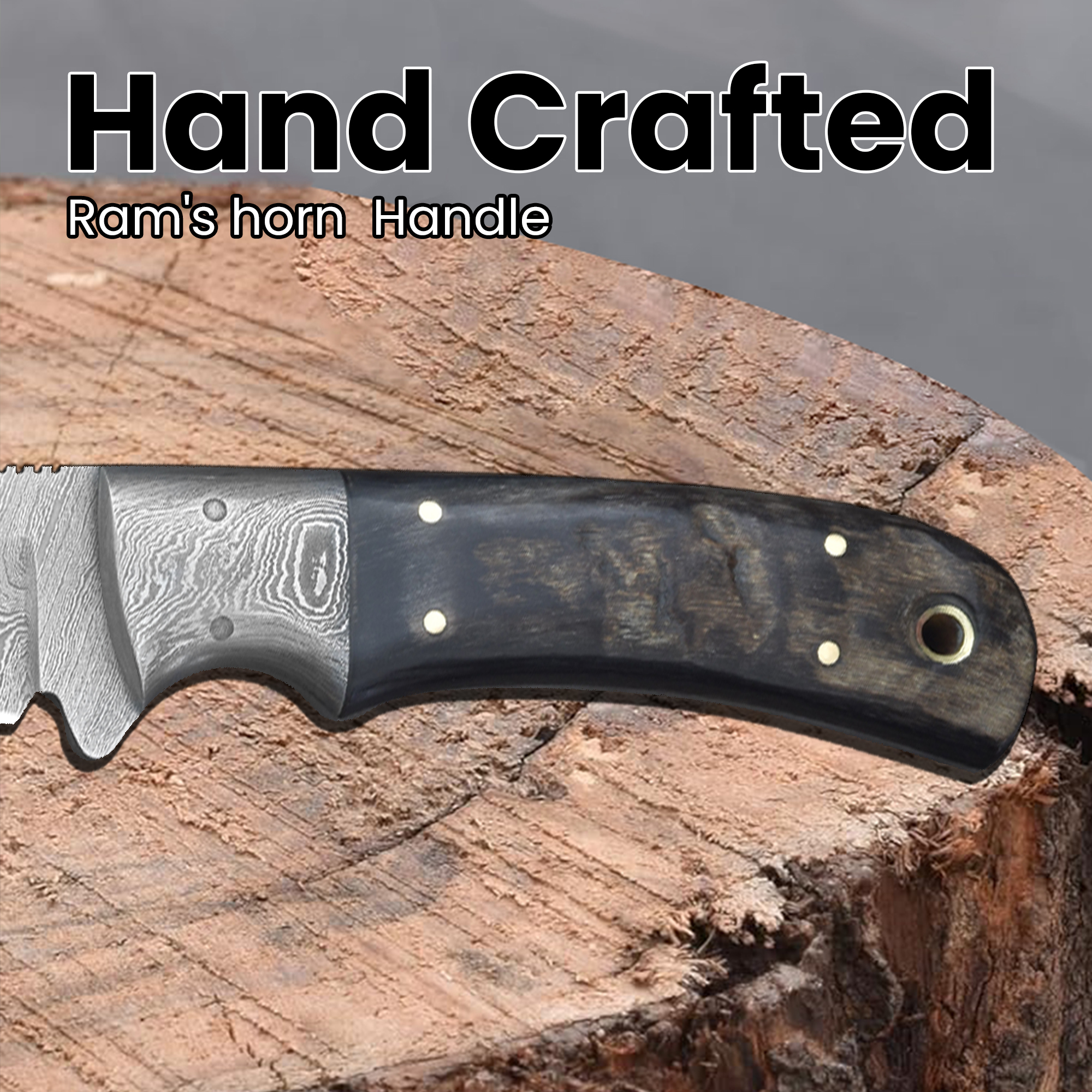 Discover the beauty and strength of this Knives Ranch Damascus Steel knife featuring an authentic ram horn handle knife with unique ridge patterns and tones on each handle. Crafted for those who appreciate both aesthetics and functionality.