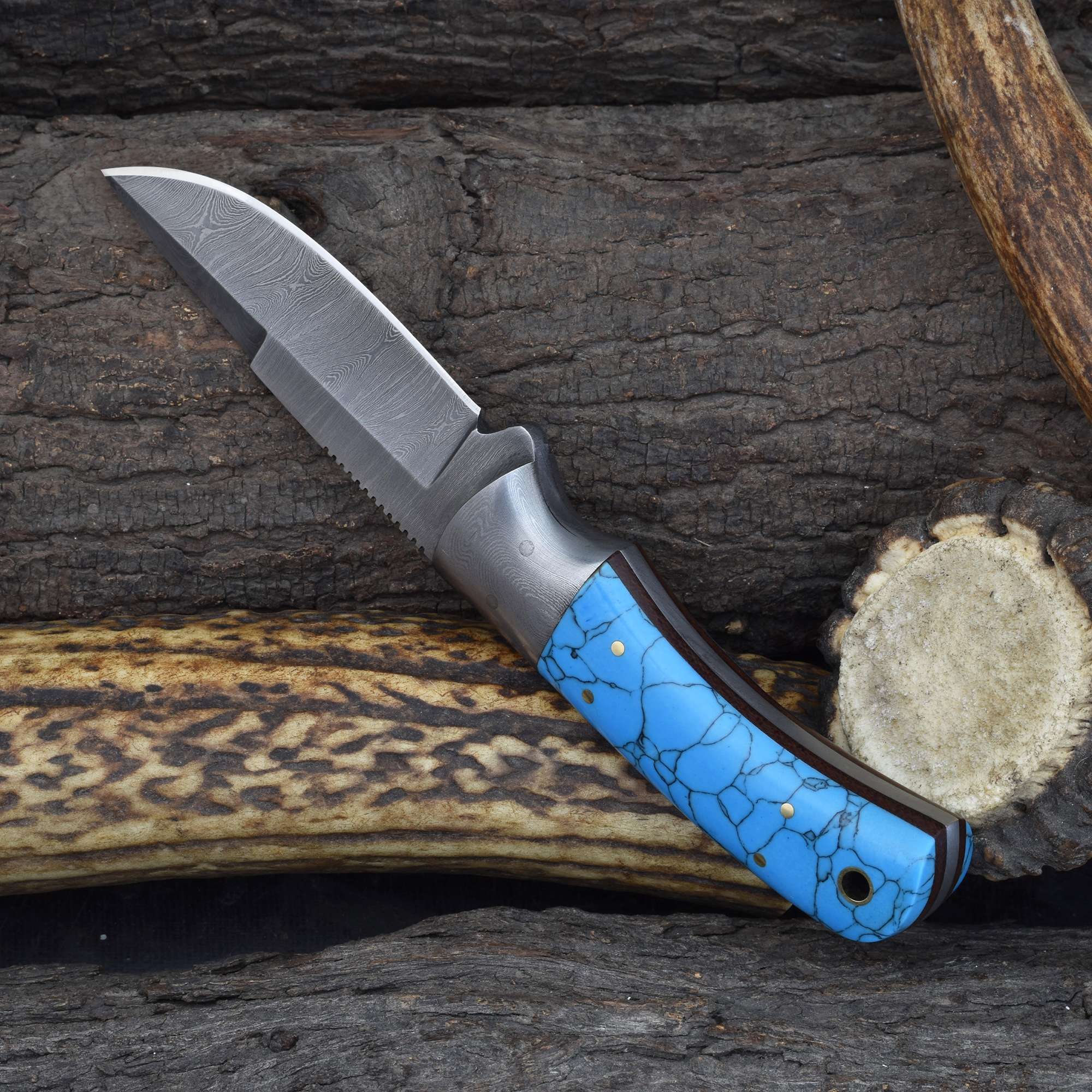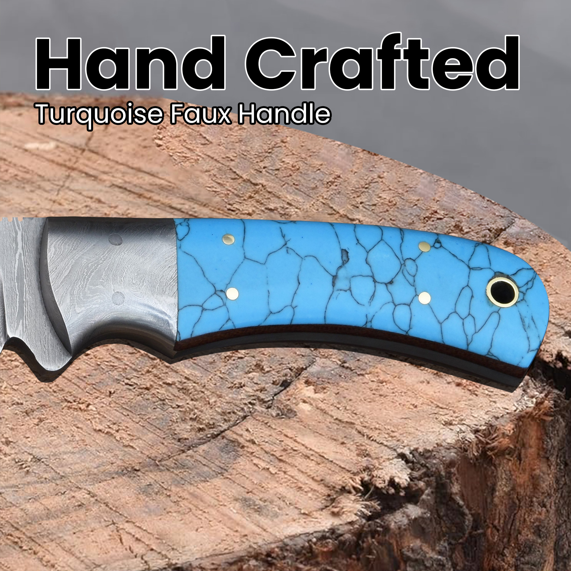 Stand out with this Knives Ranch Damascus Steel knife featuring a striking faux turquoise handle knife with varied design patterns on every piece. Combining artistry with cutting-edge performance, this blade is designed for collectors and enthusiasts.