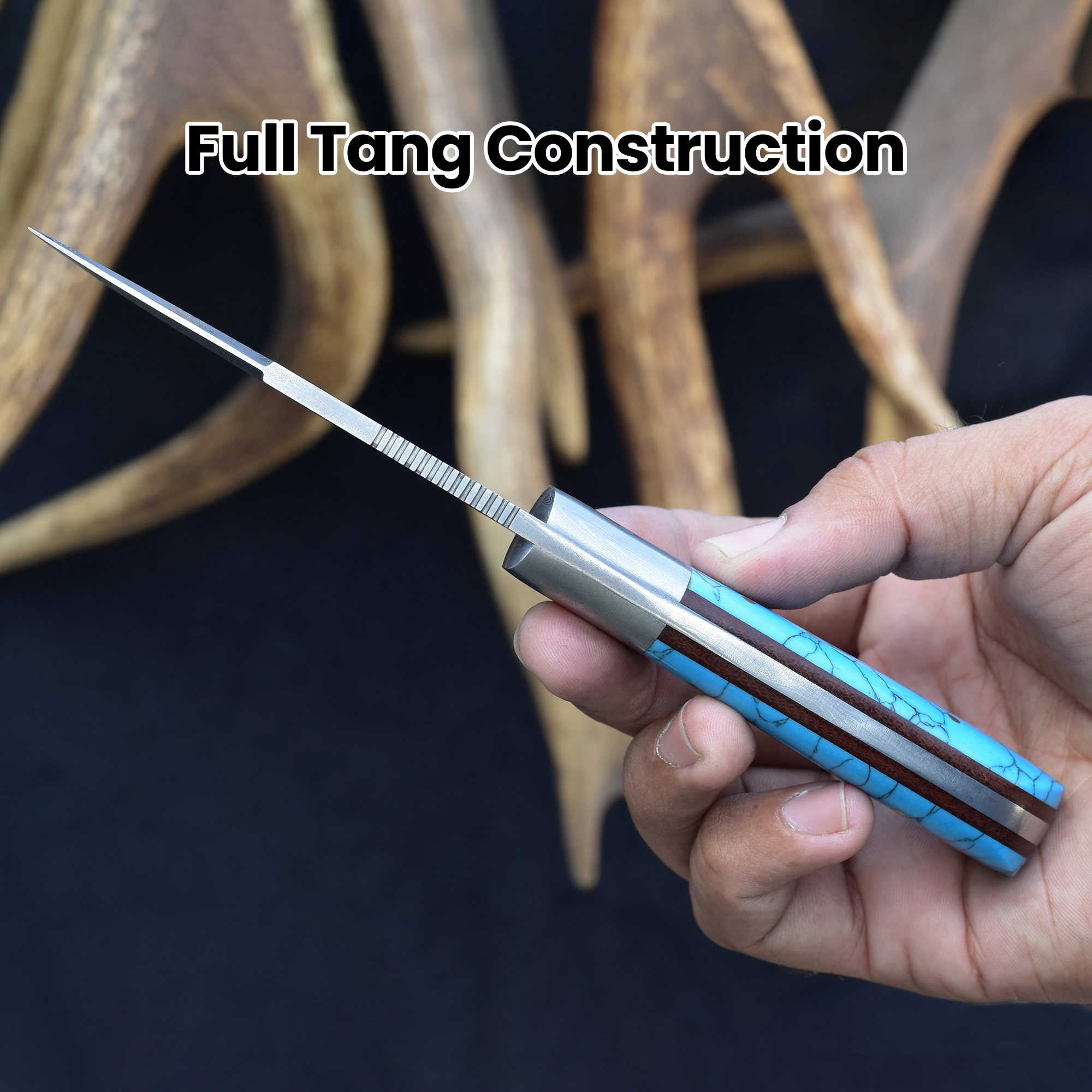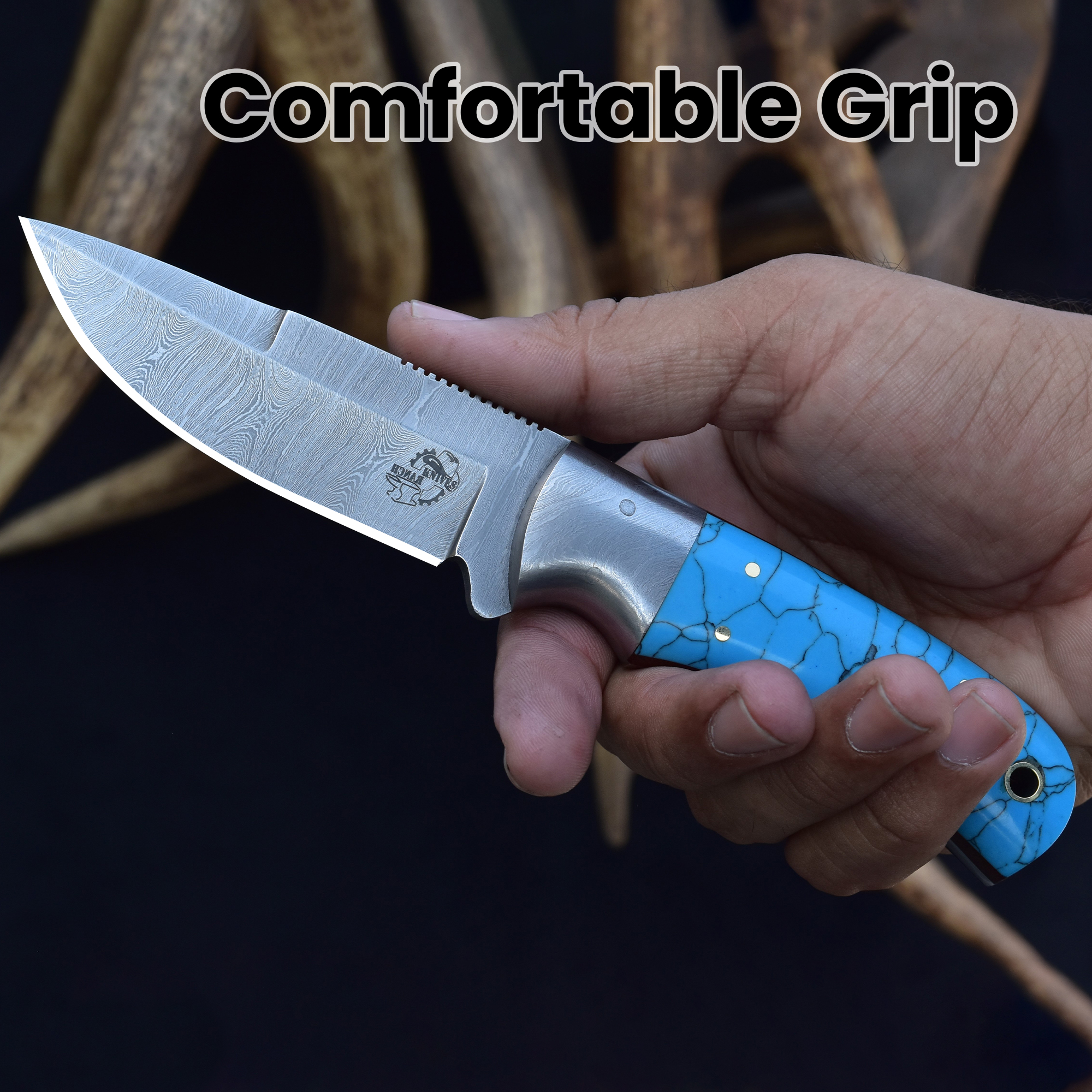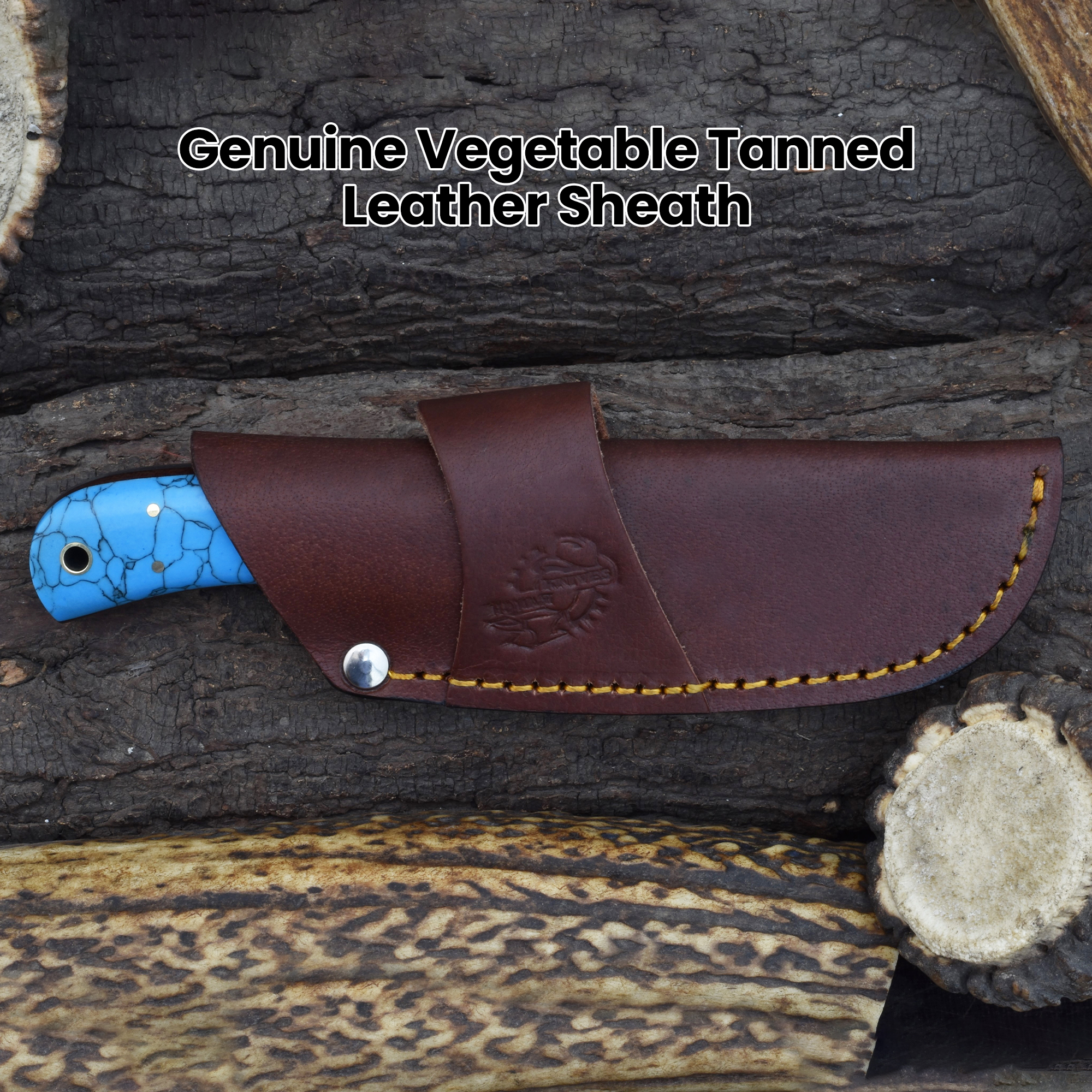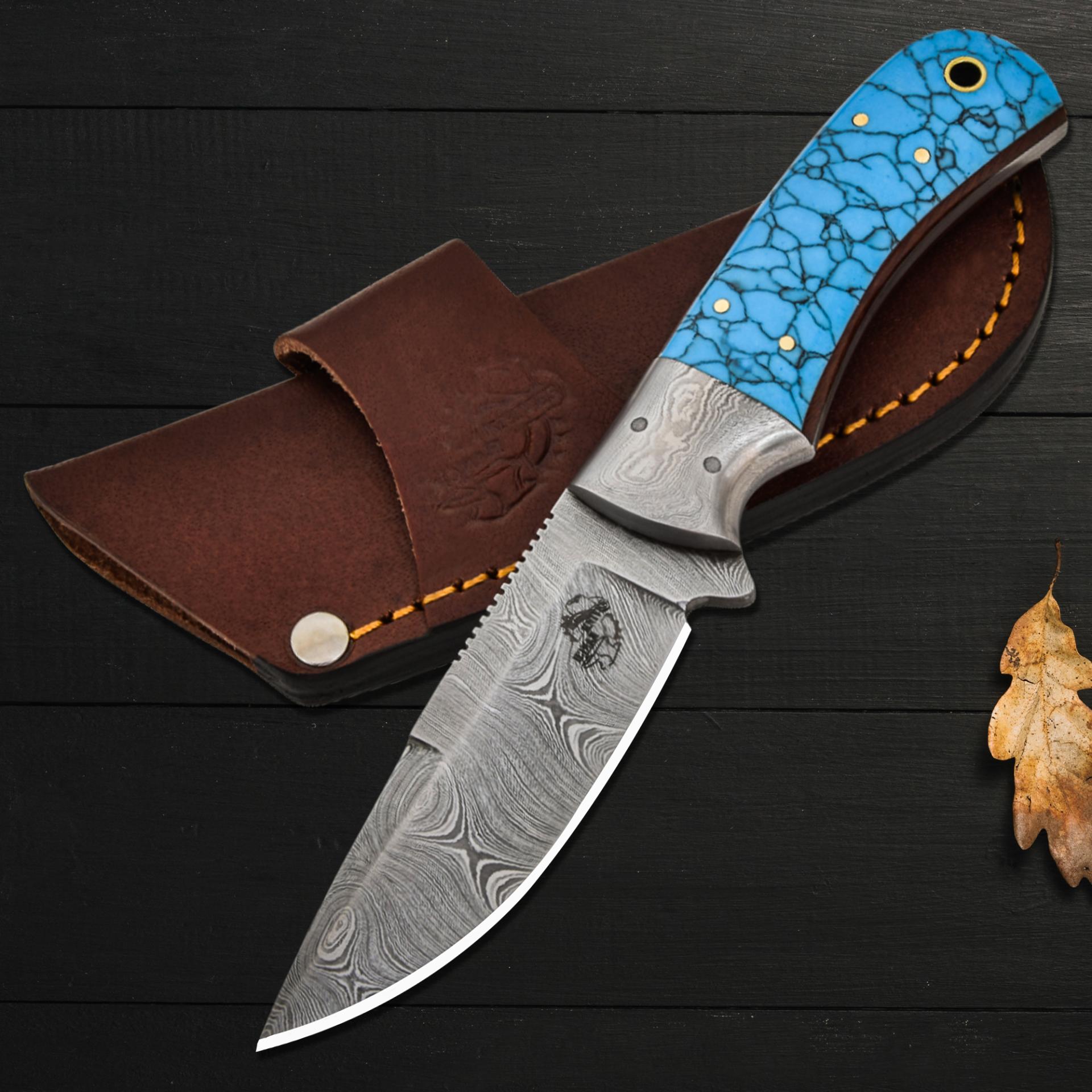This knife’s Damascus steel bolster provides balance and durability, complemented by a side mount sheath for ease of carry. The Damascus steel faux turquoise knife offers a bold style, while the handcrafted blade delivers reliable sharpness and longevity.