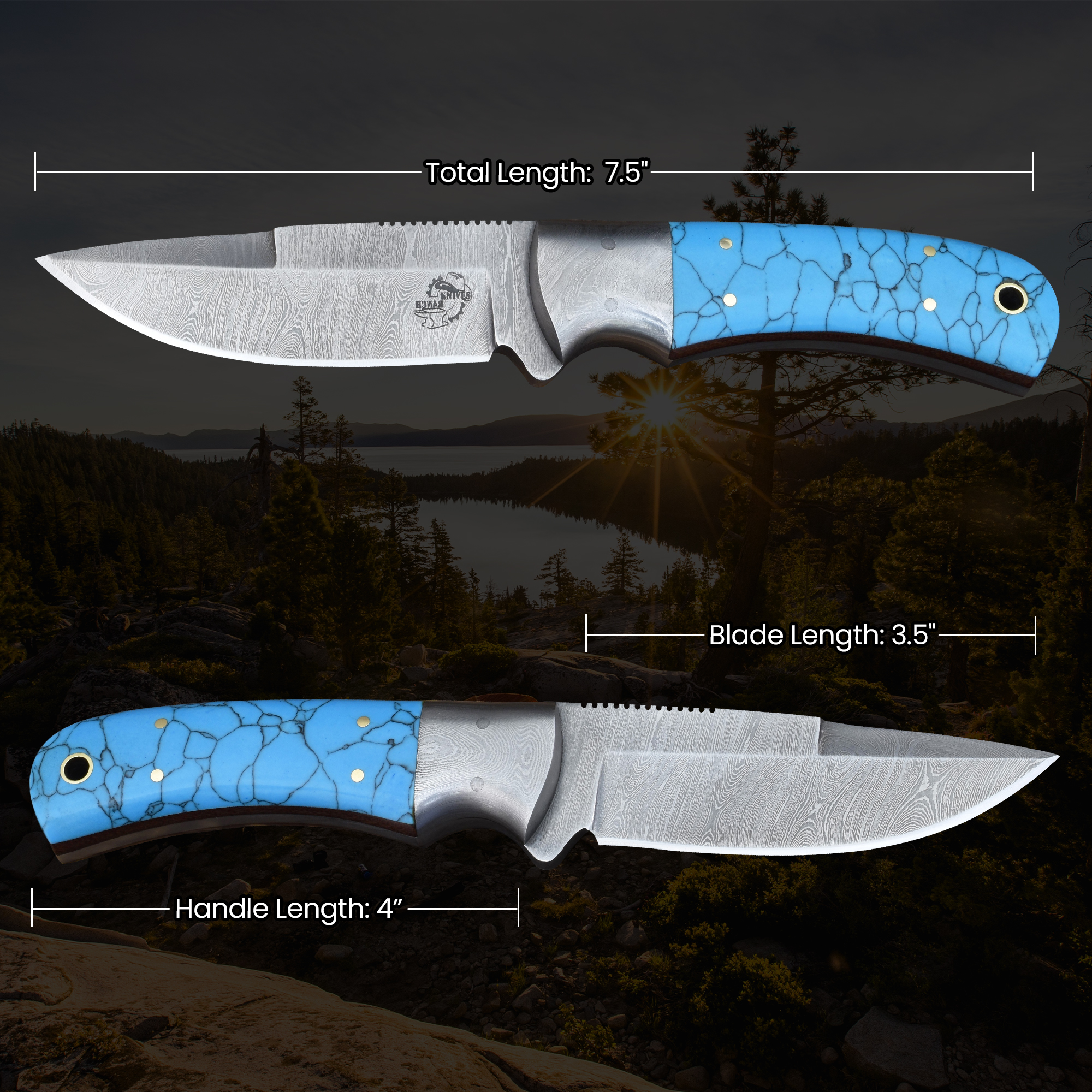 Knives Ranch Unique Damascus Steel knife with Faux Turquoise Handle and Side Mount Sheath
