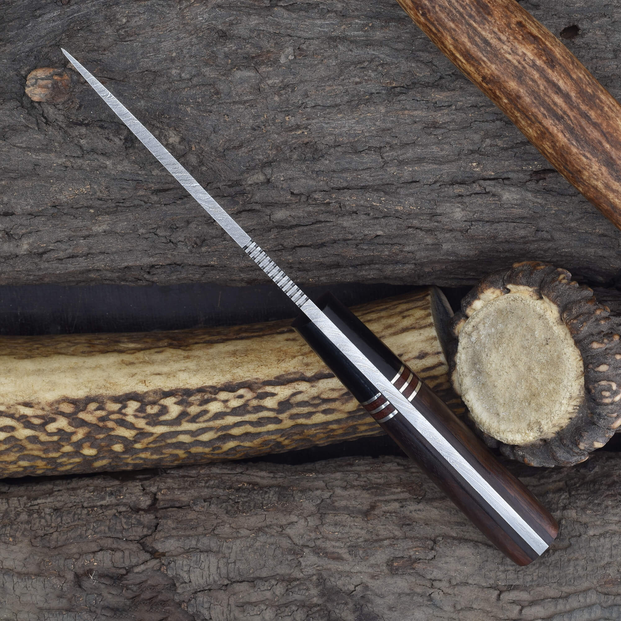 Add a touch of classic craftsmanship to your gear with this compact Damascus steel hunting knife from Knives Ranch. With its elegant rosewood handle and reliable build, it’s a trusted tool for outdoor enthusiasts and collectors alike.