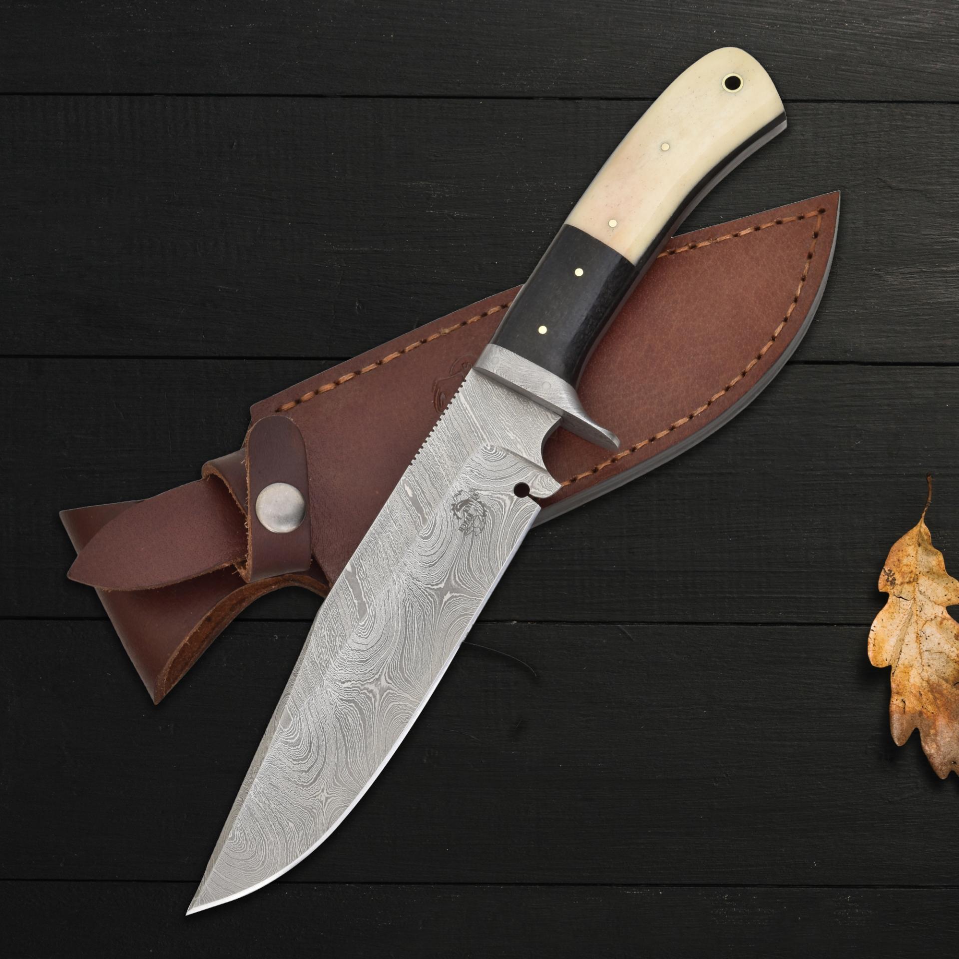 The Knives Ranch Damascus Bowie Knife is built for strength, style, and reliability. Featuring a 7" blade of hammer-forged Damascus steel (5160/4340), it offers outstanding edge retention, durability, and the distinctive layered pattern that makes Damascus legendary. The Damascus steel guard adds both protection and visual appeal, while the handle combines black burlap micarta and cow shin bone with a fiber liner for a secure grip and rugged elegance. Housed in a vegetable-tanned Leather sheath with a vertical belt loop, this Bowie knife is perfect for outdoor use, hunting, or display in a collection.