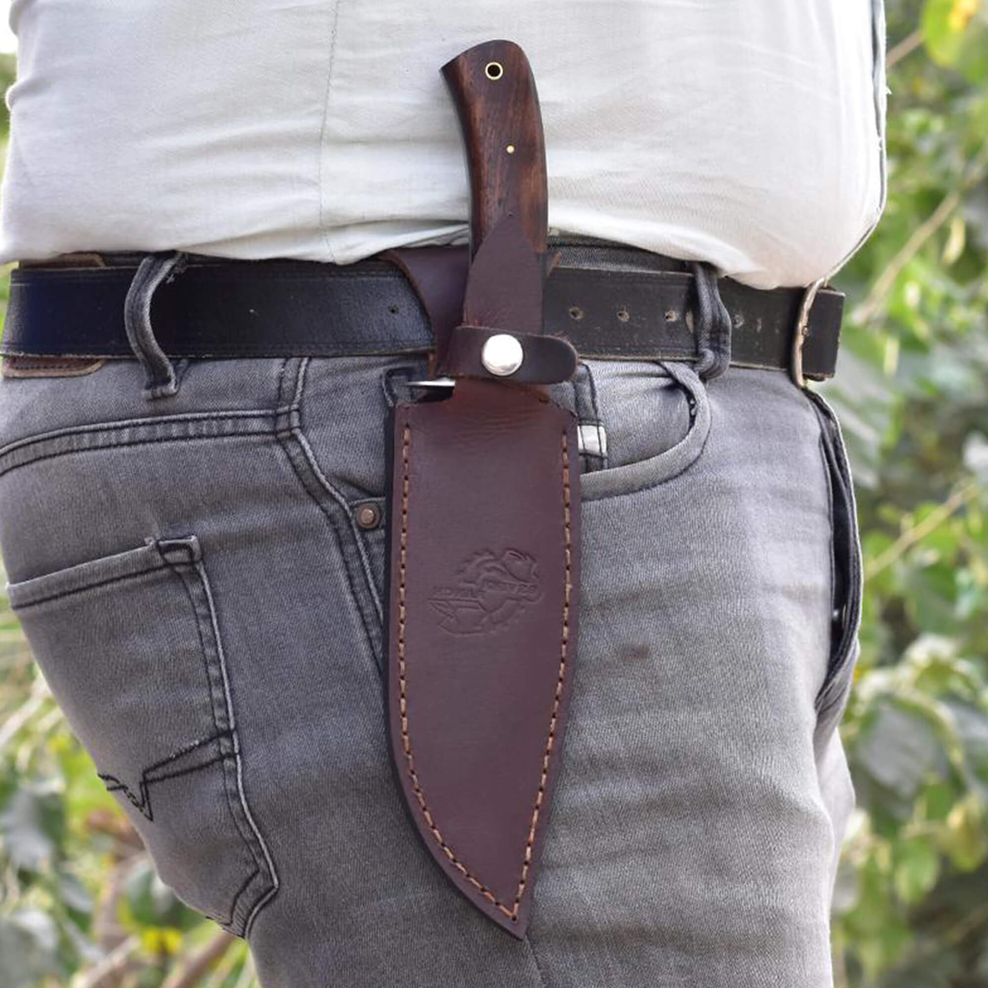 The stabilized rosewood handle ensures durability, comfort, and classic elegance, while the Damascus steel guard adds balance and refined detail. Complete with a vegetable-tanned leather sheath for secure vertical carry, this Bowie knife embodies strength, tradition, and artistry—making it a standout piece for both use and display.