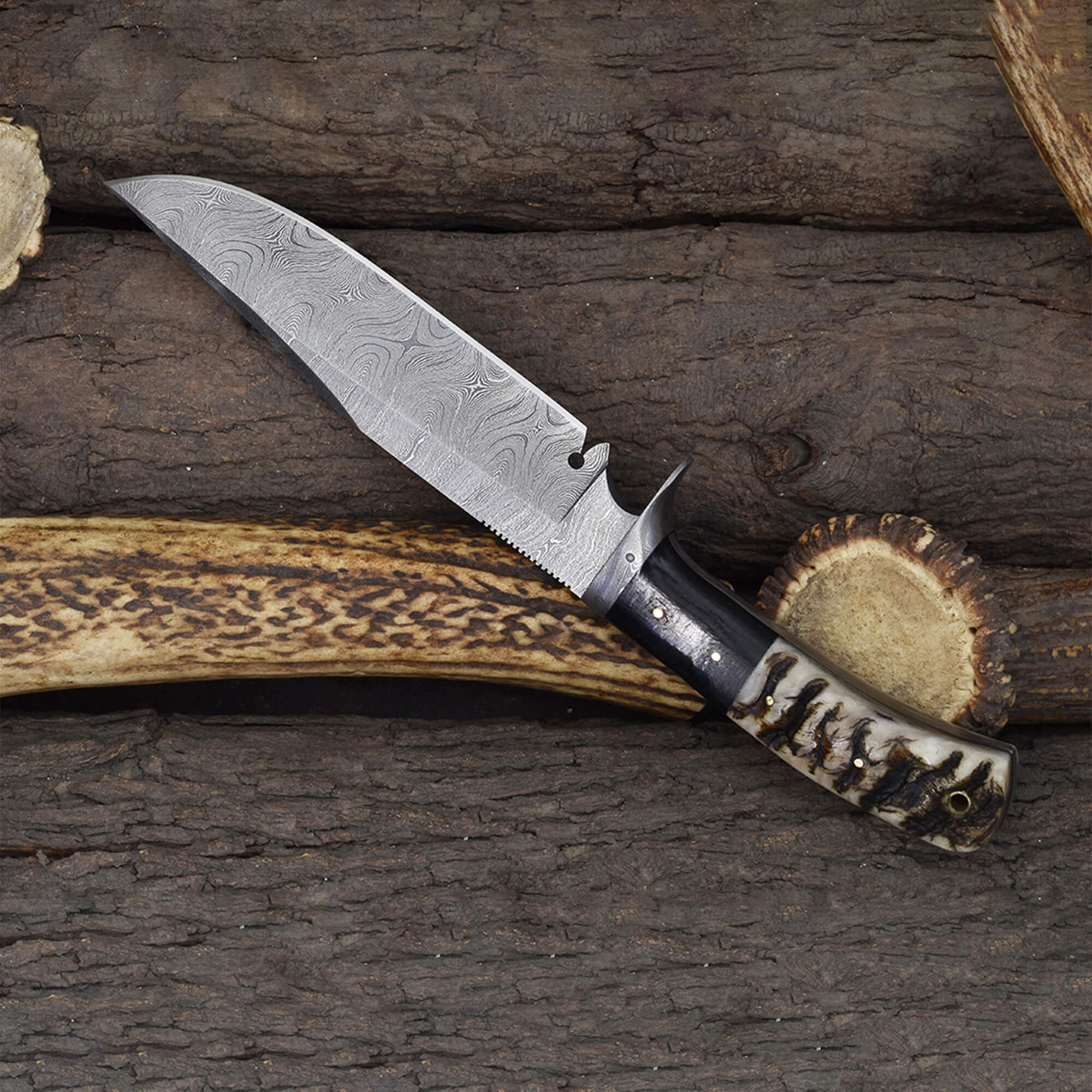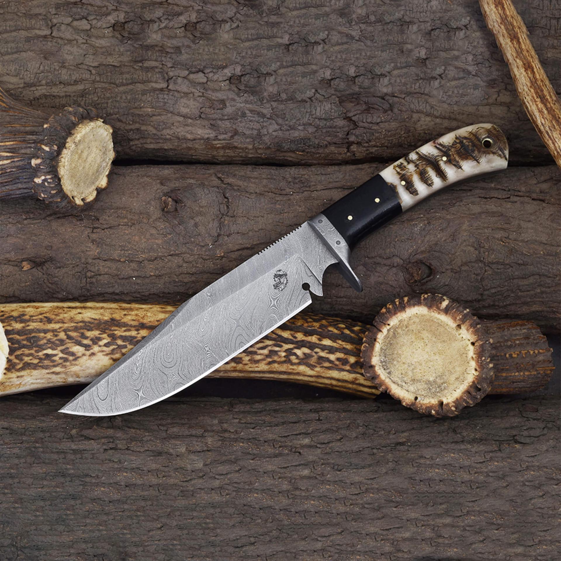 Knives Ranch Damascus Bowie Knife with Ram’s Horn Handle