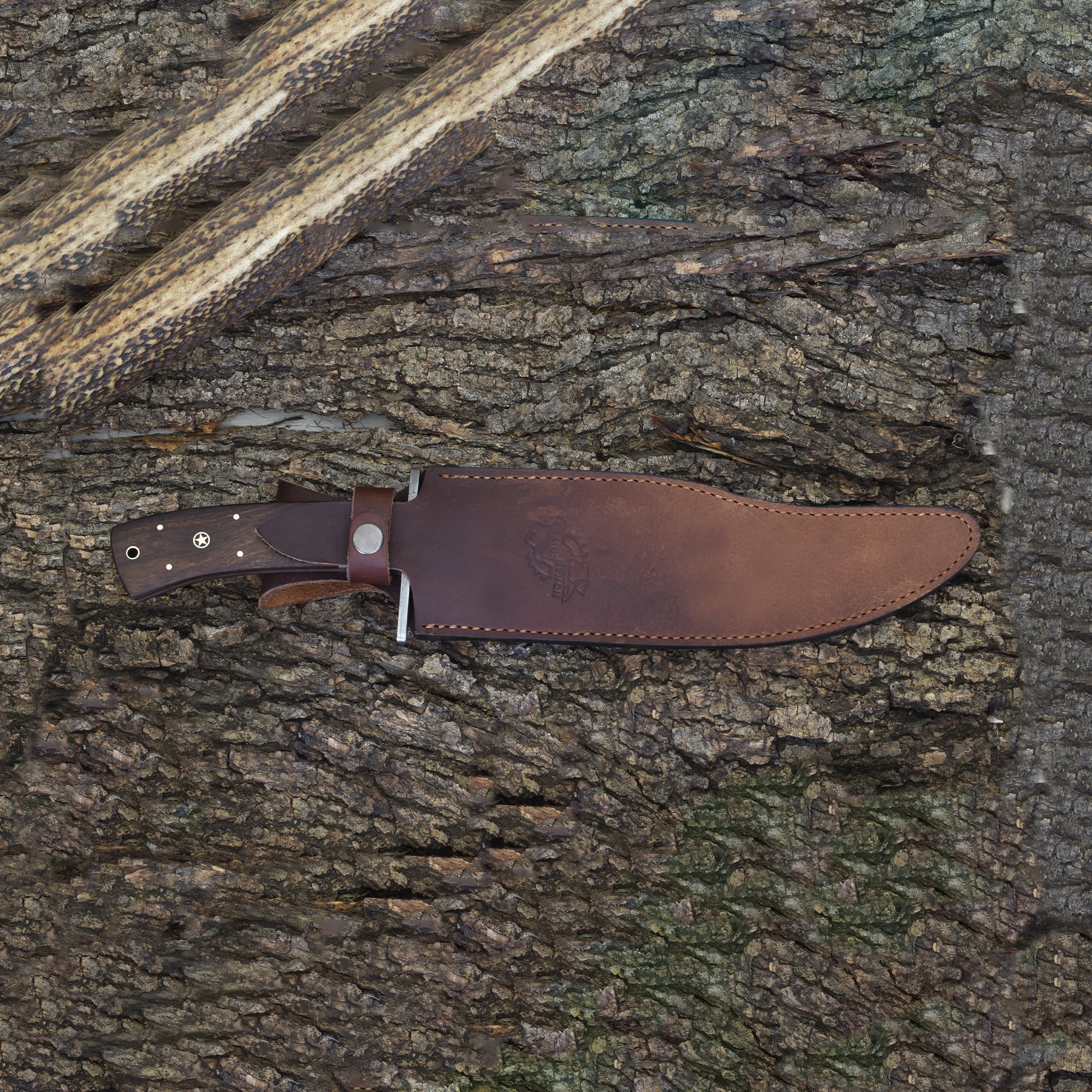 The Knives Ranch Damascus Bowie Knife combines bold design with exceptional craftsmanship. Its 9" Damascus steel blade with a 7/32" thickness delivers superior strength, cutting power, and the captivating patterns Damascus is known for. The Damascus steel guard offers both protection and style, while the full-tang construction ensures lasting durability. The handle, made from rosewood with intricate mosaic pins, provides a secure, comfortable grip with a touch of elegance. Complete with a vegetable-tanned leather sheath featuring a vertical belt loop, this Bowie knife is ideal for hunting, outdoor adventures, or as a standout piece in any collection.
