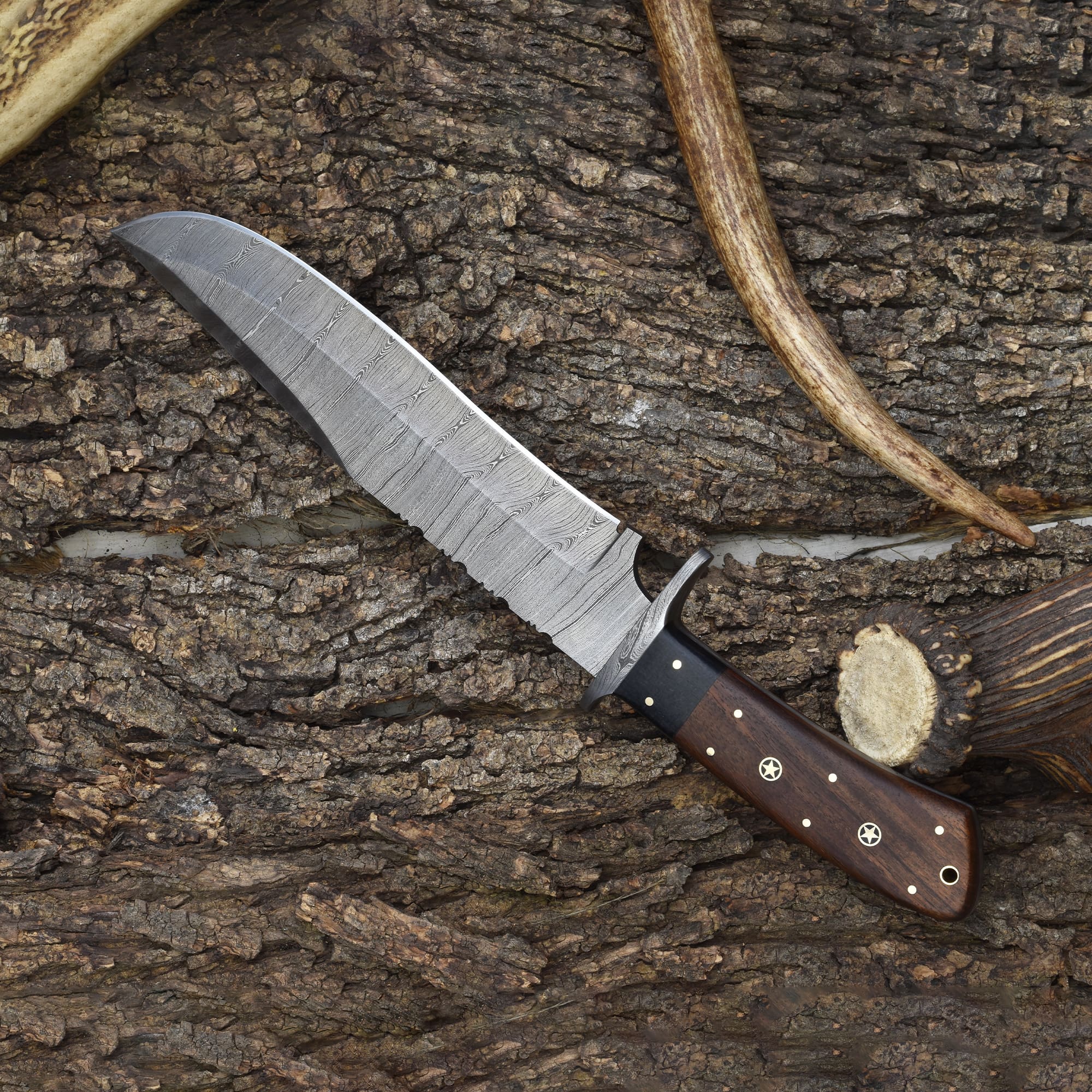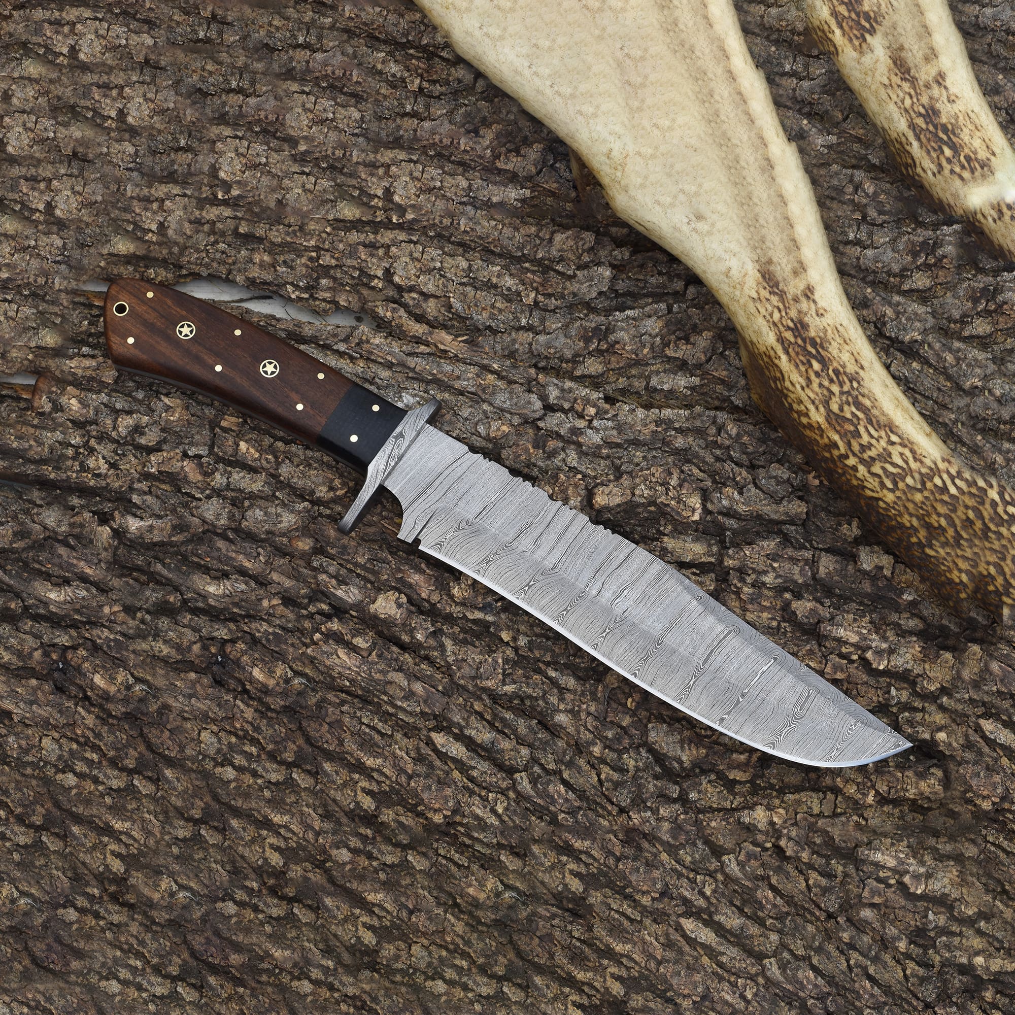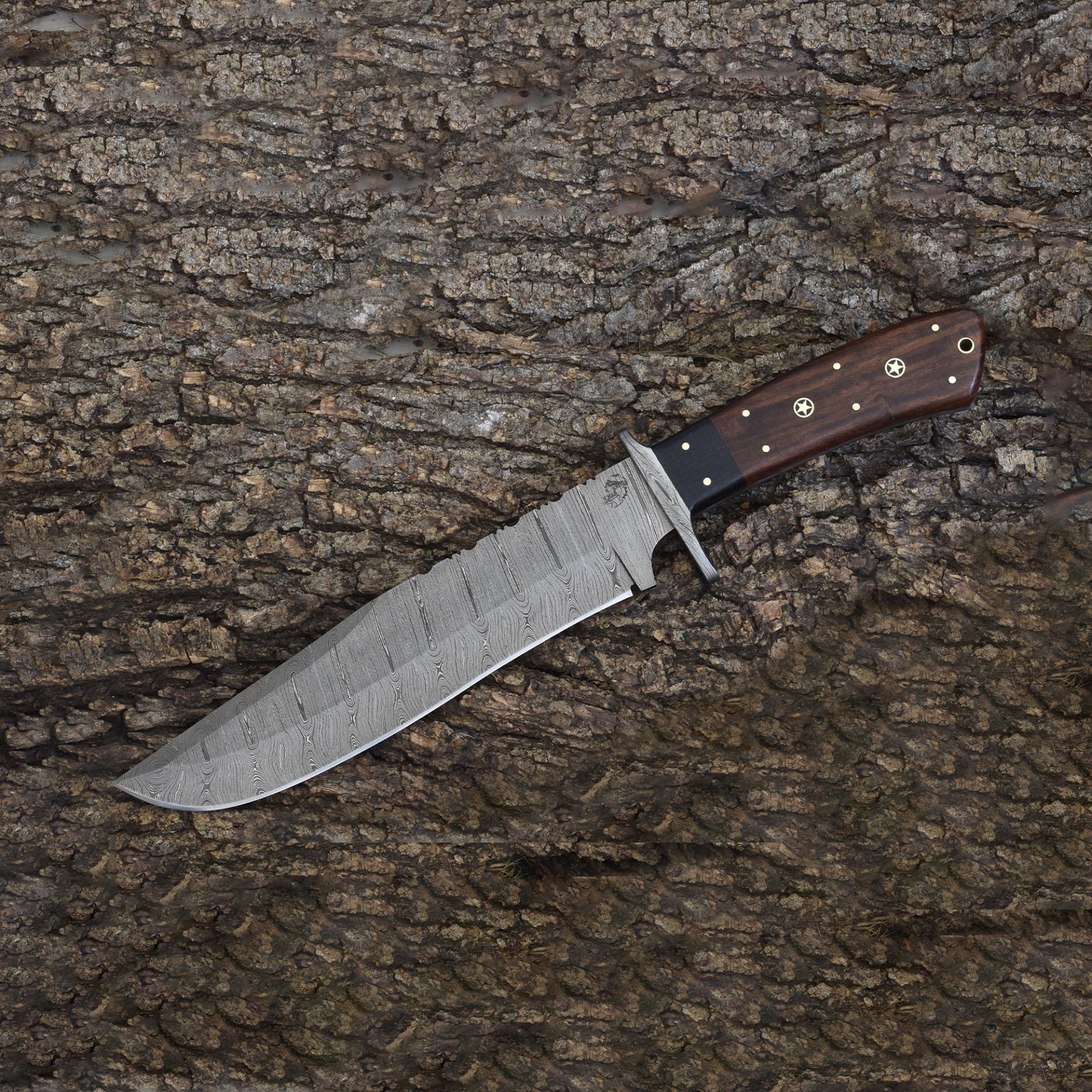 Engineered for outdoor excellence, the Knives Ranch Damascus Steel Bowie Knife is a blend of brute strength and refined artistry. Made from premium Damascus steel, this hand-forged blade offers razor-sharp cutting ability and a distinctive wave pattern that showcases true craftsmanship. Its rosewood handle with mosaic pins and a brass liner provides exceptional grip and balance, making it ideal for hunters, adventurers, and knife collectors.