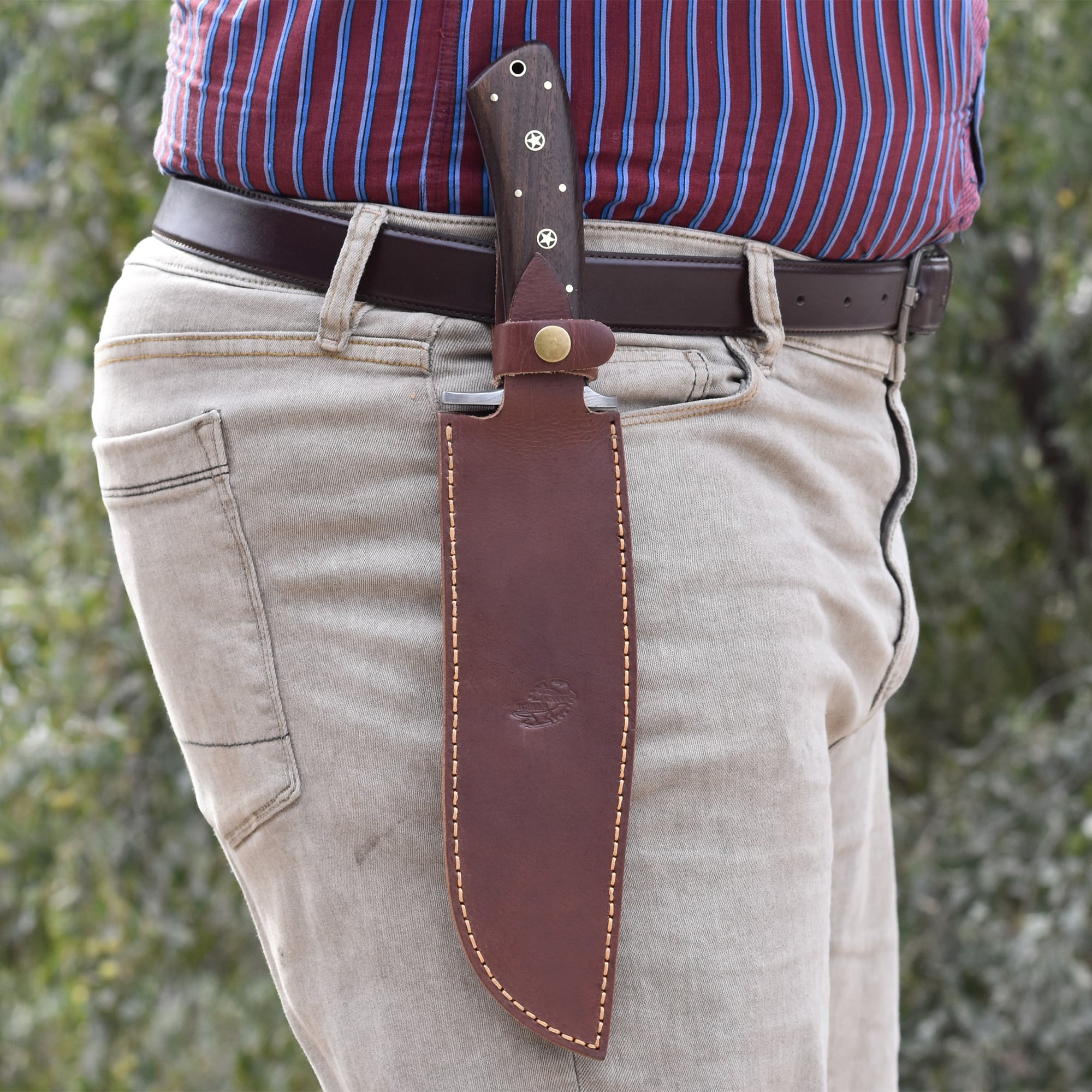 Whether you're heading into the wild or expanding your display collection, this rosewood Damascus Bowie knife offers serious functionality with elegant design. Carry it with pride in its durable Vegetable Tanned Leather sheath and enjoy the performance of a full tang Damascus hunting knife built to handle anything. The custom handcrafted Damascus Bowie knife is where beauty meets rugged utility.