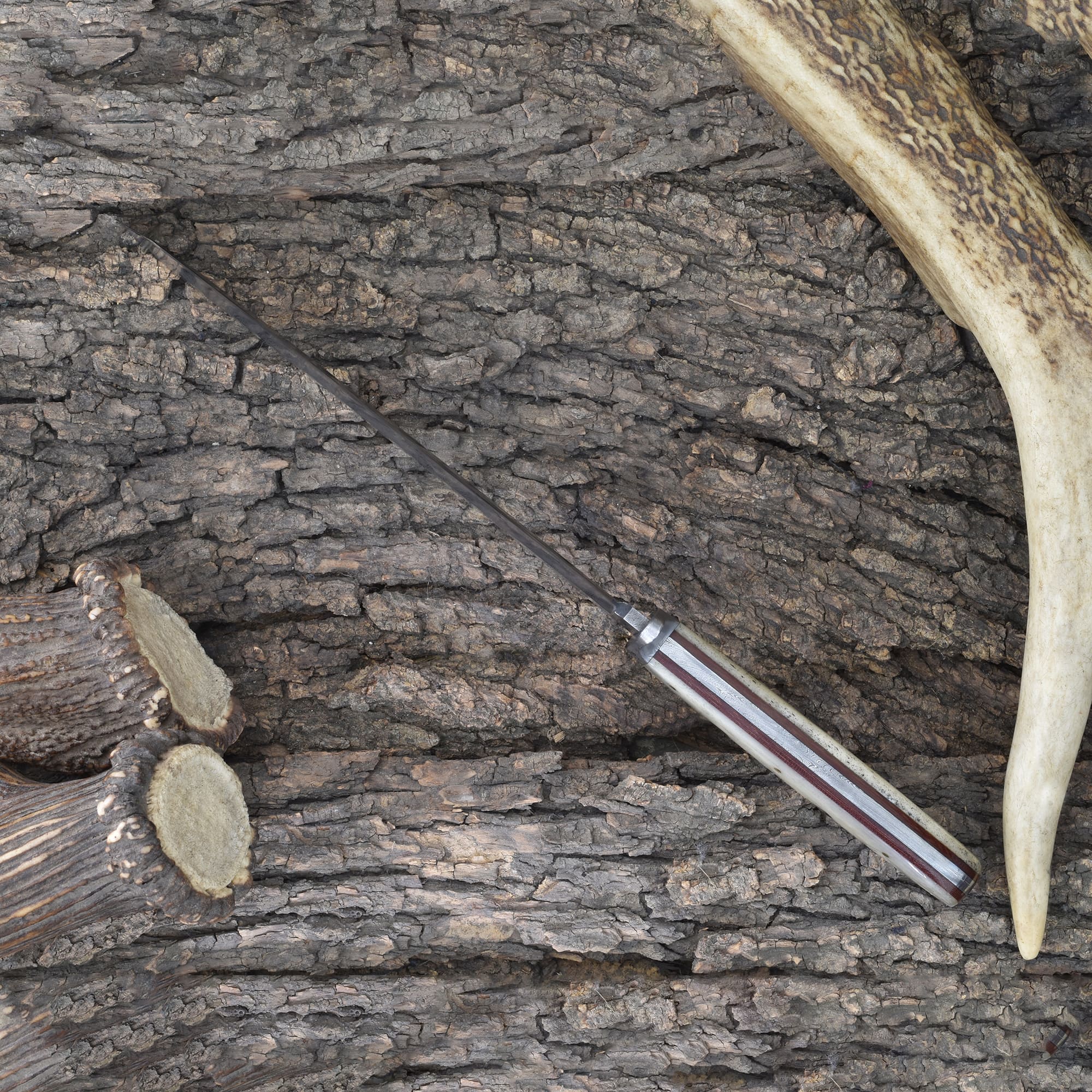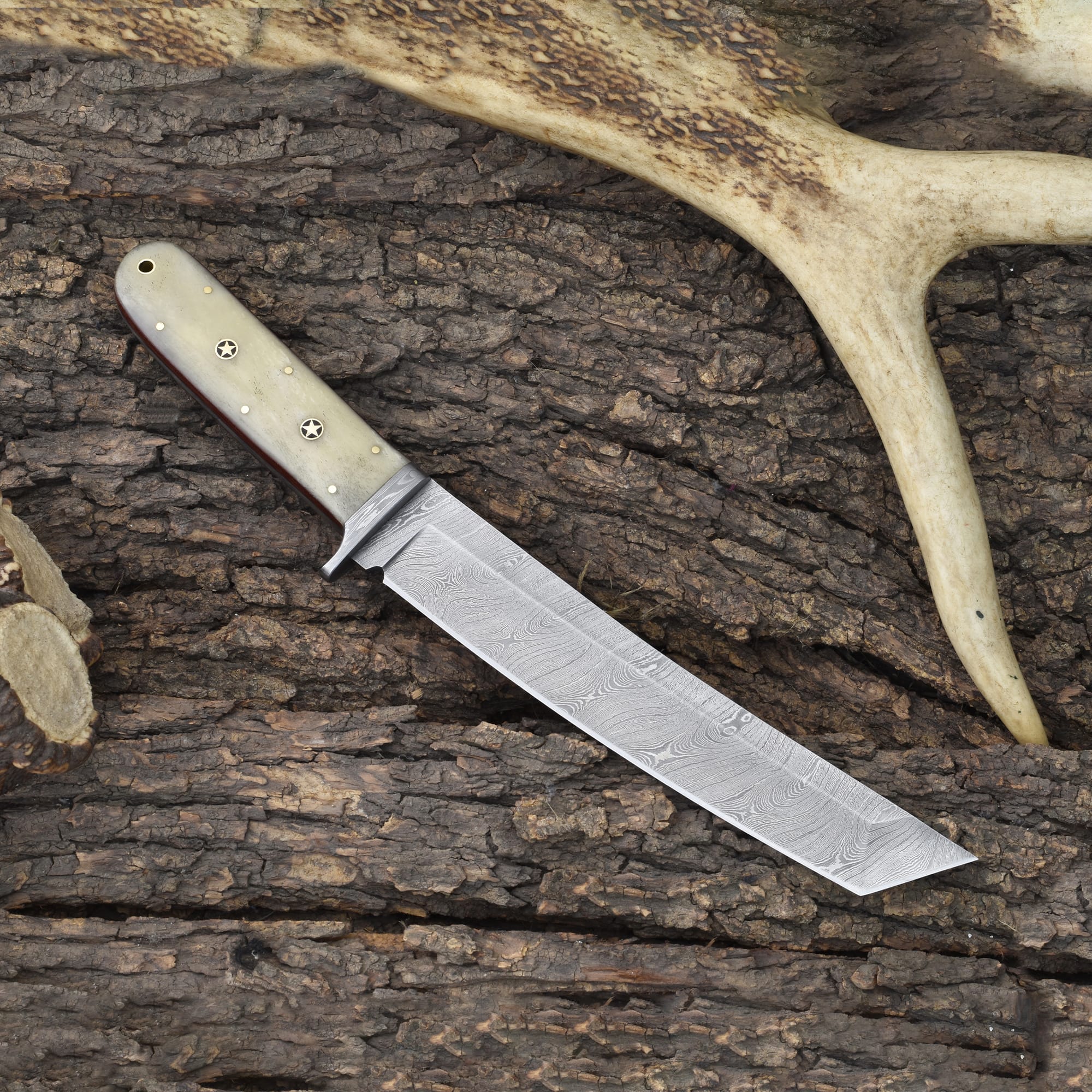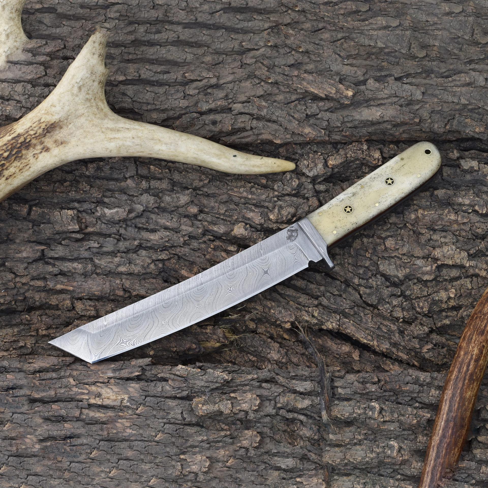 Experience strength, precision, and style with the Knives Ranch Damascus Tanto Knife. Expertly forged from high-quality Damascus steel, this blade delivers superior edge retention and reliability for demanding tasks. Its bone handle with fiber liner ensures a secure grip, making it perfect for outdoor adventures, tactical needs, and collectors alike.