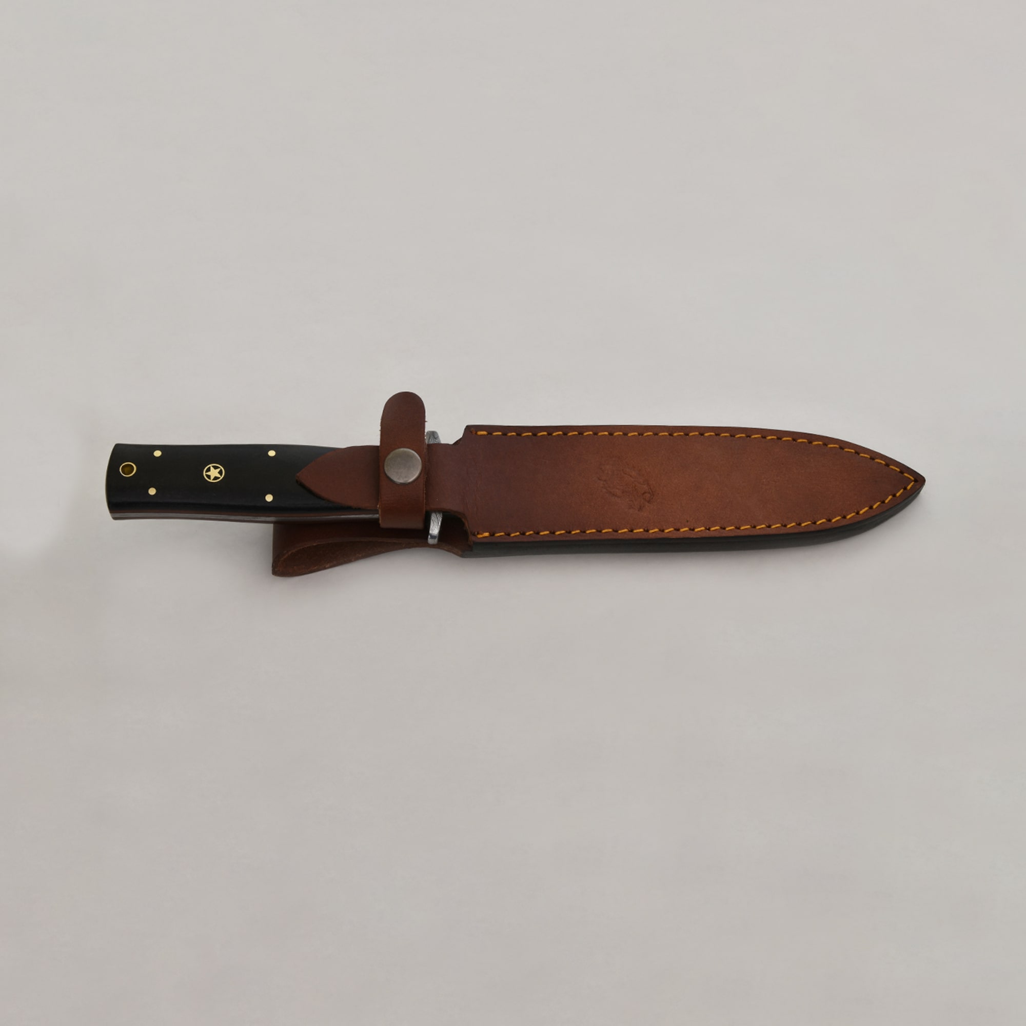 Striking in design and built for performance, the Knives Ranch Damascus Dagger features a 7" blade forged from Knives Ranch exclusive Damascus steel (5160/4340) for superior sharpness, durability, and edge retention. The Damascus bolster and pommel provide balance and strength, while the black burlap micarta handle with mosaic pins and fiber inserts offers a secure grip and distinctive style. Housed in a Vegetable Tanned Leather vertical belt loop sheath, this dagger is both functional and collectible.