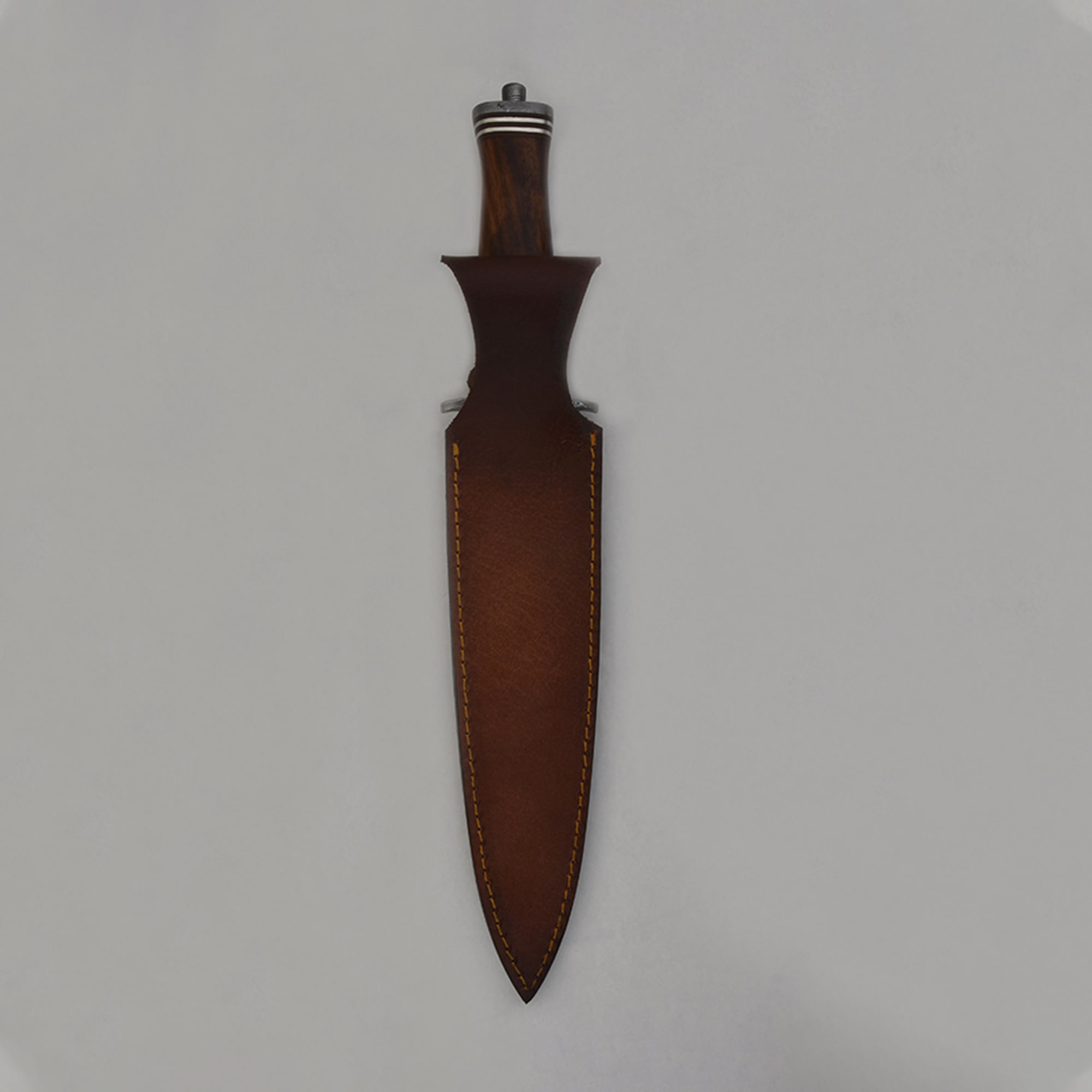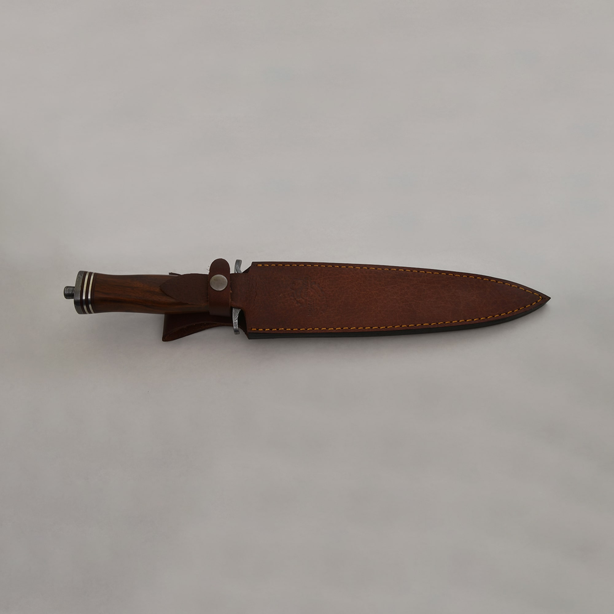 Impressive in both size and craftsmanship, the Knives Ranch Damascus Dagger is designed for collectors and enthusiasts who value strength and artistry. Featuring a 9-1/2" double-edged blade crafted from Knives Ranch exclusive Damascus steel (5160/4340), it delivers exceptional sharpness, durability, and edge retention. The Damascus bolster and pommel provide balance and rugged appeal, while the stabilized rosewood handle, accented with nickel silver and fiber inserts, ensures a secure grip with timeless elegance. Housed in a premium Vegetable Tanned Leather vertical belt loop sheath, this dagger combines power with refined style.