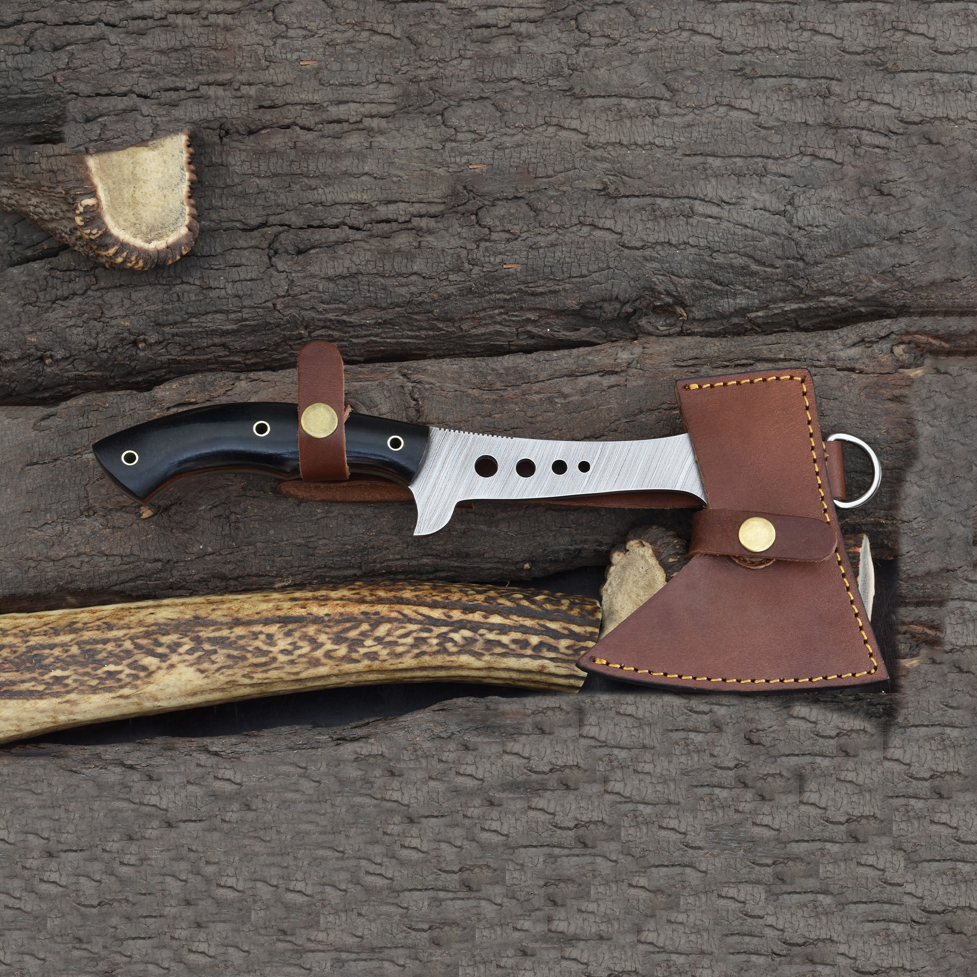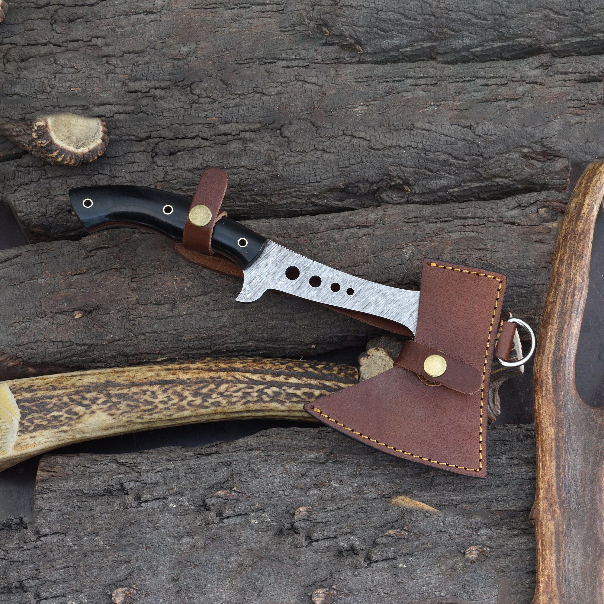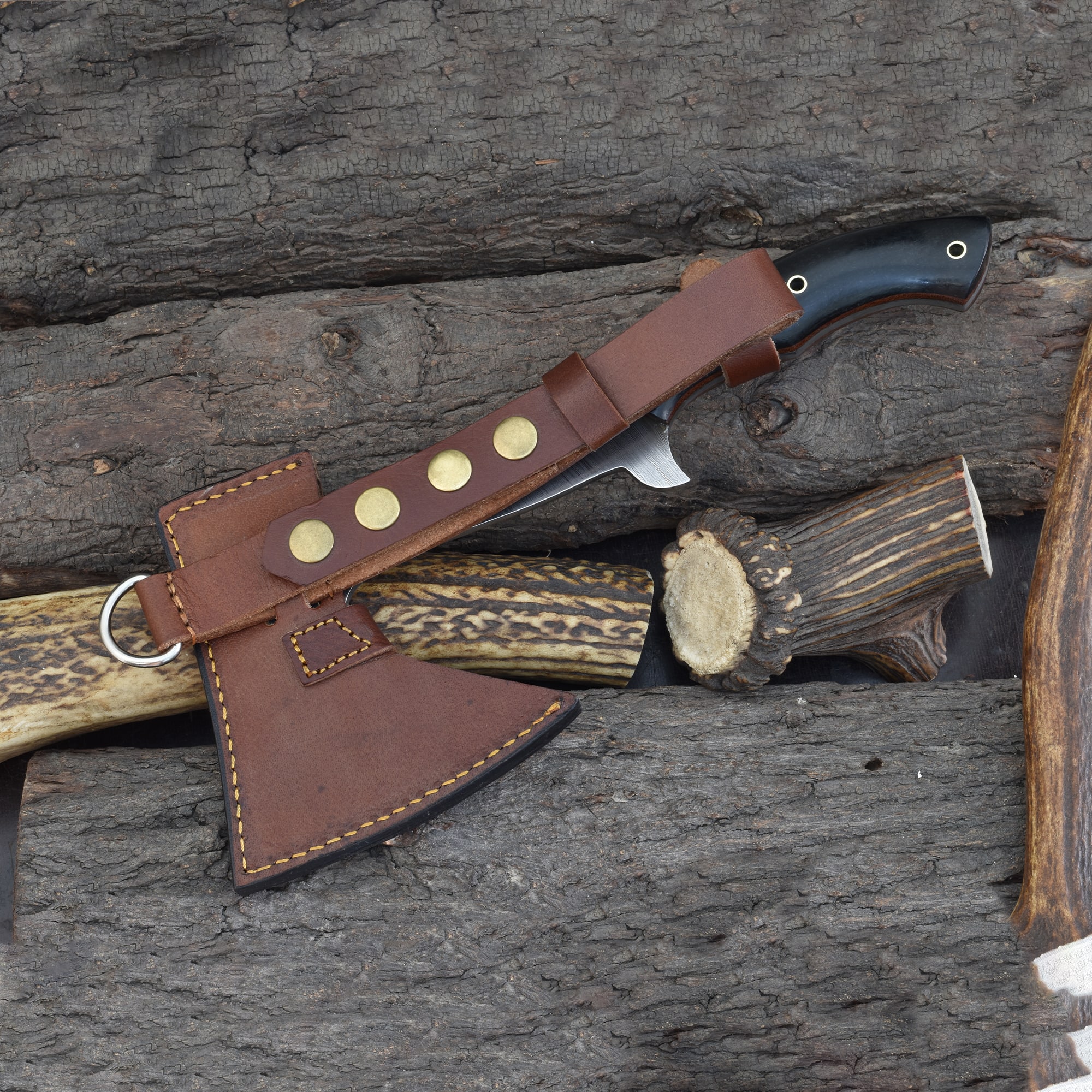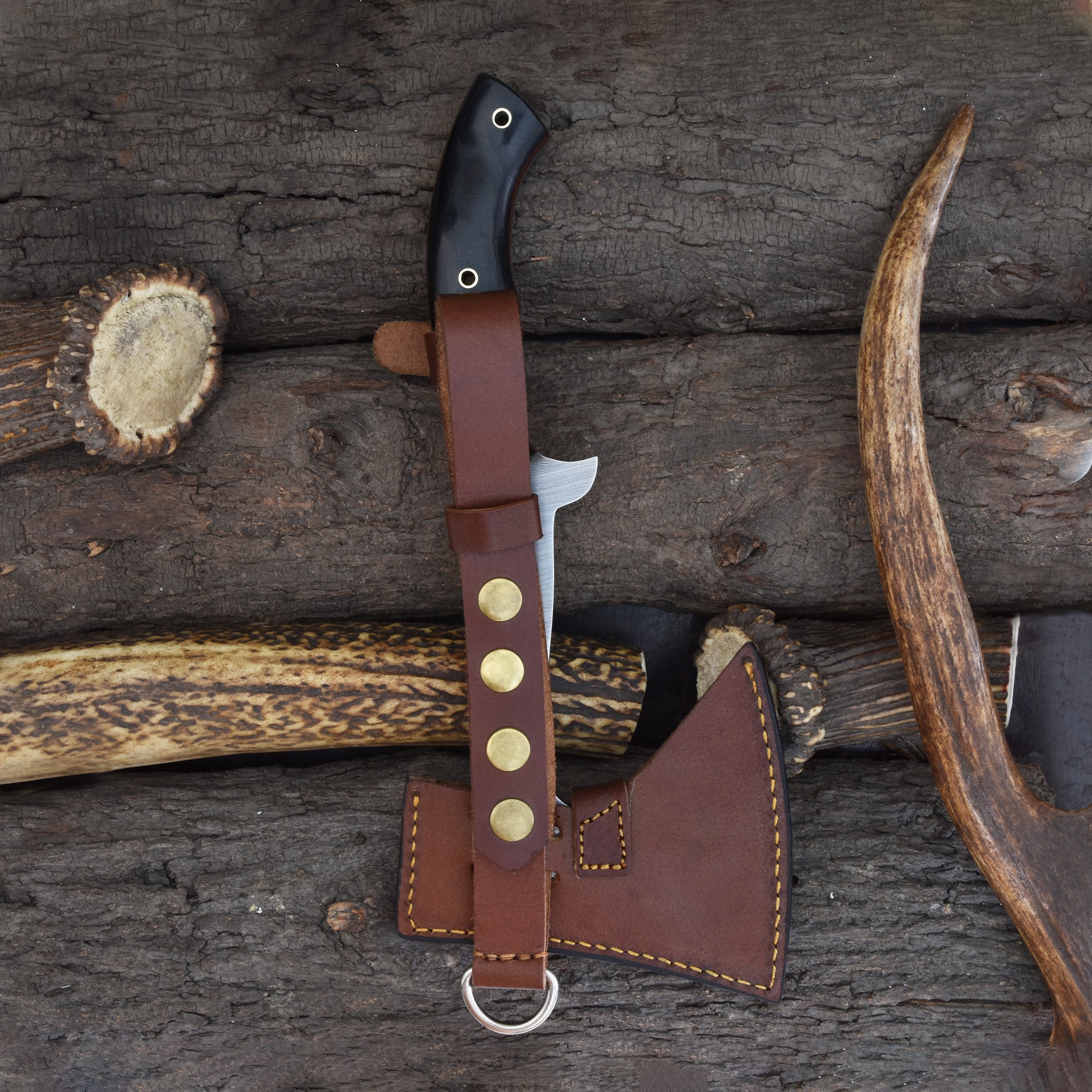 The Knives Ranch Damascus Steel Hatchet is a rugged tool built for power, precision, and durability. It's a 3-1/2" Damascus steel blade with a 3/16" thickness that delivers exceptional chopping strength, edge retention, and the signature layered patterns of Damascus craftsmanship. The 5-1/2" handle, made from black micarta, offers a secure, comfortable grip even in challenging conditions. Paired with a vegetable-tanned Leather sheath featuring a vertical loop, this hatchet is ideal for camping, bushcraft, hunting, or display in a fine tool collection.