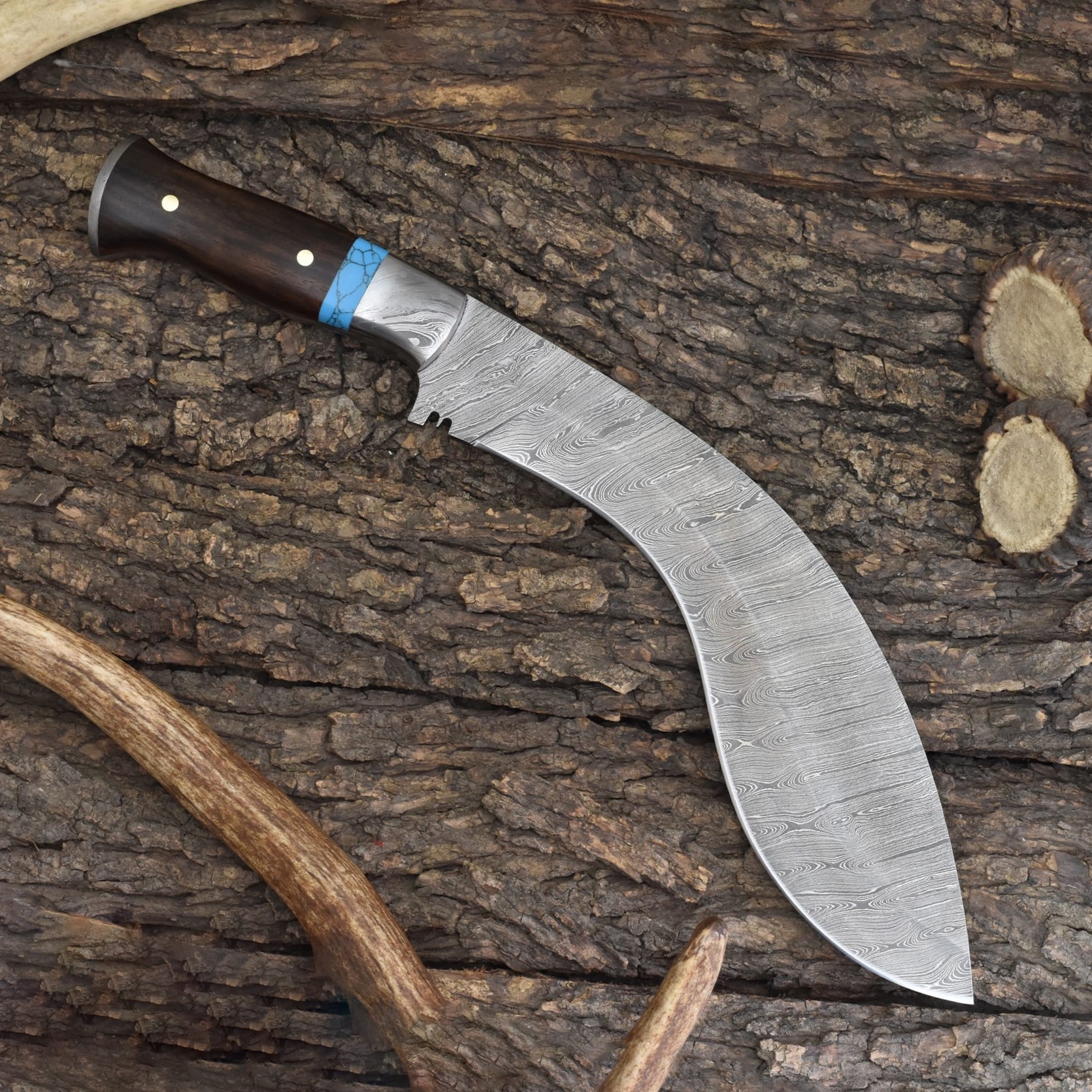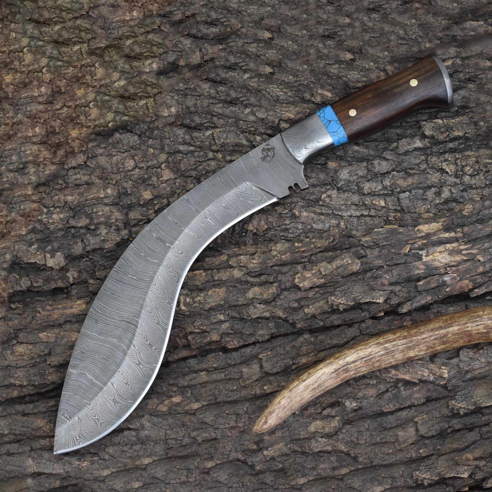 Premium Knives Ranch Damascus Kukri Knife with Walnut & Turquoise Handle