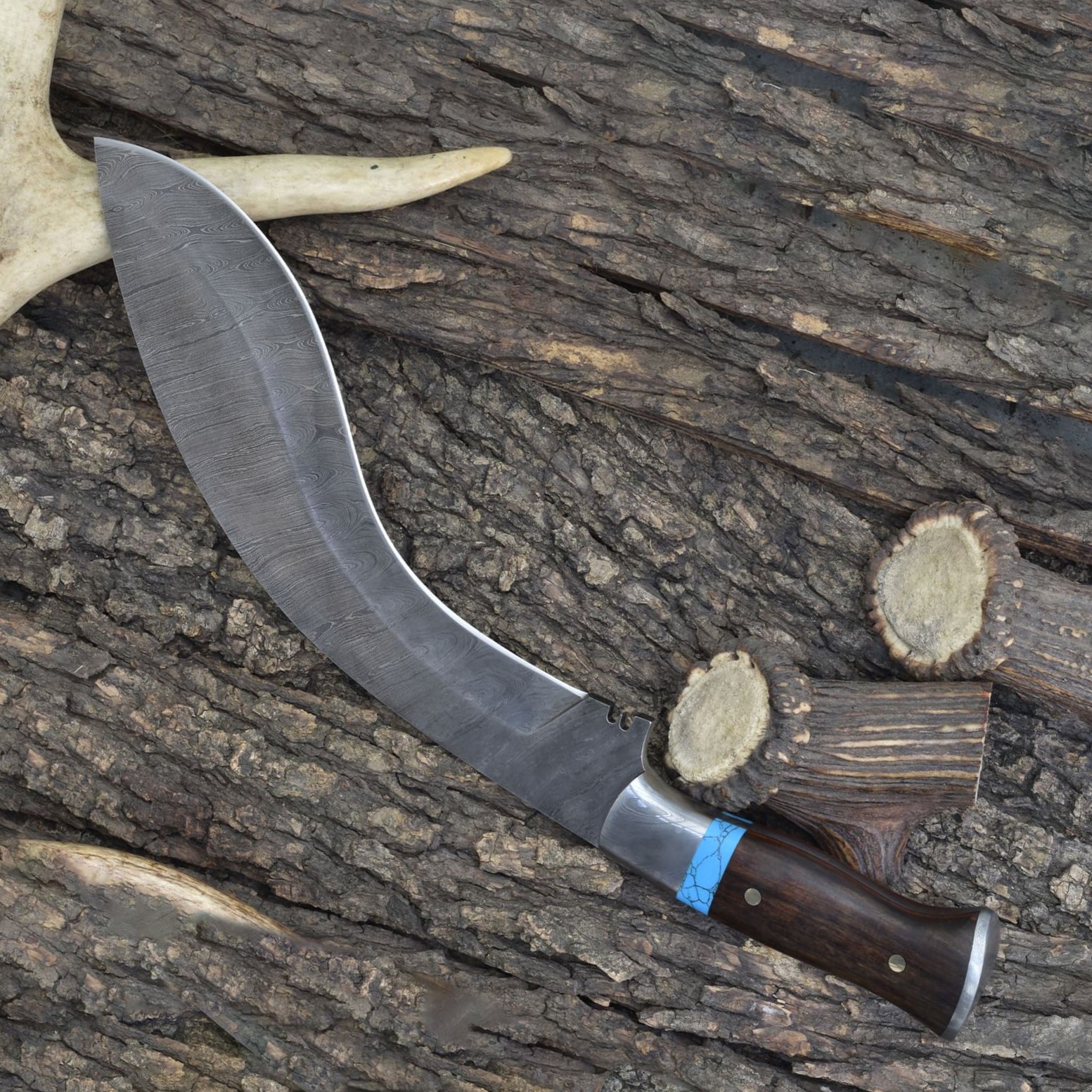 Upgrade your gear with the Knives Ranch Damascus kukri knife, built for power and precision in the toughest conditions. Perfect as a Knives Ranch Damascus survival kukri knife, it excels in fieldwork, chopping, and self-defense. For adventurers and collectors alike, the Knives Ranch Damascus steel kukri with walnut and turquoise handle combines unmatched performance with breathtaking design.