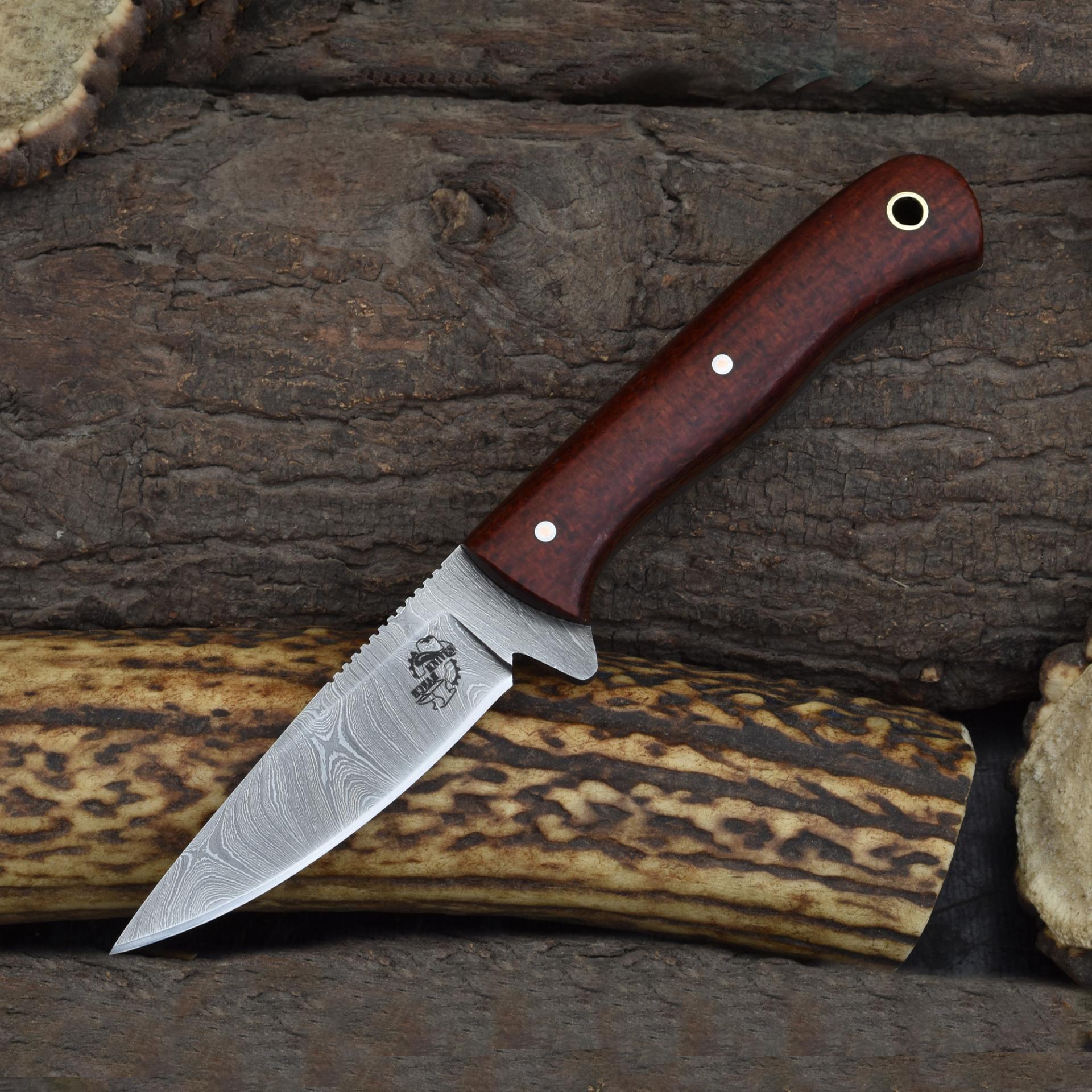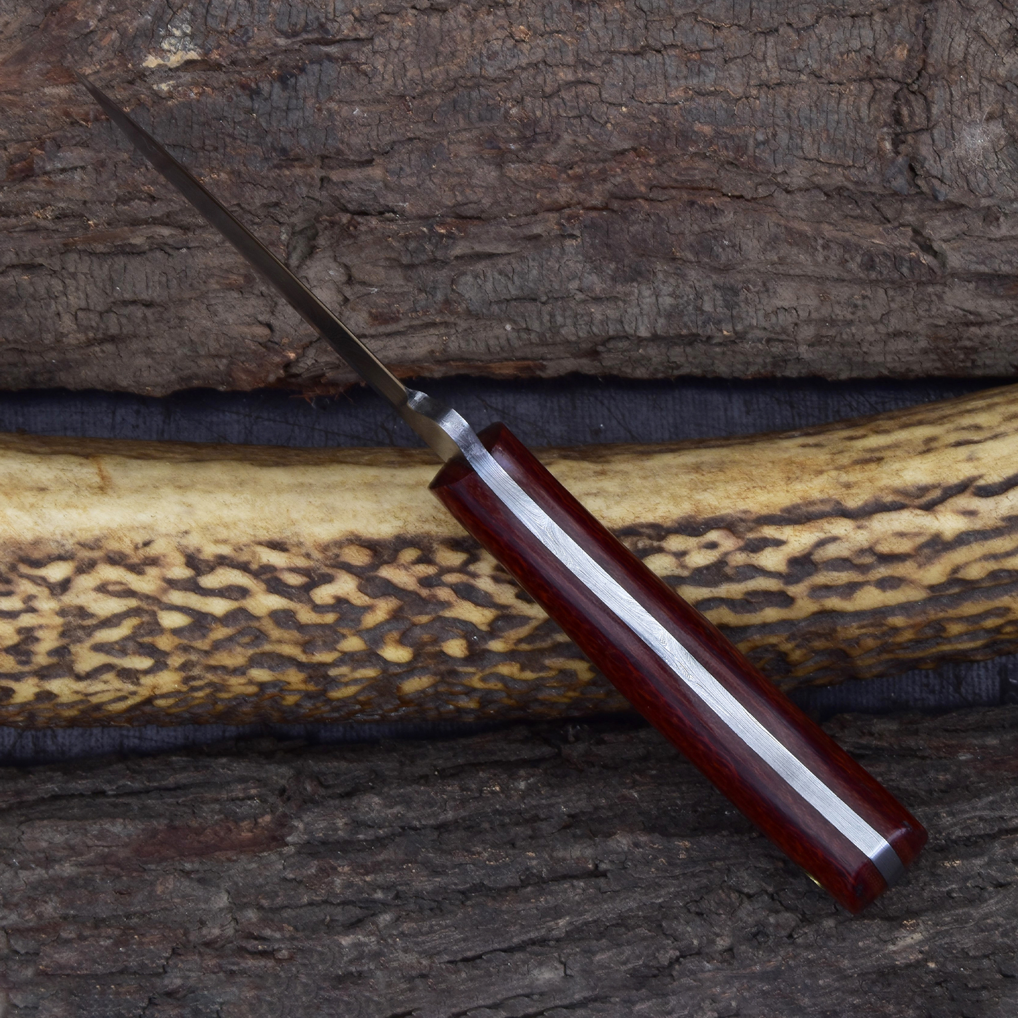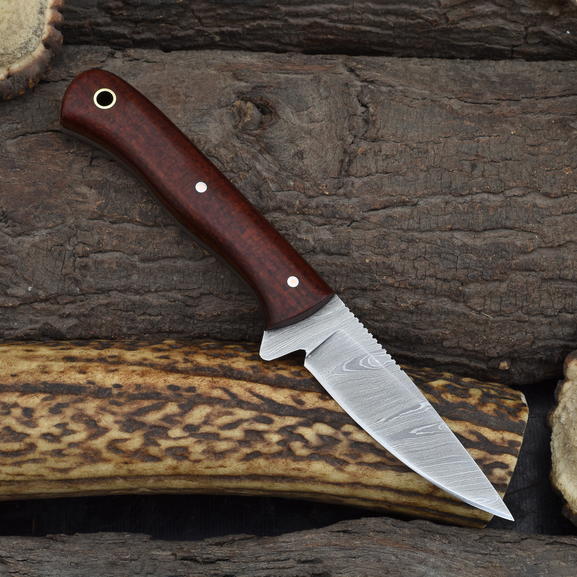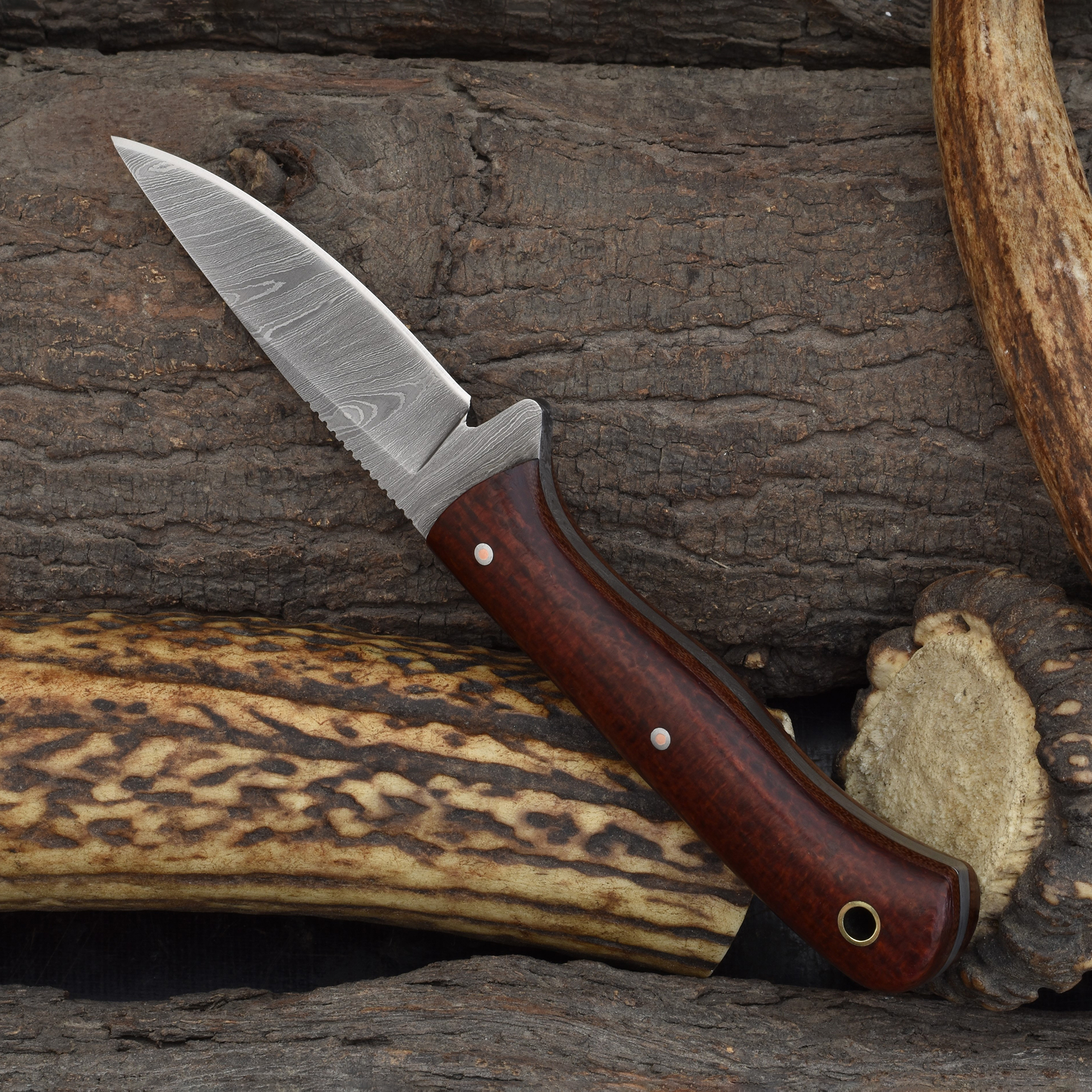 Elevate your everyday carry with the Knives Ranch Damascus EDC Knife, crafted for precision, durability, and style. Hand-forged from high-quality Damascus steel, this blade offers outstanding sharpness and edge retention for all daily tasks and outdoor adventures. The scarlet burlap micarta handle provides a secure, comfortable grip while adding a bold, rugged aesthetic to your gear.