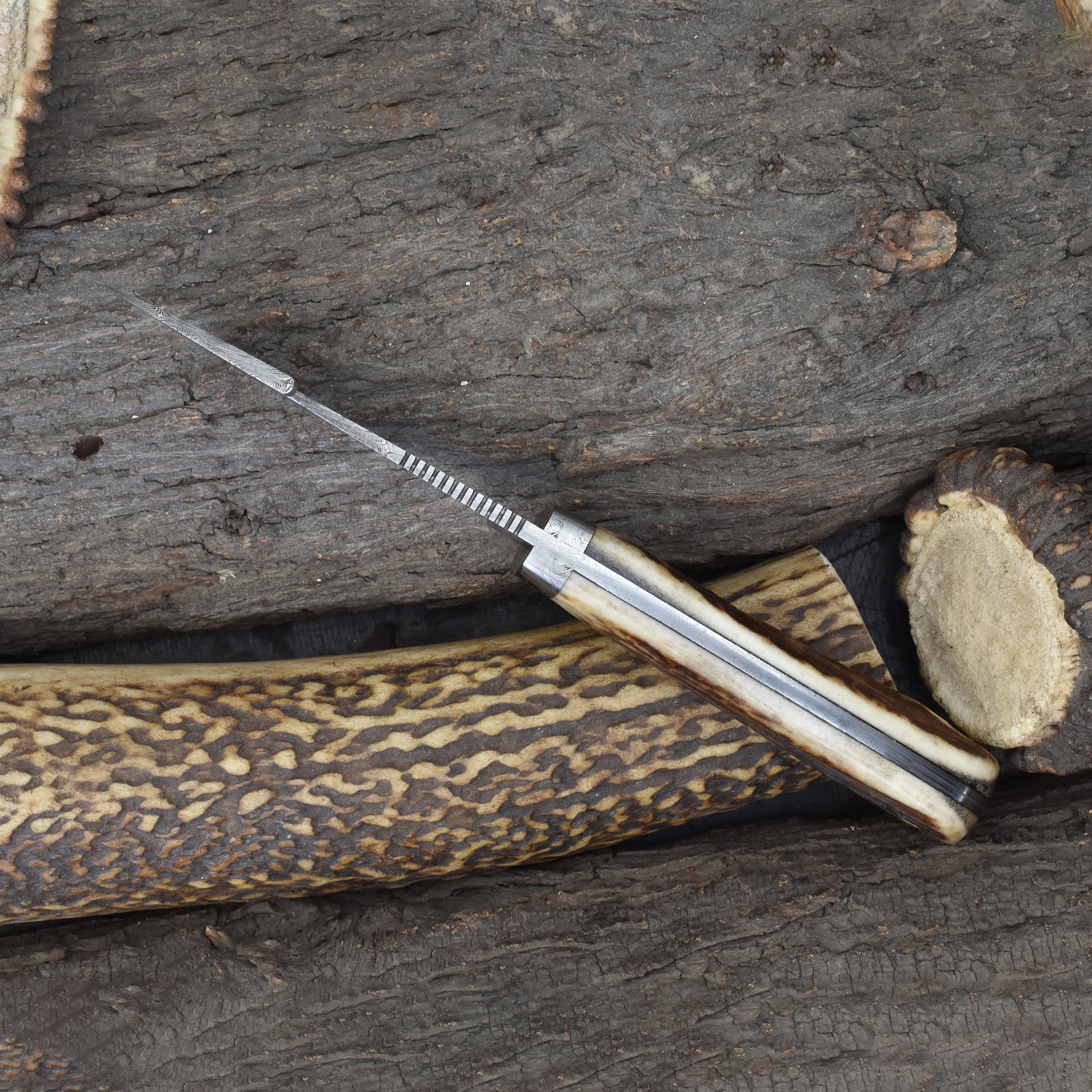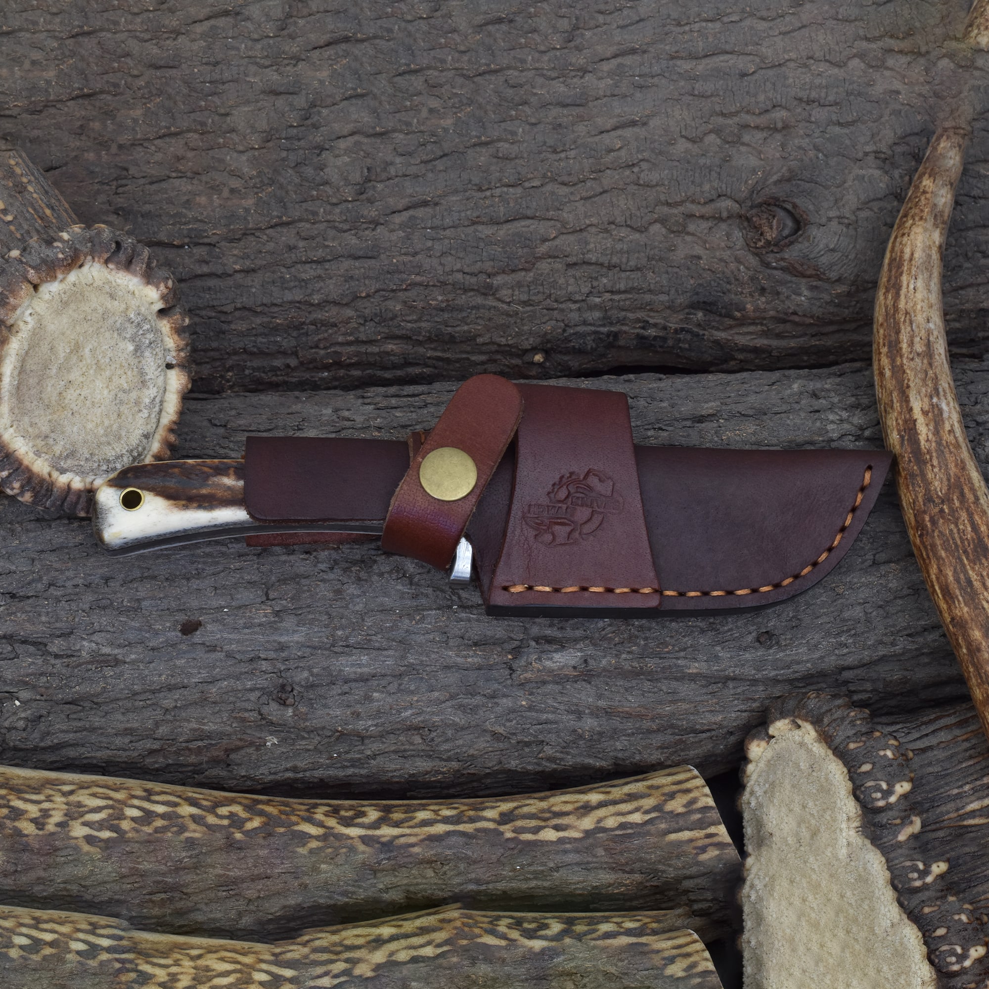 Master field dressing and outdoor tasks with the Knives Ranch Damascus Gut Hook Knife, expertly crafted for precision and durability. Forged from premium Damascus steel, this 3-1/2" blade features a sharp gut hook for easy skinning and a sturdy cutting edge for versatile use. The elegant stag handle provides a comfortable and secure grip, while the Damascus steel bolster enhances strength and control.