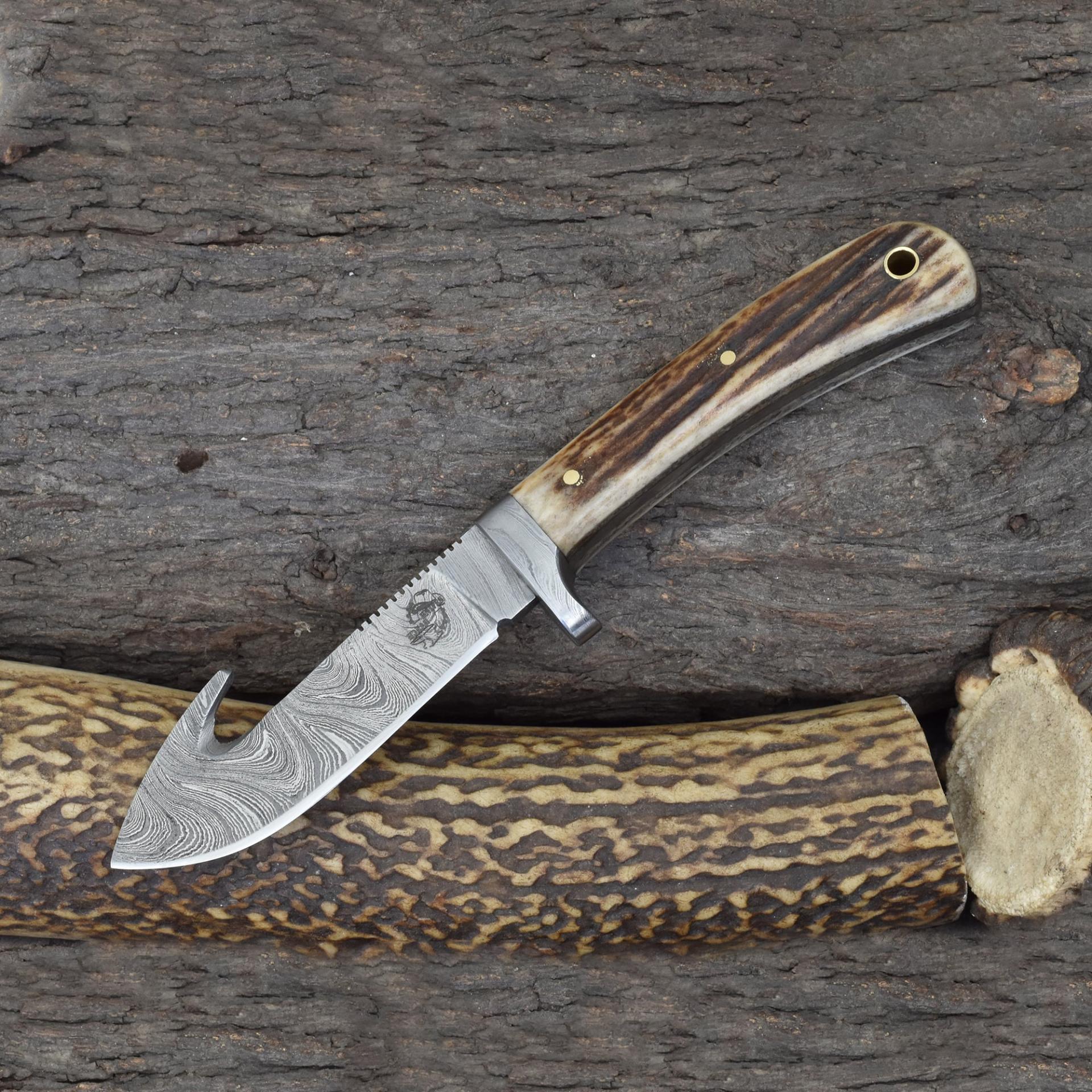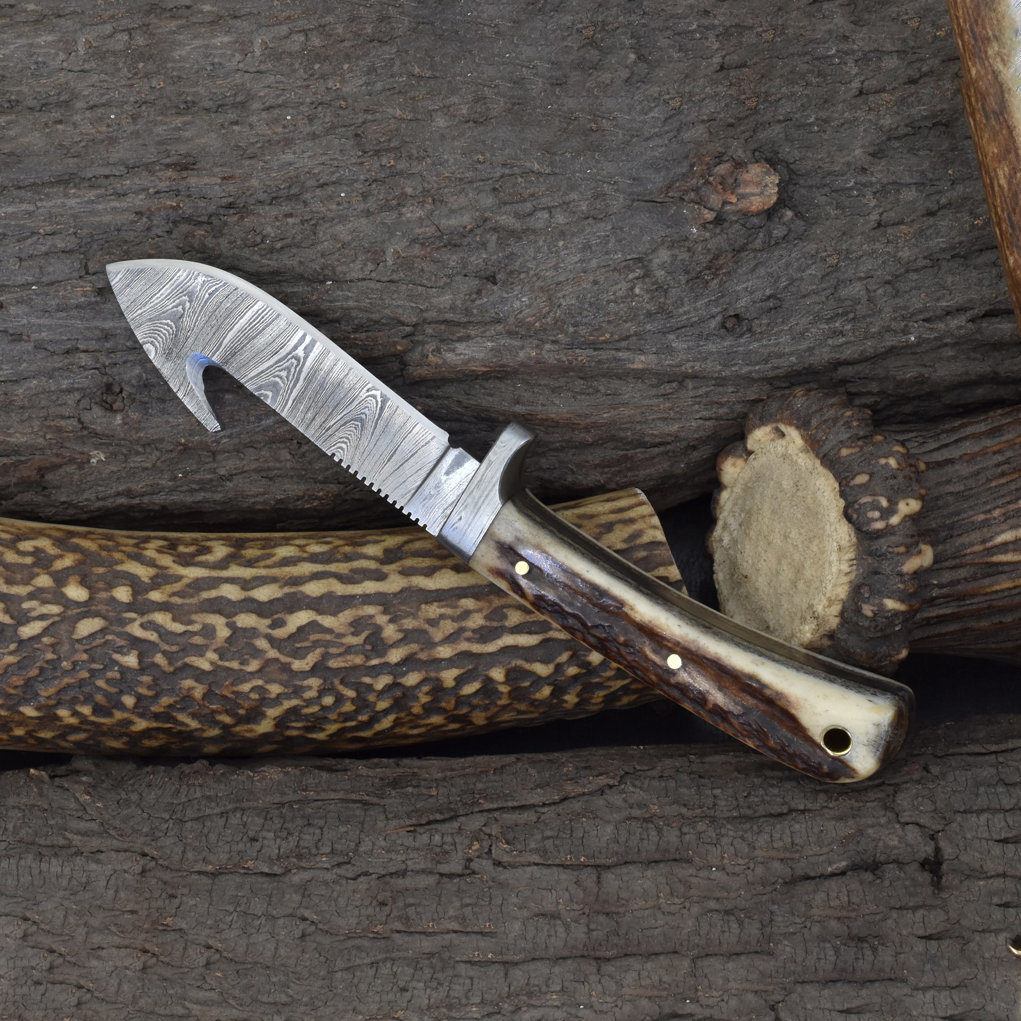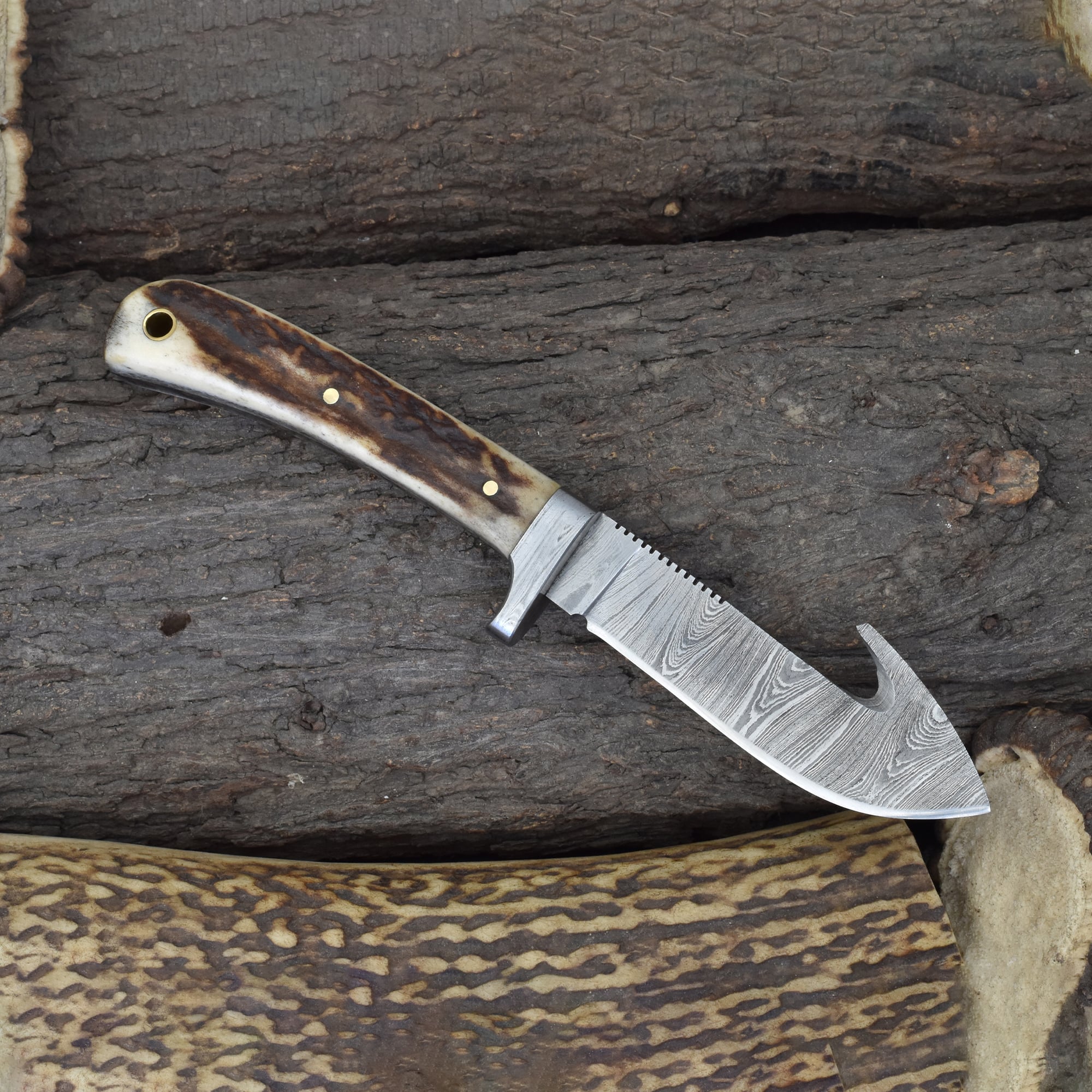 Knives Ranch Premium Damascus Gut Hook Knife with Stag Handle