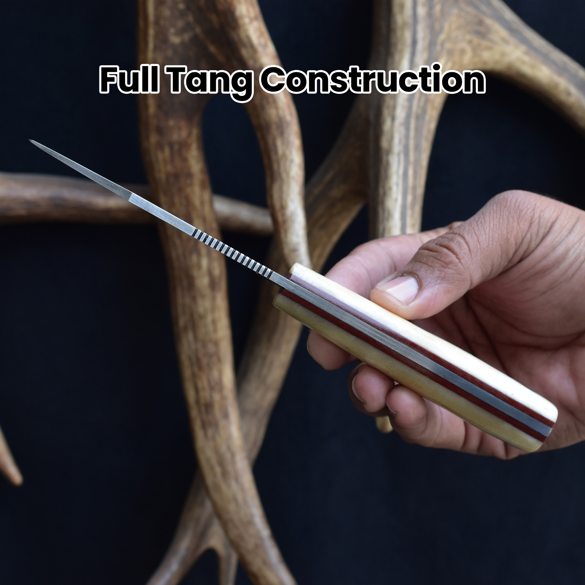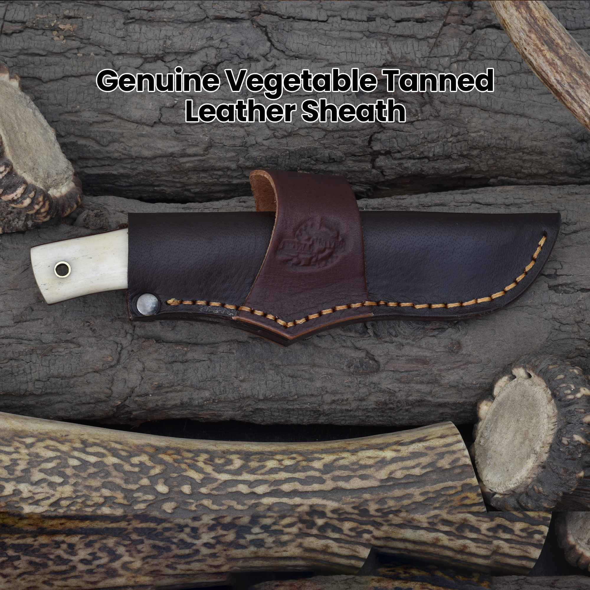 The bone handle, reinforced with a fiber liner, offers a secure and comfortable grip while showcasing a classic, timeless style. Paired with a heavy-duty Vegetable Tanned Leather sheath that allows both vertical and horizontal carry, this knife is designed to be as versatile as it is durable. A true blend of craftsmanship and practicality, perfect for hunters, outdoorsmen, and collectors.