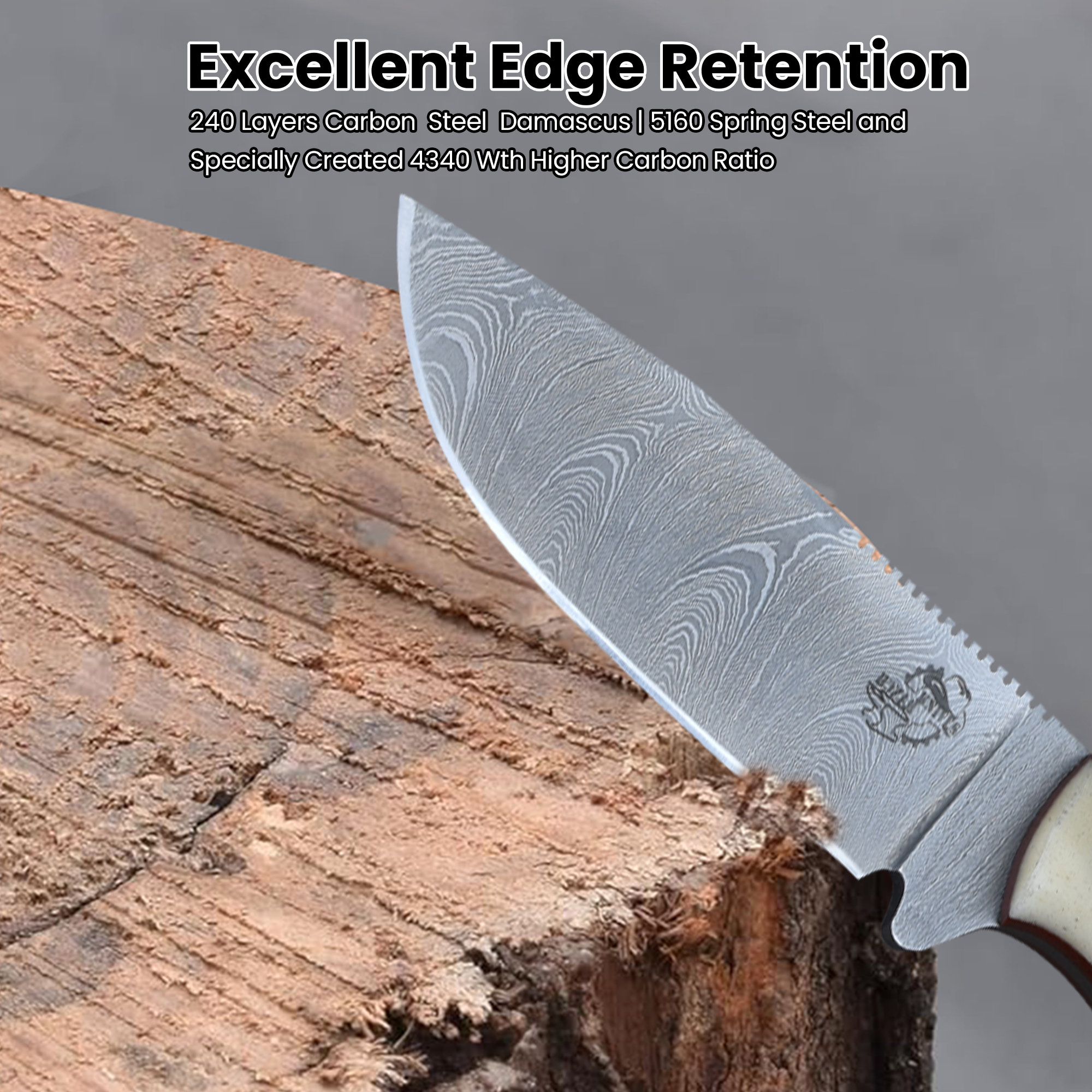 Crafted for performance and elegance, this Knives Ranch hunting knife features our Signature 240-layer Damascus steel, forged from 5160 steel for superior strength, edge retention, and eye-catching patterns. Measuring 8" overall with a 3-3/4" blade and a 3-1/2" cutting edge, it delivers precision and reliability in the field.
