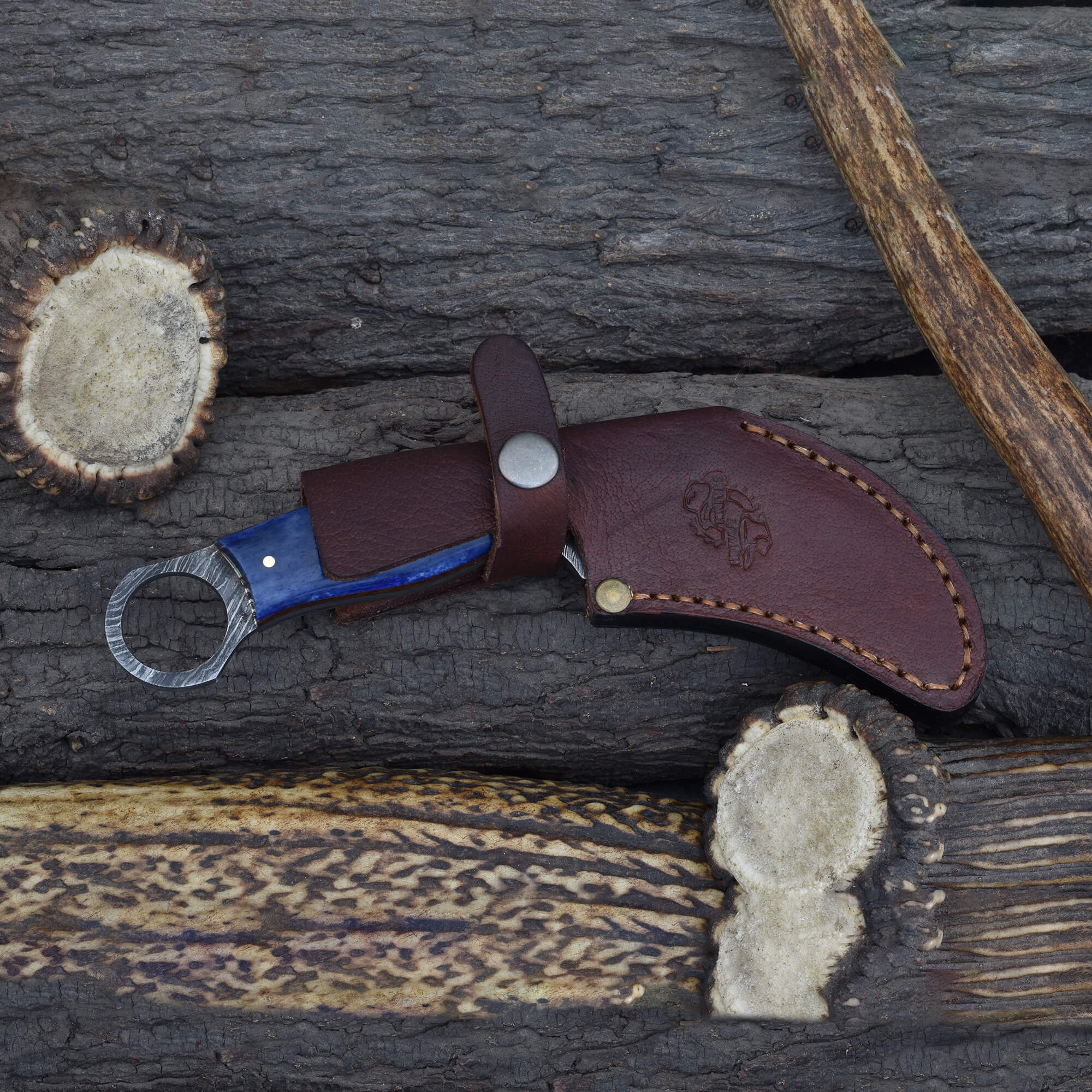 Step up your hunting game with the Knives Ranch Damascus Tactical Knife, crafted for sharpness and durability. This Damascus steel blade features a cutting edge that offers precision and excellent edge retention for Tactical and outdoor tasks. The blue colored cattle bone handle with fiber liner provides a comfortable and secure grip, making every cut confident and controlled. The knife comes with a durable Vegetable Tanned Leather sheath equipped with a vertical belt loop for easy carry.