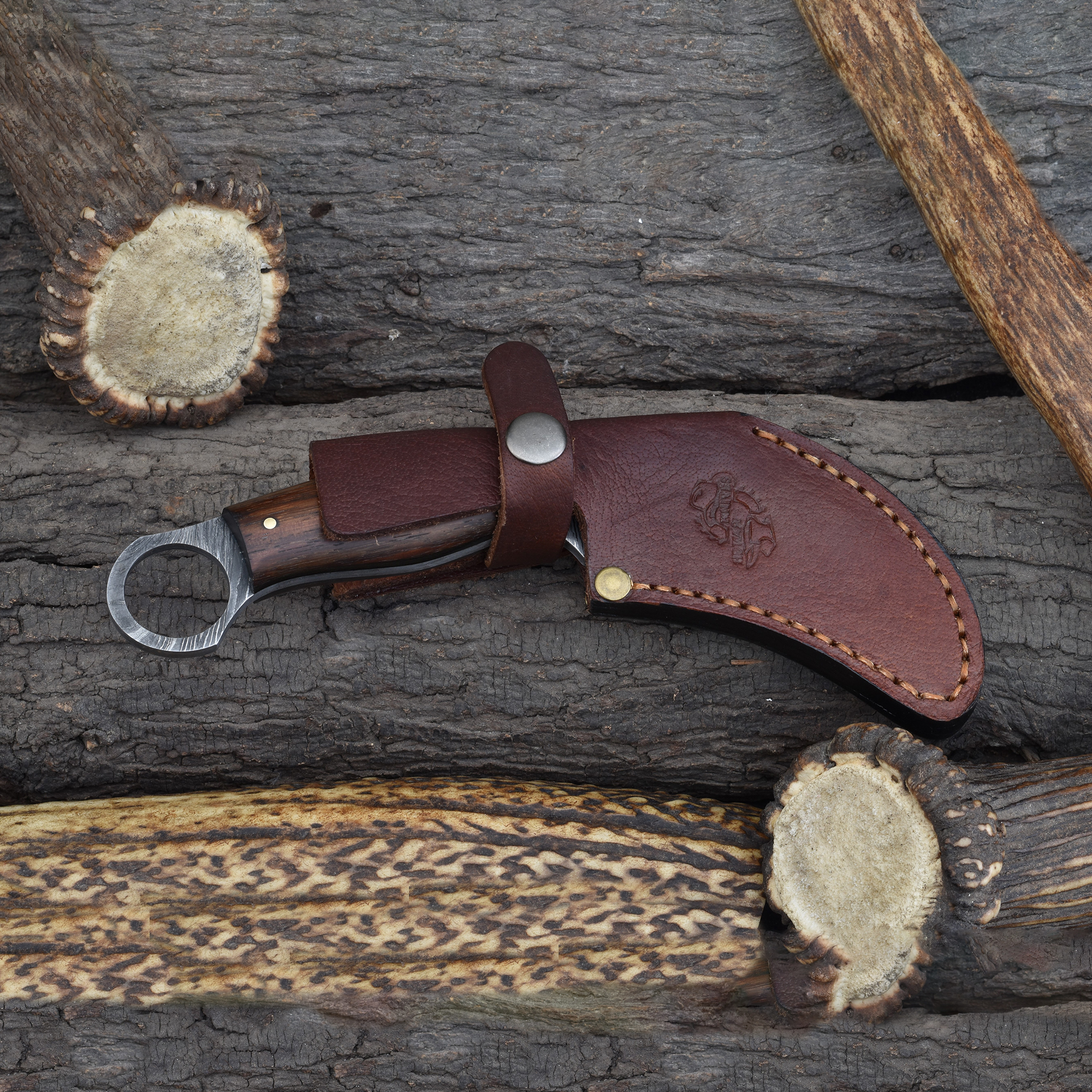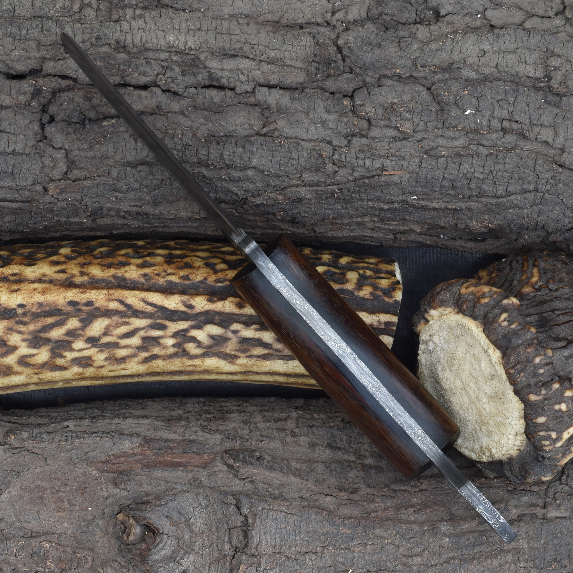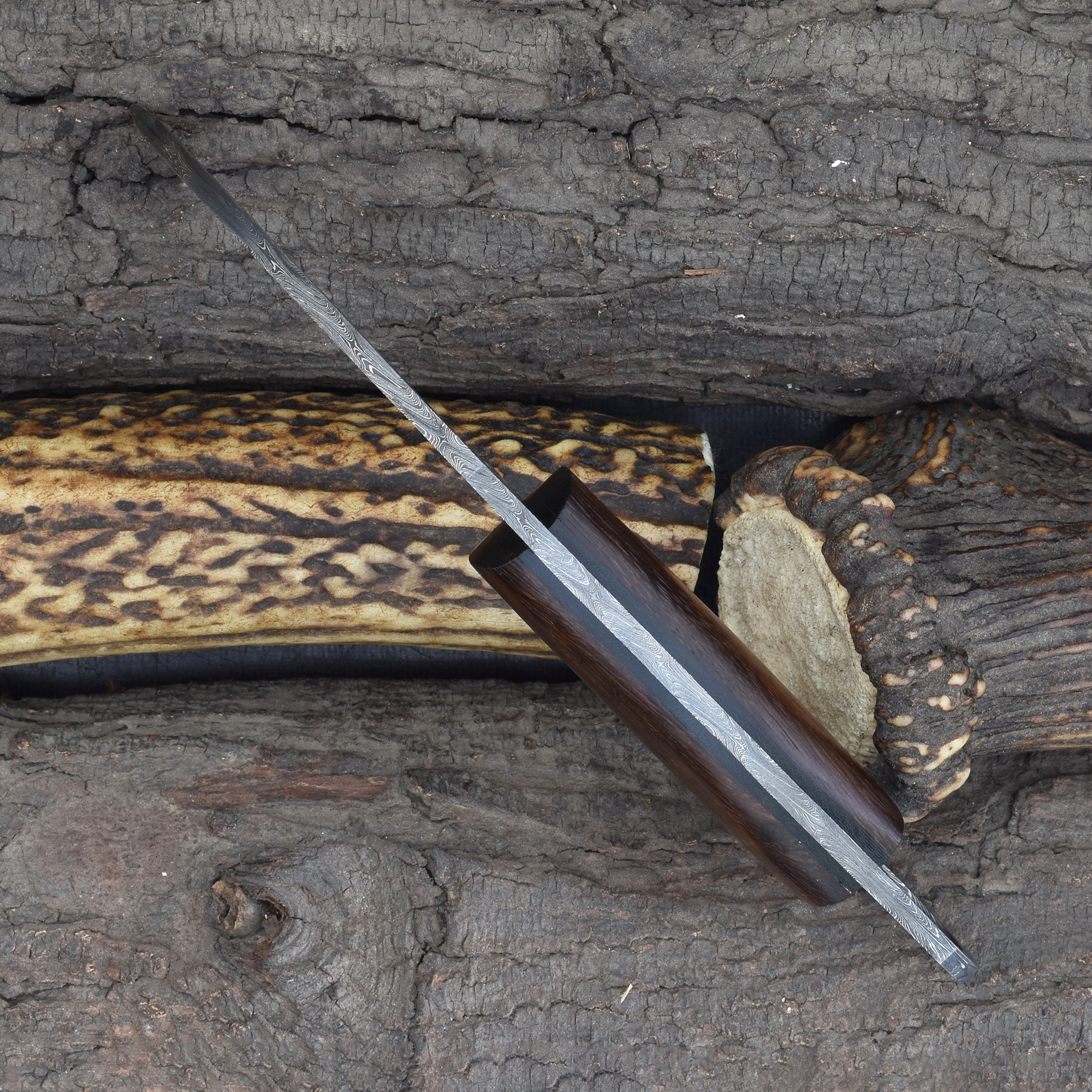Enhance your hunting gear with the Knives Ranch Damascus Tactical Knife, crafted for precision and durability. Featuring a Damascus steel blade with a cutting edge, this knife delivers excellent sharpness and edge retention for effective Tactical and outdoor use. The stabilized rosewood handle with fiber liner offers a secure, comfortable grip, ensuring control during demanding tasks. The knife includes a Vegetable Tanned Leather sheath with a vertical belt loop for convenient carry.
