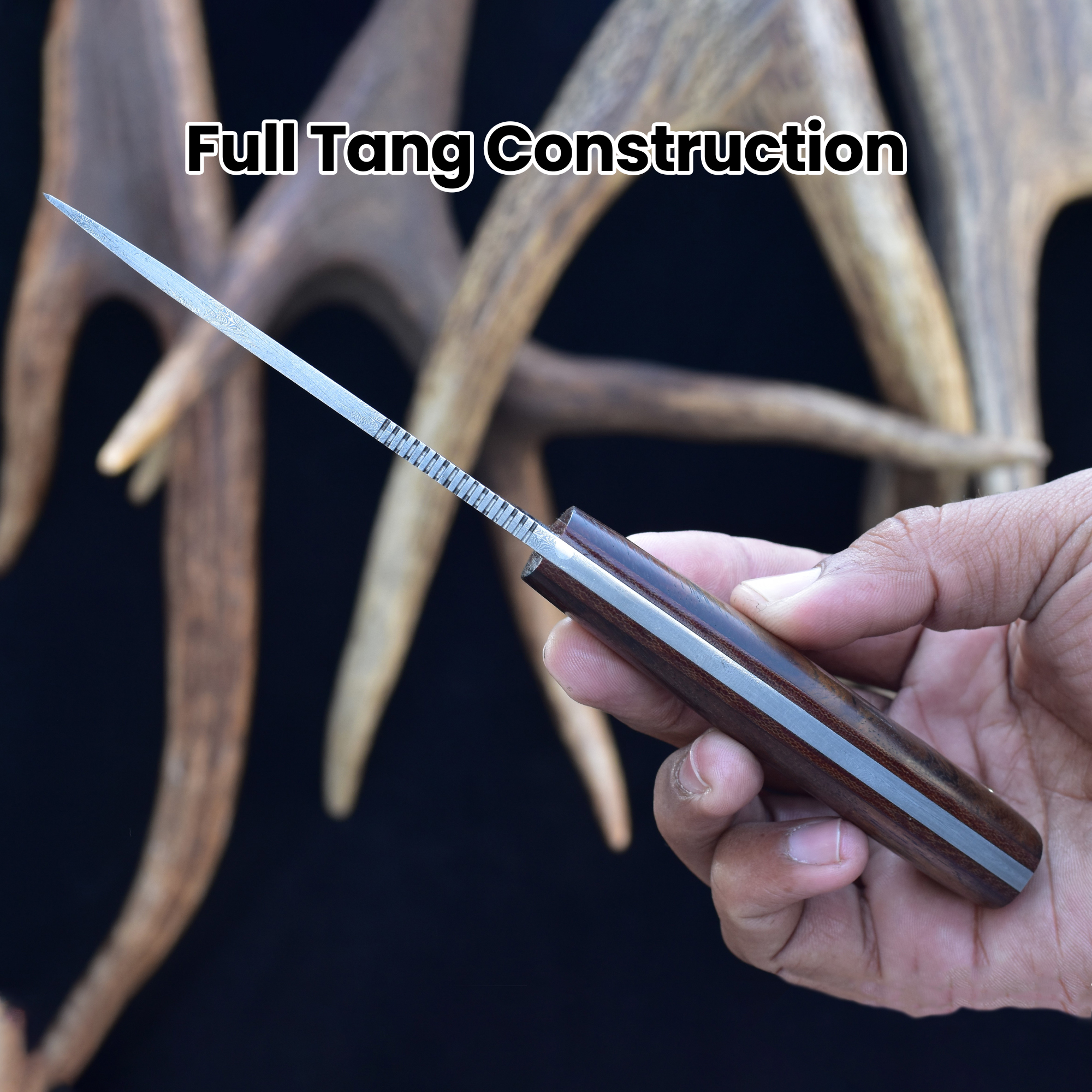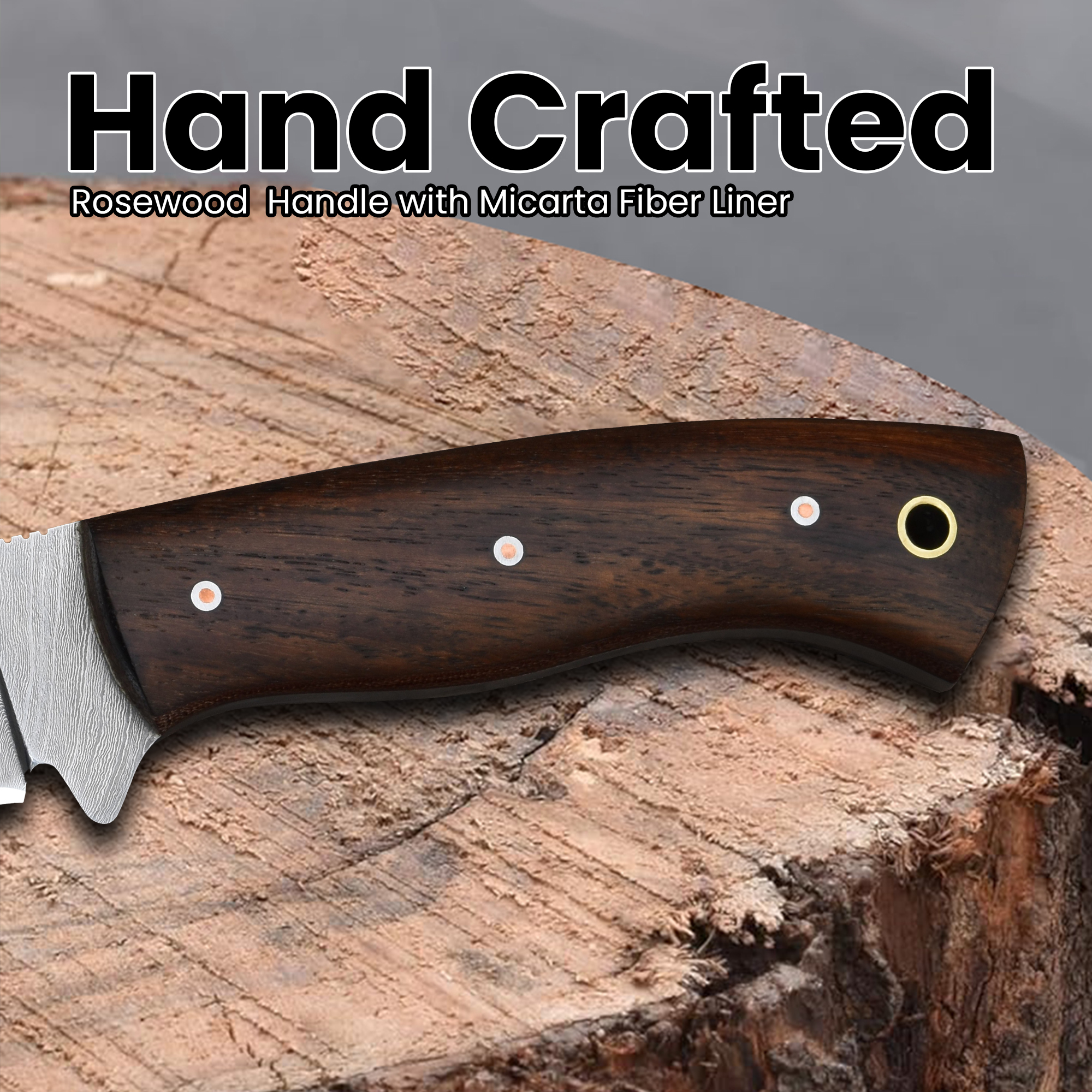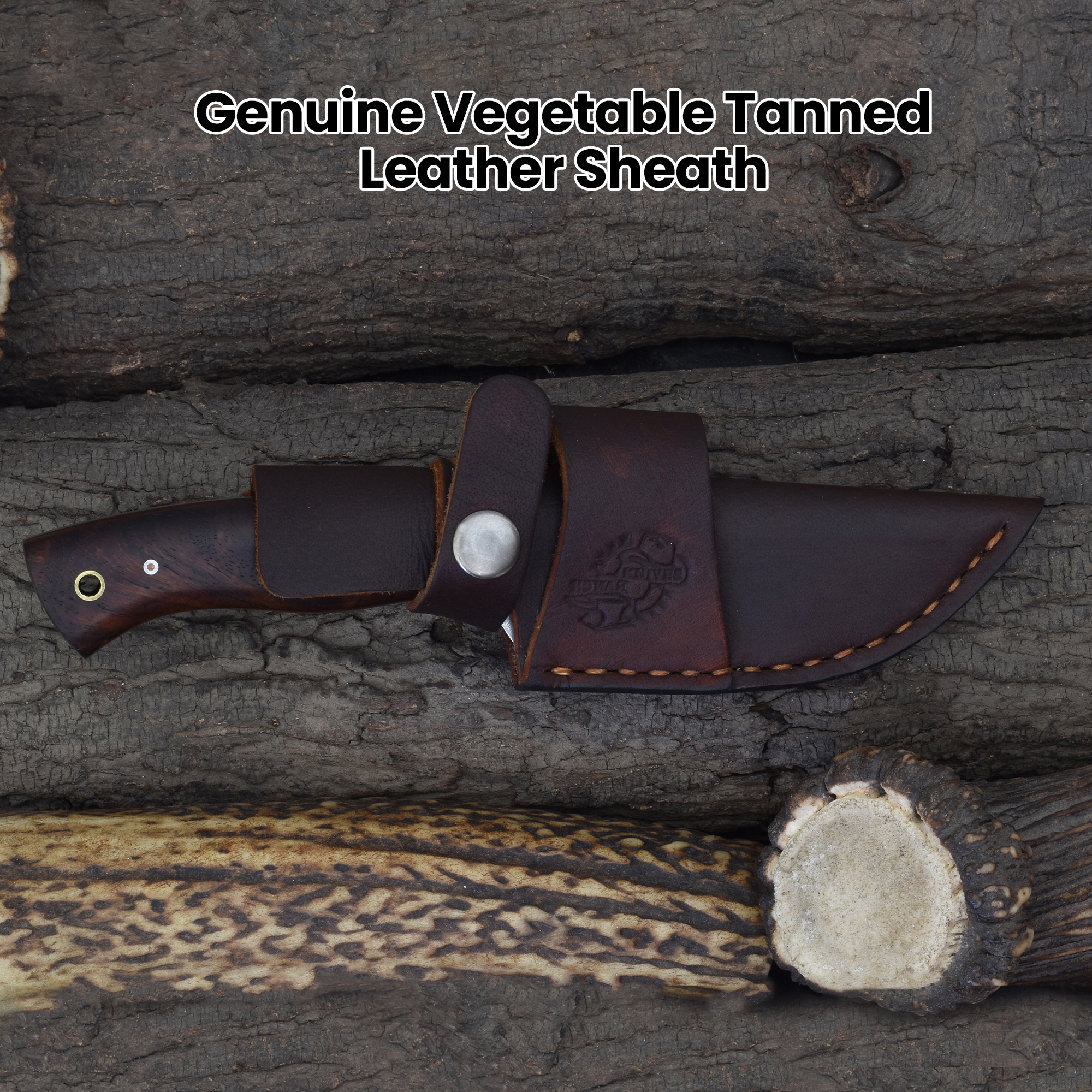 Master your outdoor tasks with the Knives Ranch Damascus Bushcraft Knife, featuring a 4" blade forged from premium Damascus steel. This knife offers outstanding sharpness, durability, and edge retention, perfect for bushcraft, carving, and survival activities. The rosewood handle with fiber liner ensures a comfortable and secure grip, while the Vegetable Tanned Leather sheath with horizontal and vertical belt loops provides easy, versatile carry on your adventures.